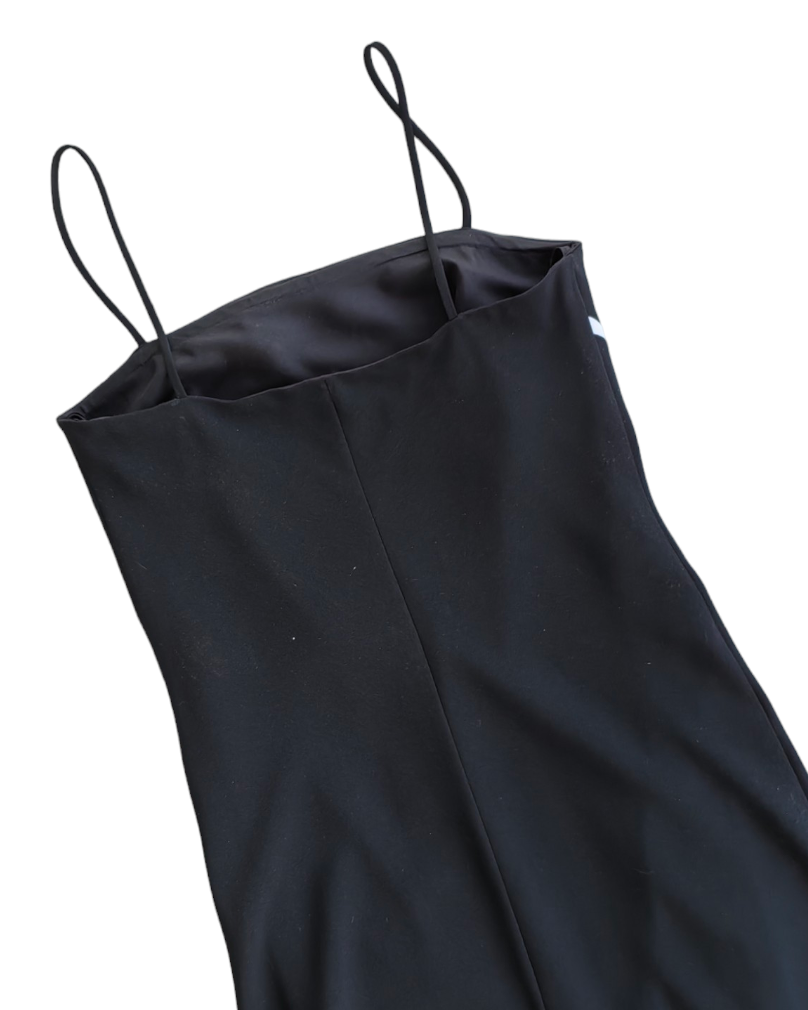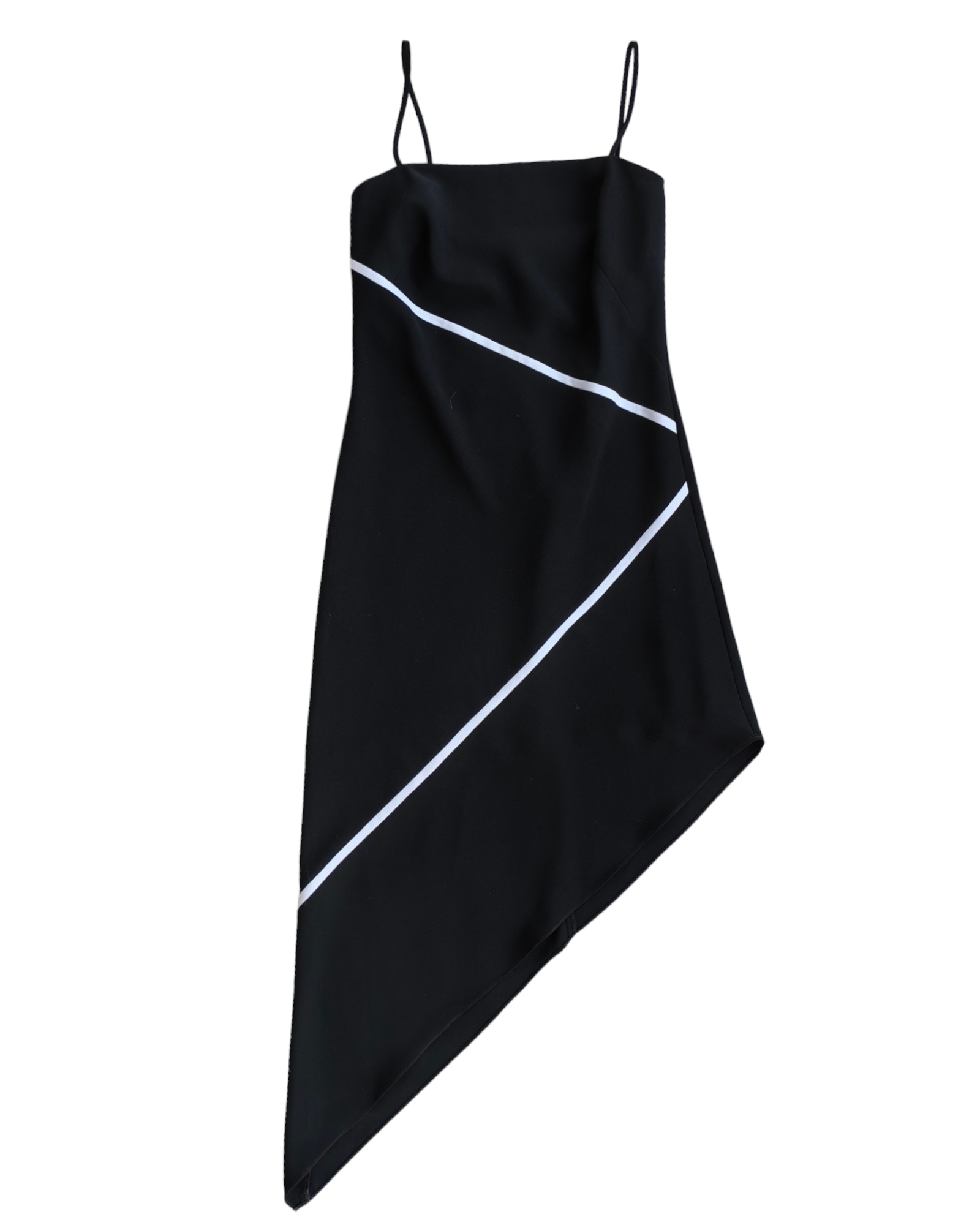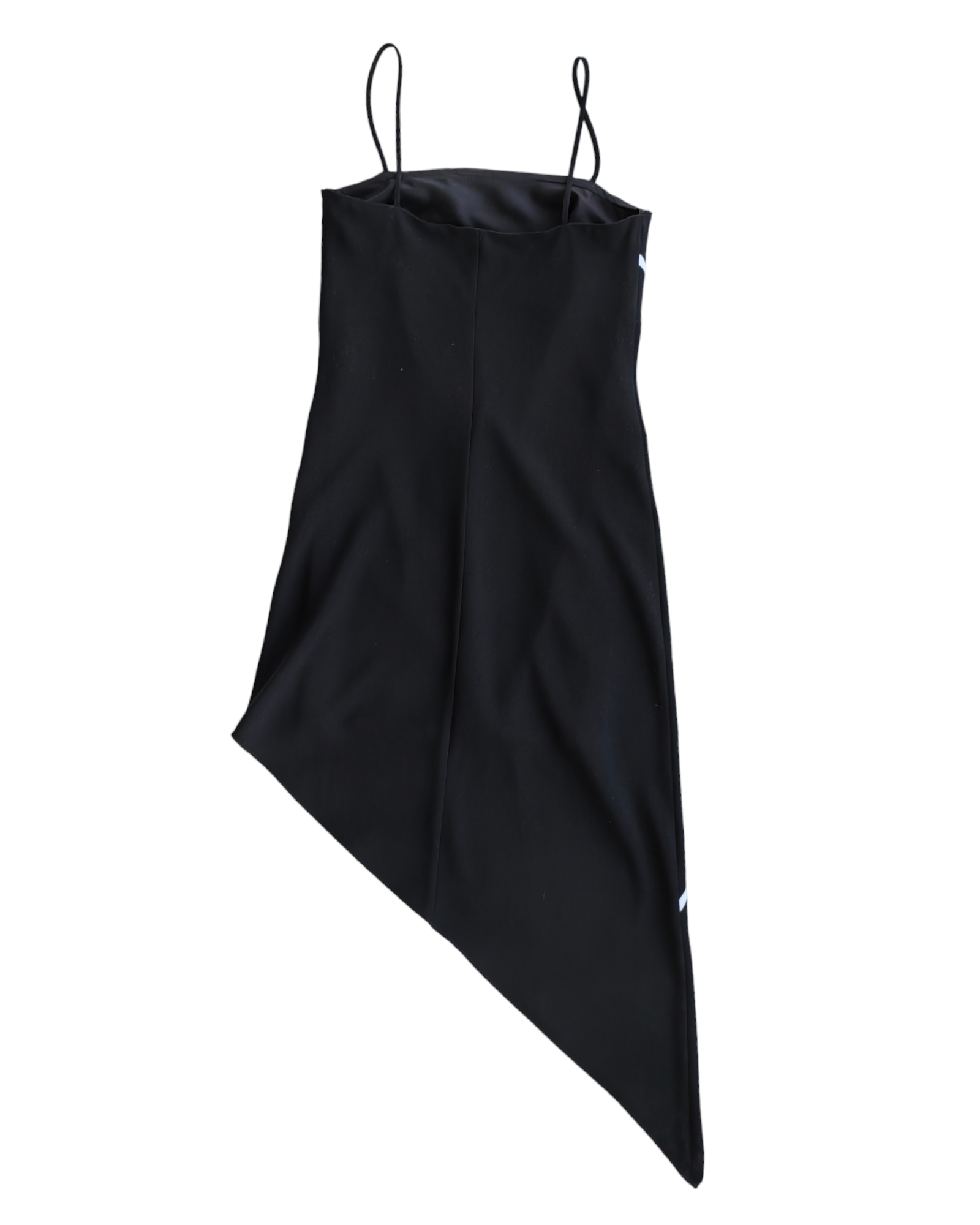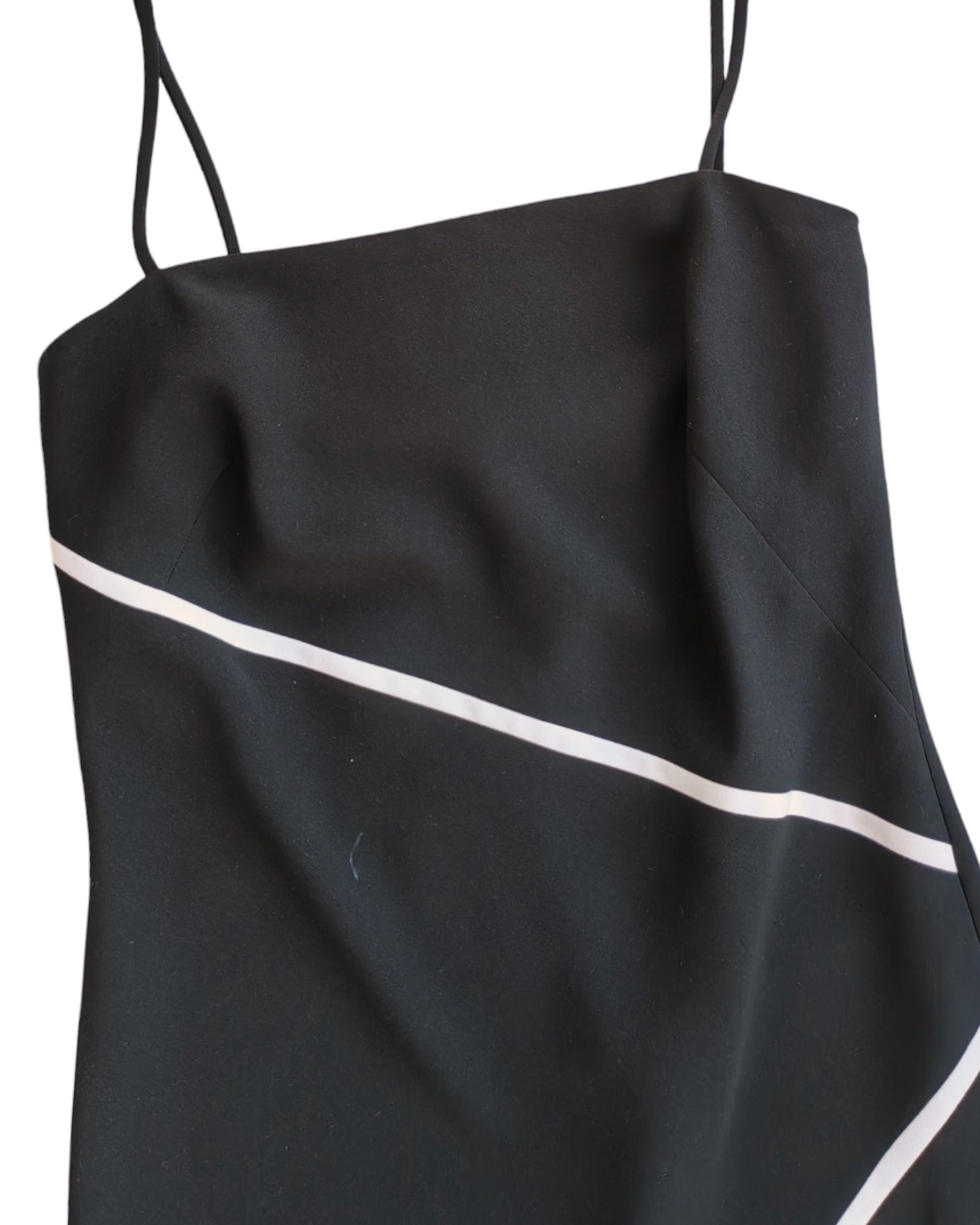 VESTIDO 100% POLIÉSTER DE COLOR NEGRO DE TIRANTES, CORTE ASIMÉTRICO CON DOS LÍNEAS BLANCAS DIAGONALES. FORRO NEGRO. PARA LAVADO EN SECO. SIN DETALLES DE USO.