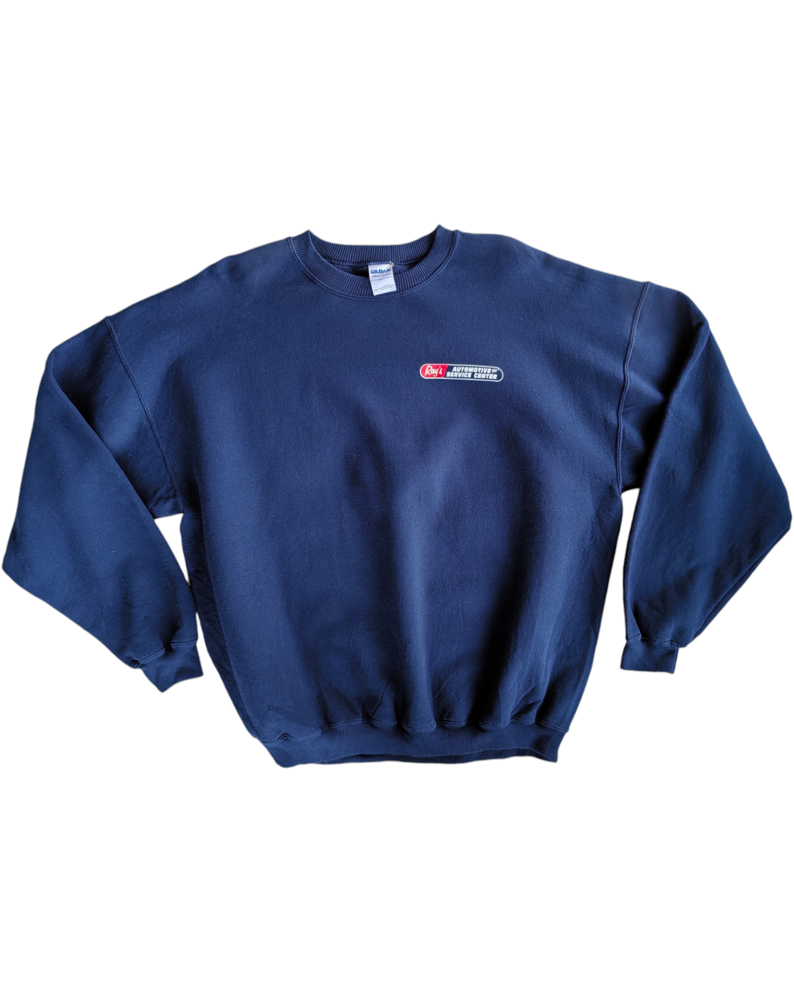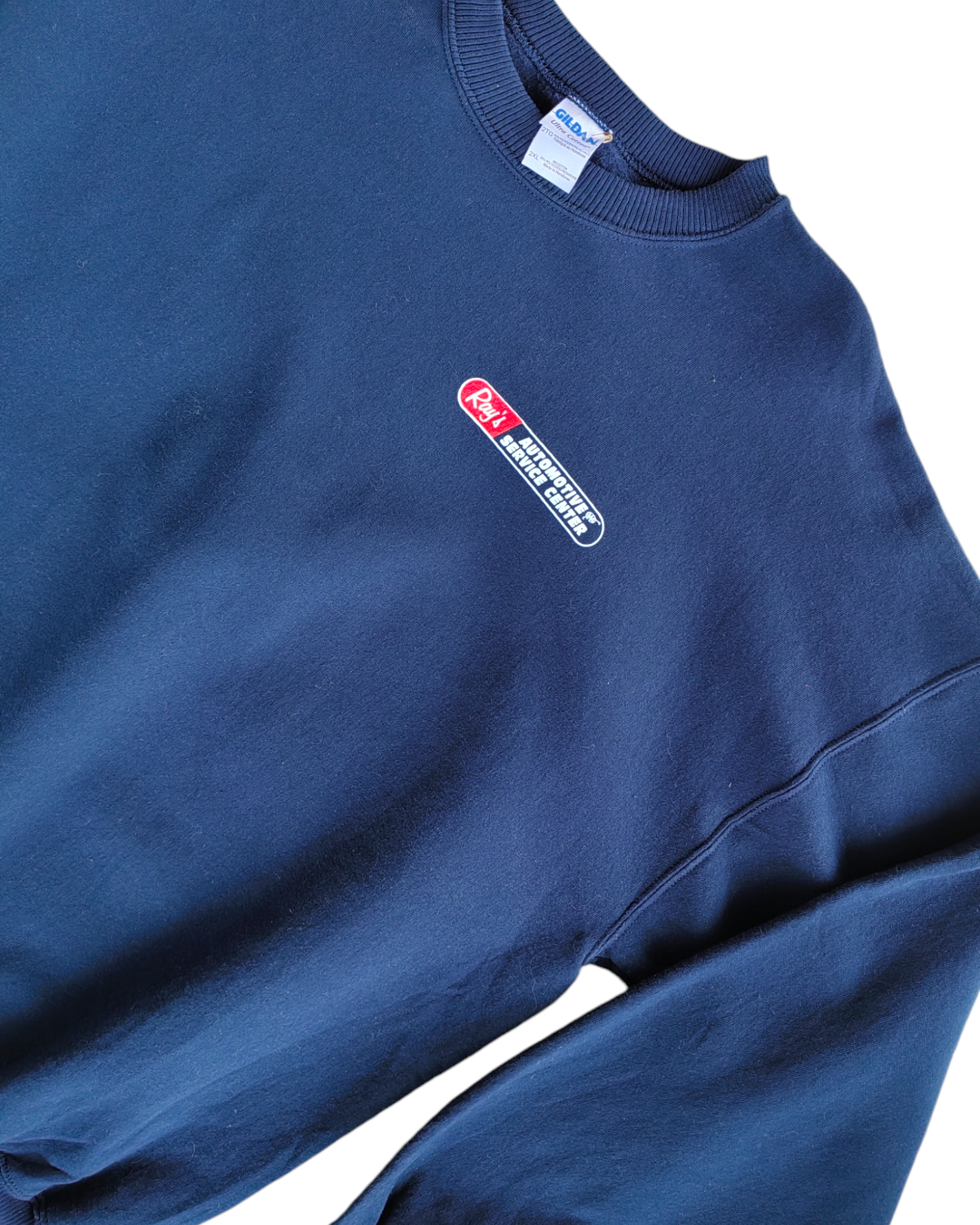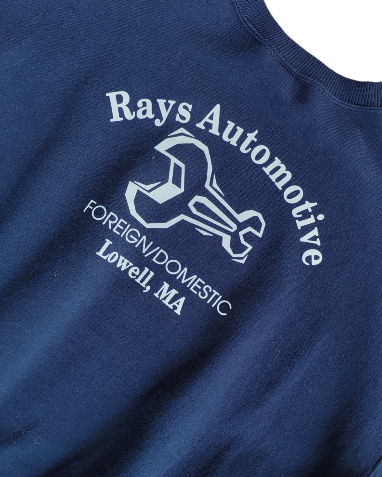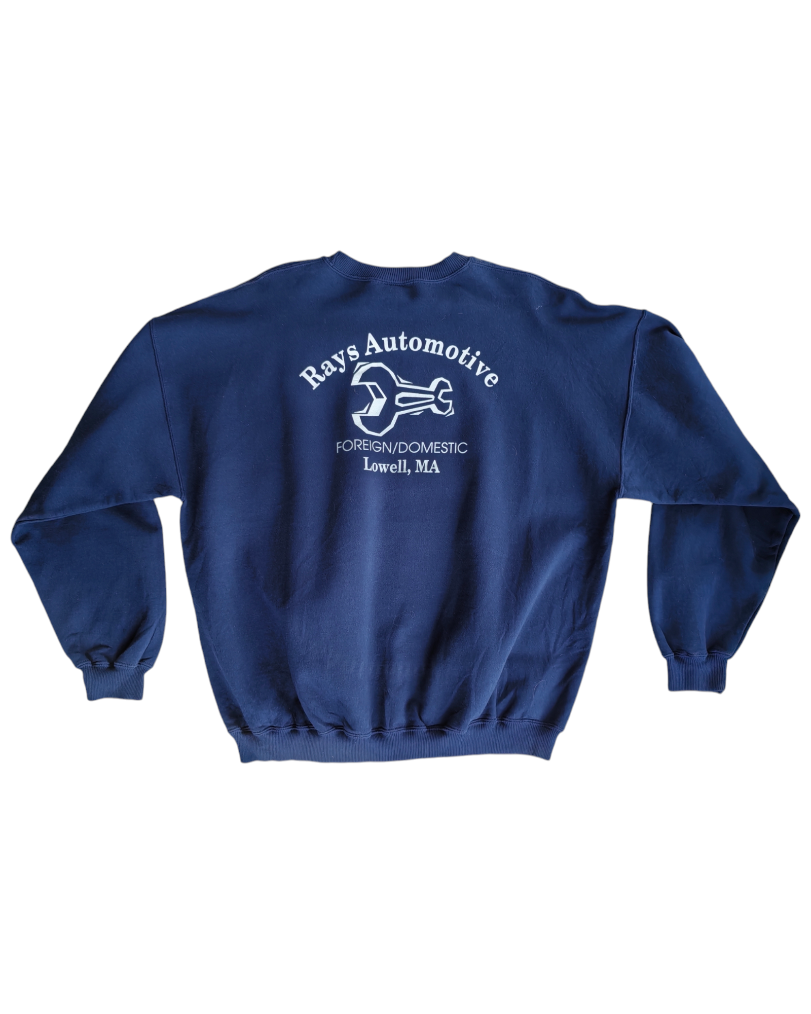 SUDADERA COLOR AZUL MARINO 80% ALGODÓN 20% POLIÉSTER CON "RAY'S AUTOMOTIVE SERVICE SENTER" SERIGRAFIADO EN ROJO Y BLANCO EN EL PECHO. Y "RAYS AUTOMOTIVE FOREIGN/DOMESTIC LOWELL, MA" Y LA ILUSTRACIÓN DE UNA LLAVE EN LA ESPALDA. SIN DETALLES DE USO.