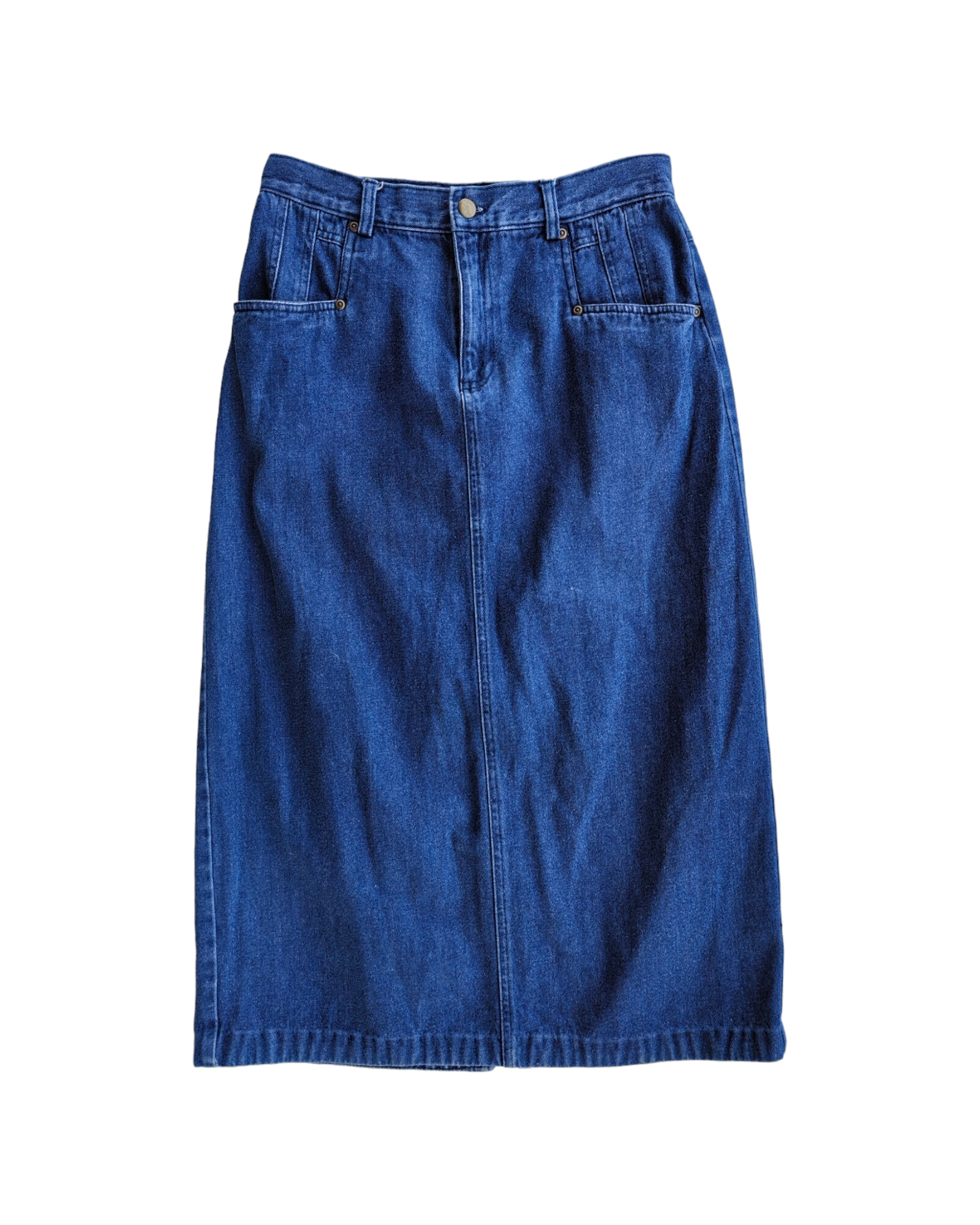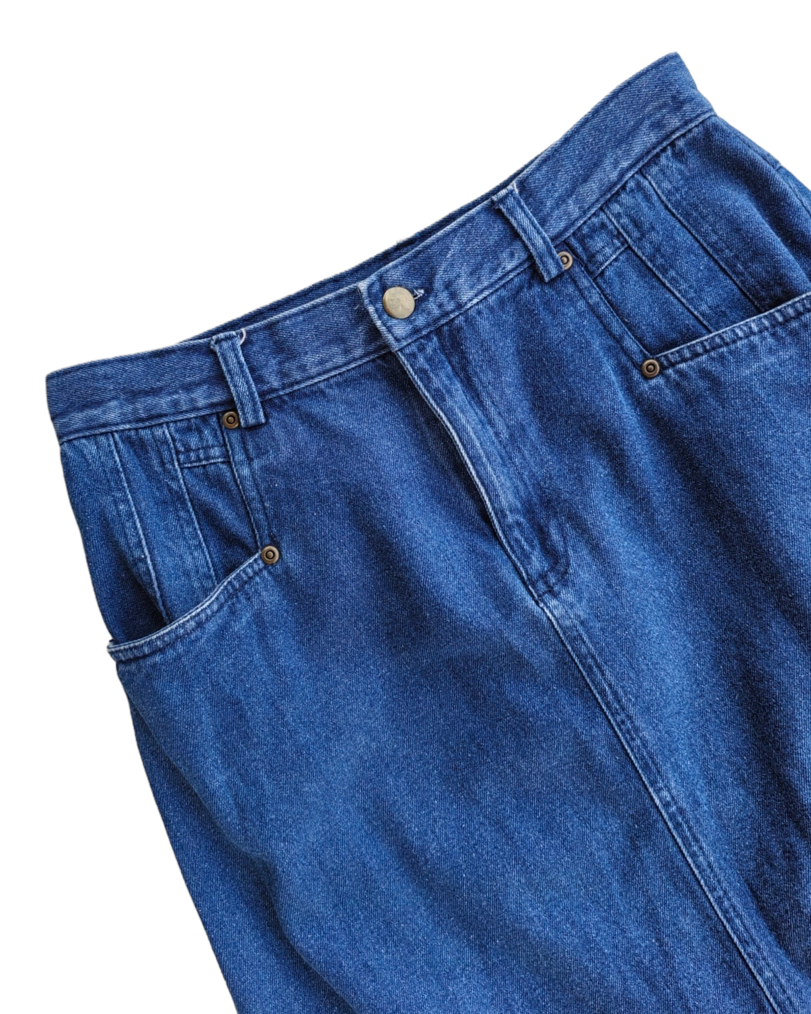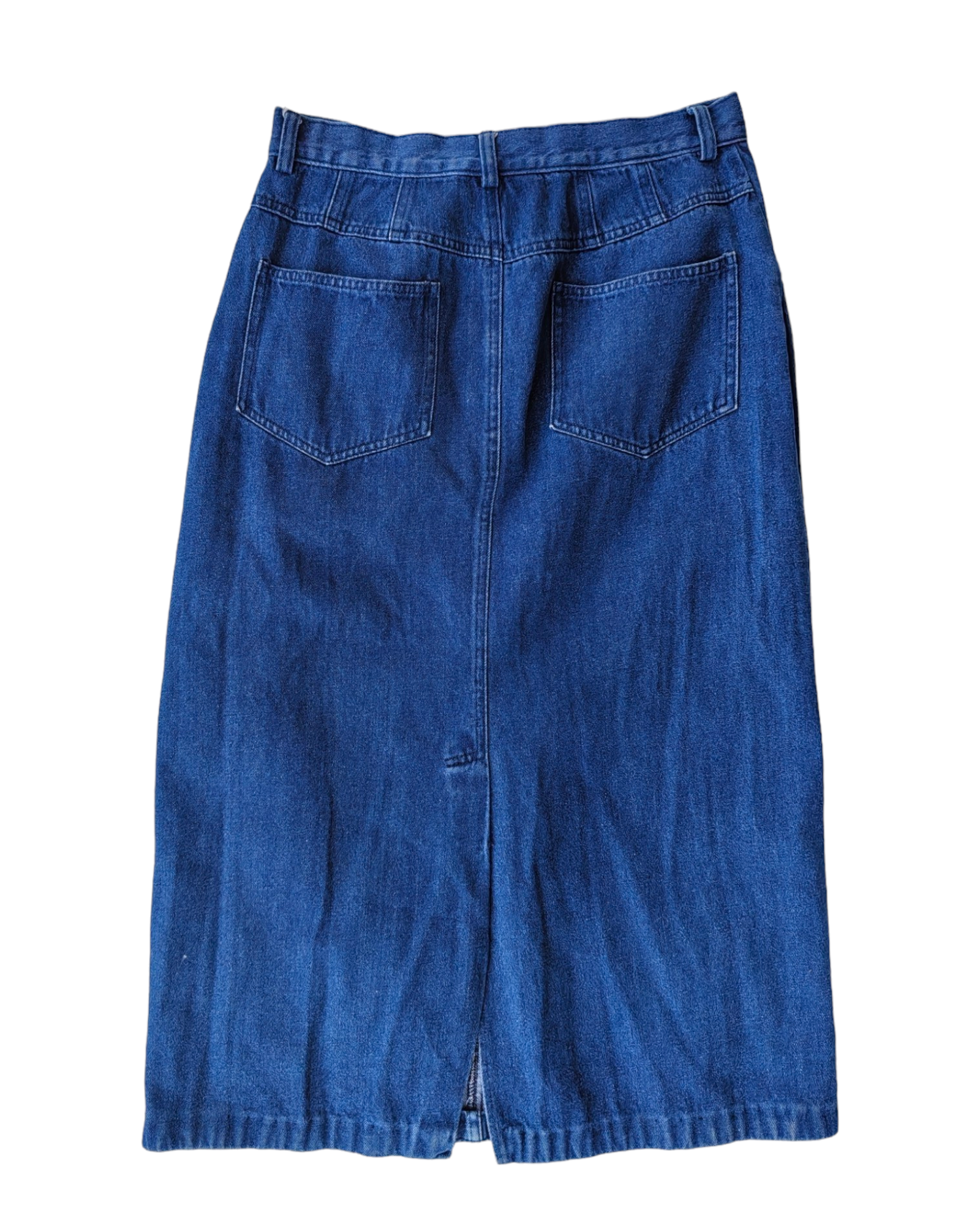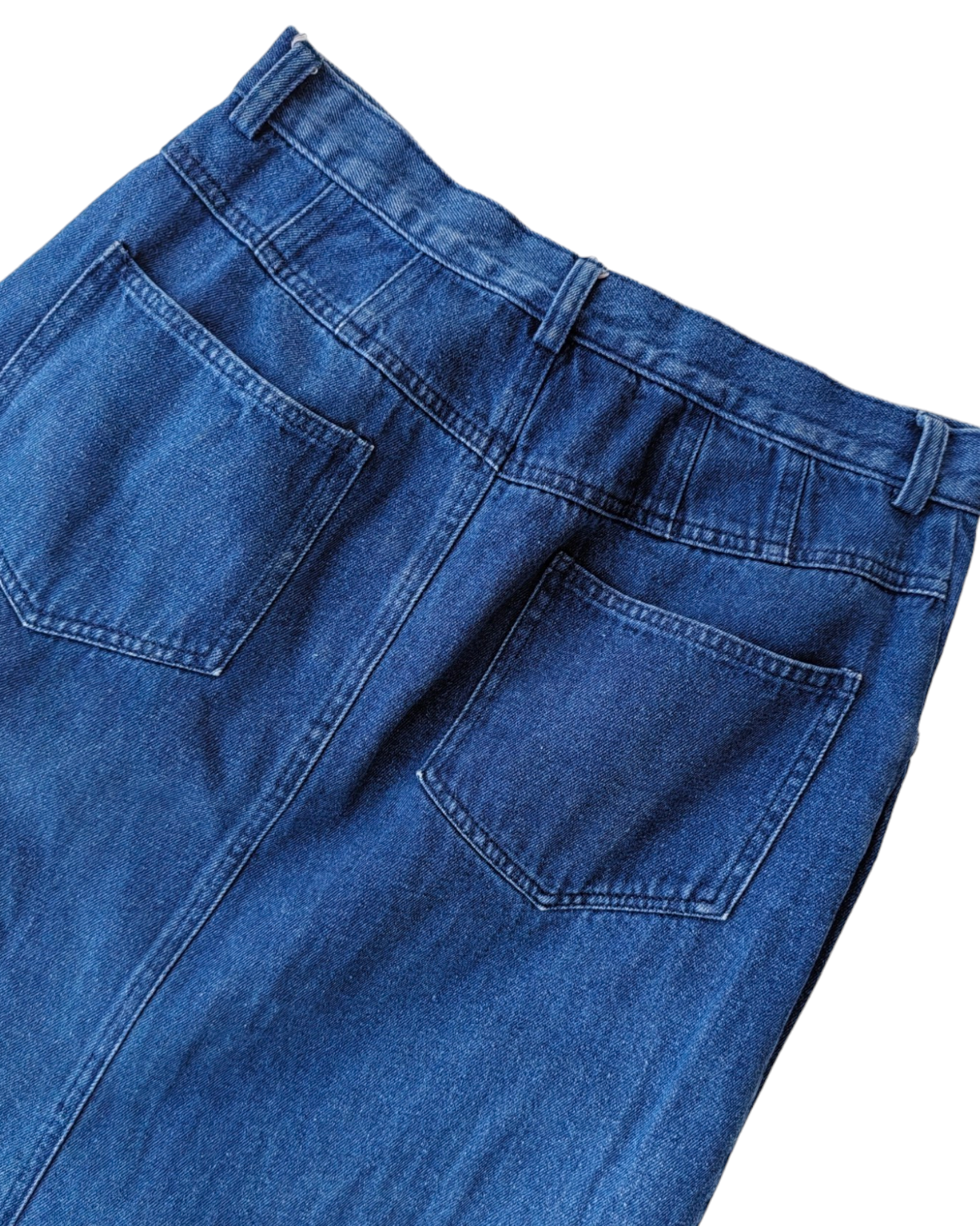 FALDA MAXI DE MEZCLILLA MARCA REAL COMFORT. TALLA 10. 100% ALGODON. DARK WAH. ABERTURA TRASERA. BOLSILLOS LATERALES. SIN DETALLES.