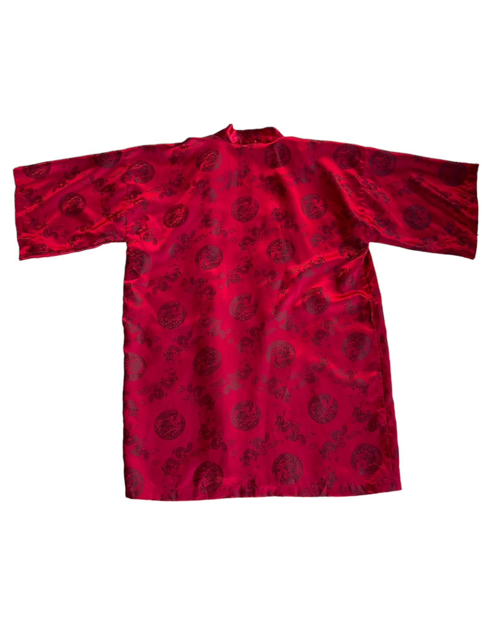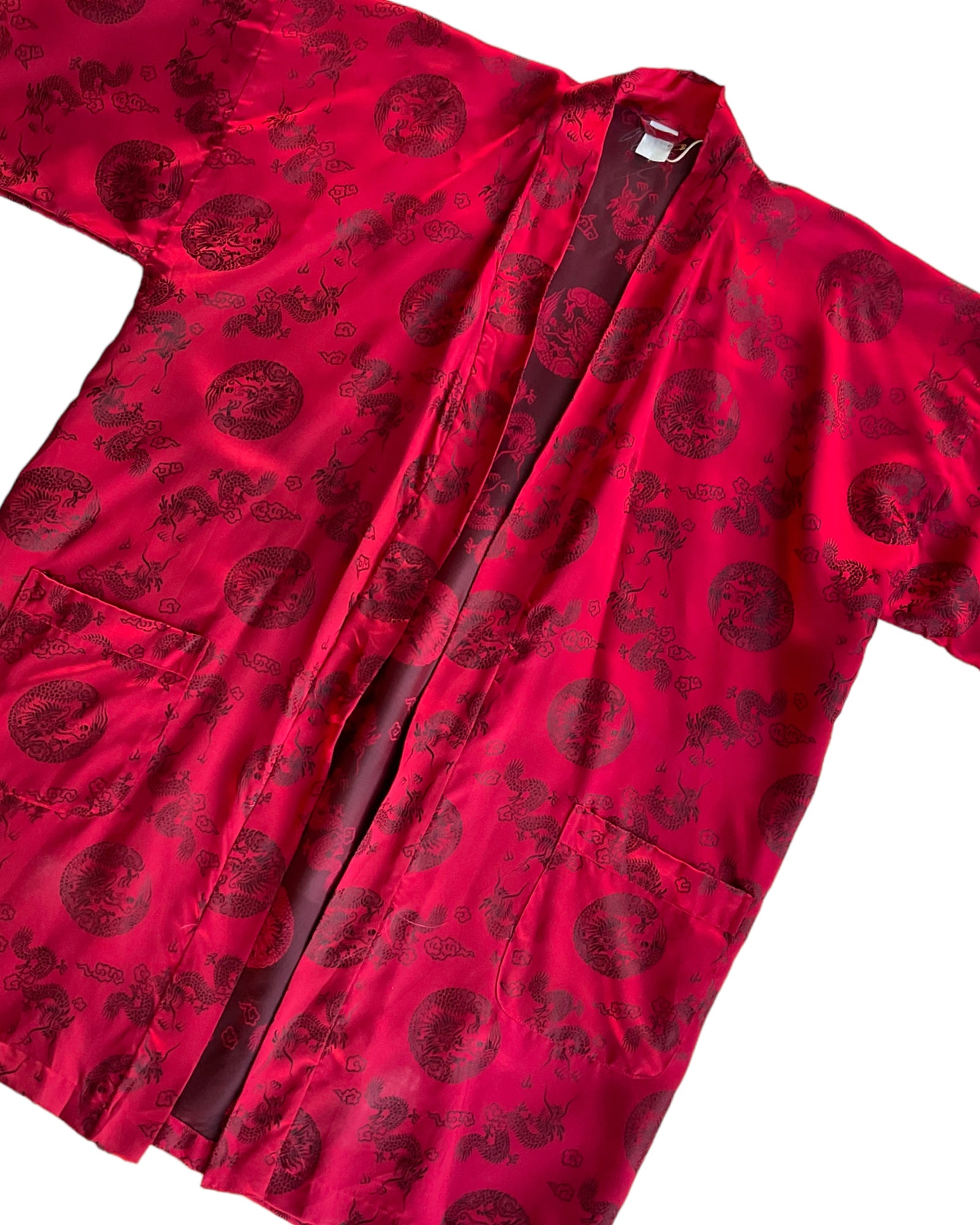 1990S RED KIMONO. PRINT CON DRAGONES NEGROS. BOLSILLOS. SIN DETALLES. RAYON Y POLYESTER.