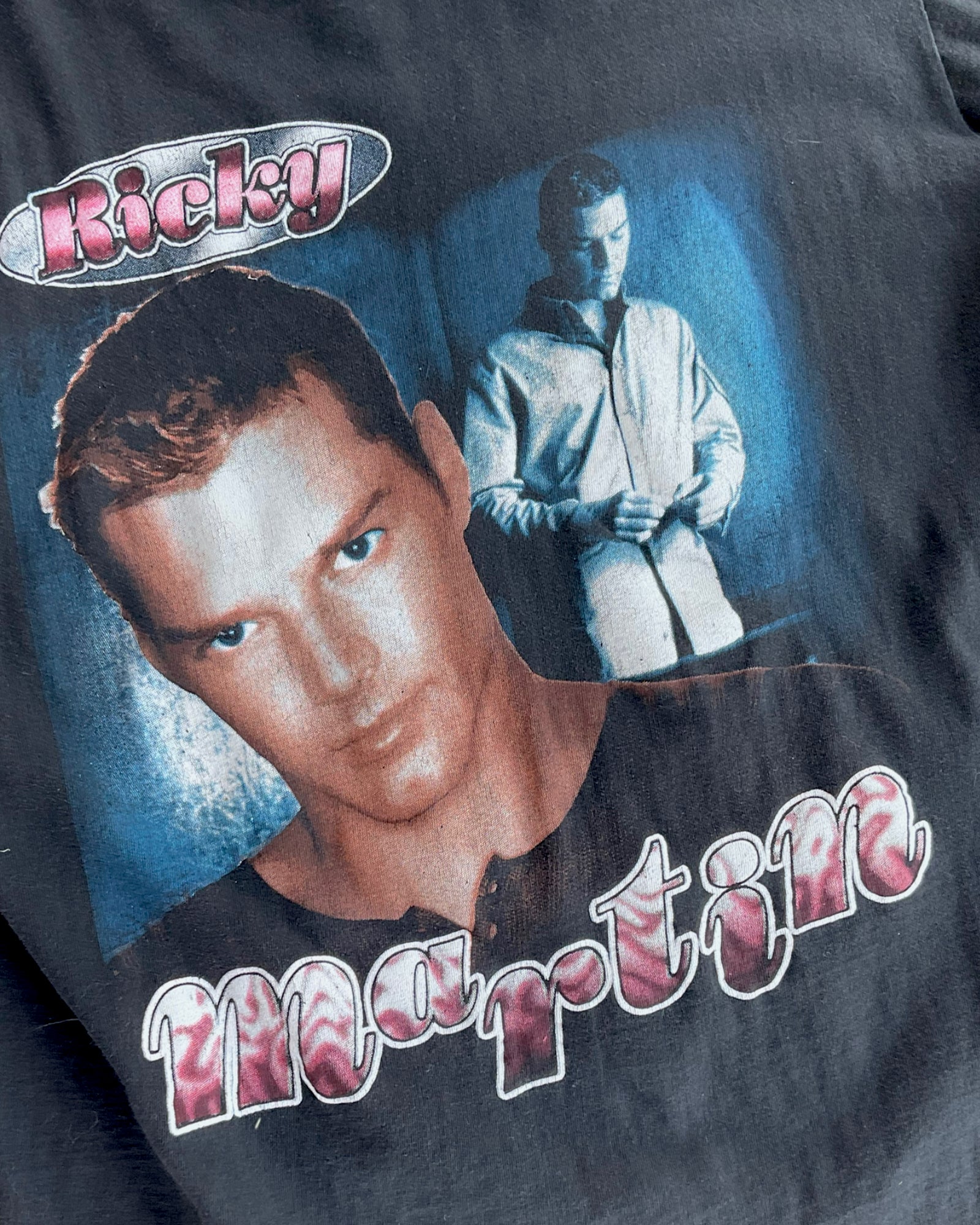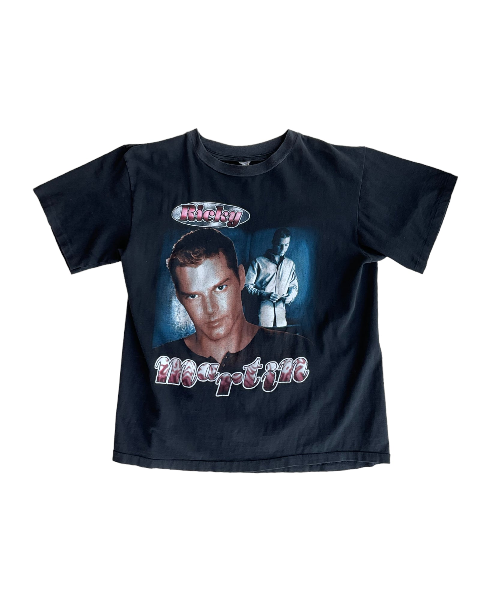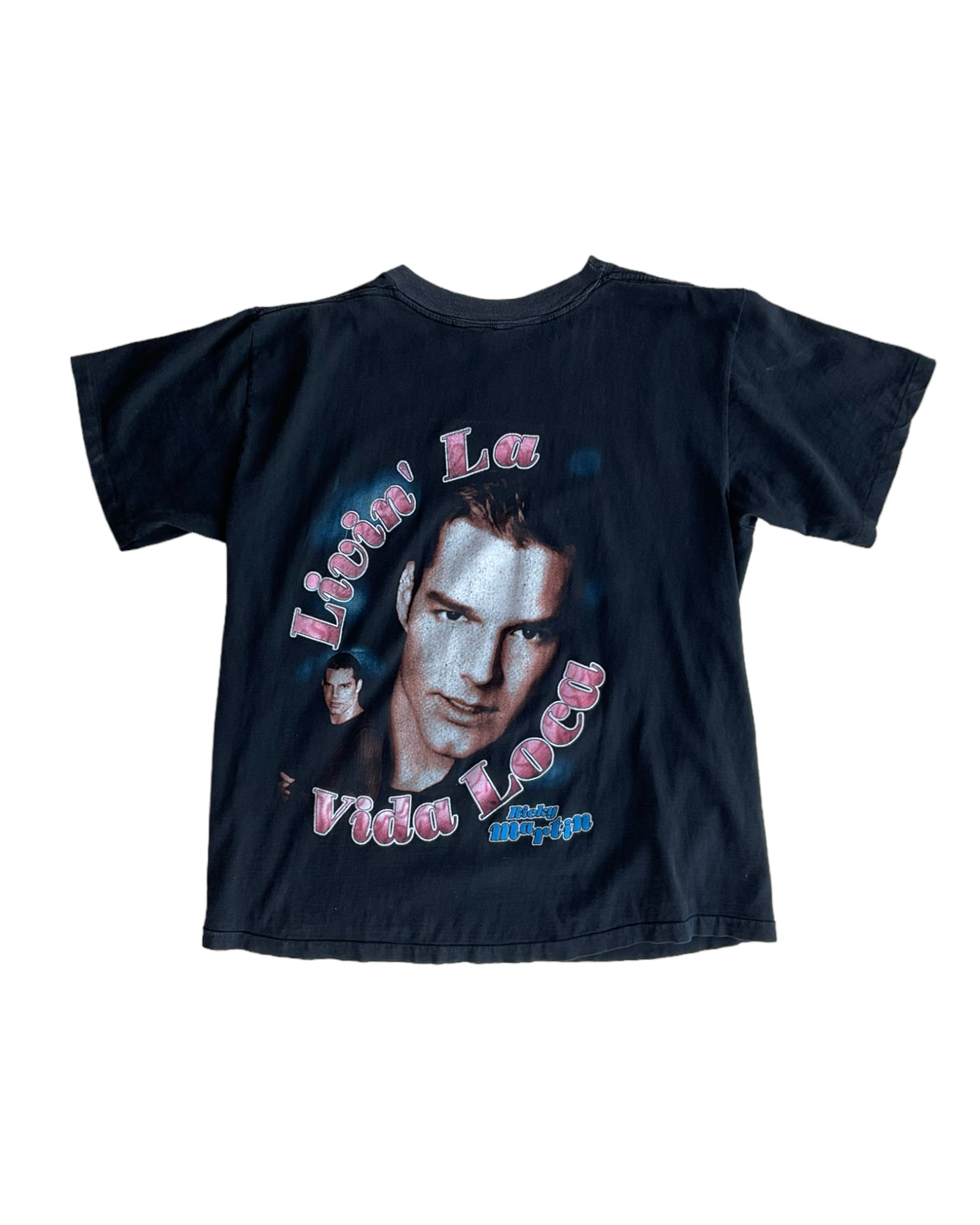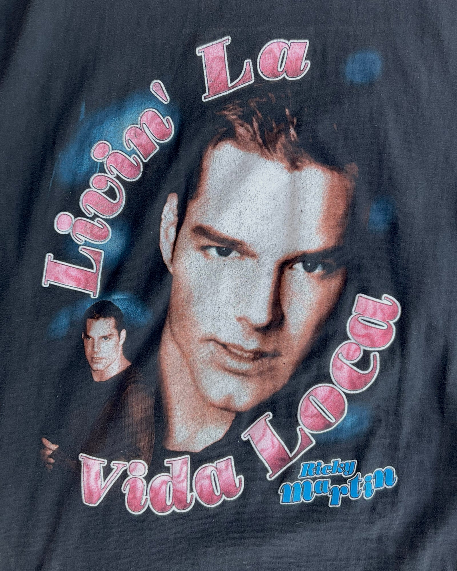 PLAYERA COLOR NEGRO SINGLE-STITCH CON ESTAMPADO CENTRAL DE UNA FOTO DE RICKY MARTIN EN COLOR AZUL Y LETRAS DE SU NOMBRE EN COLOR ROJO; ESTAMPADO DE LA FOTO DE RICKY MARTIN Y LETRAS DE LIVIN' LA VIDA LOCA EN LA ESPALDA.