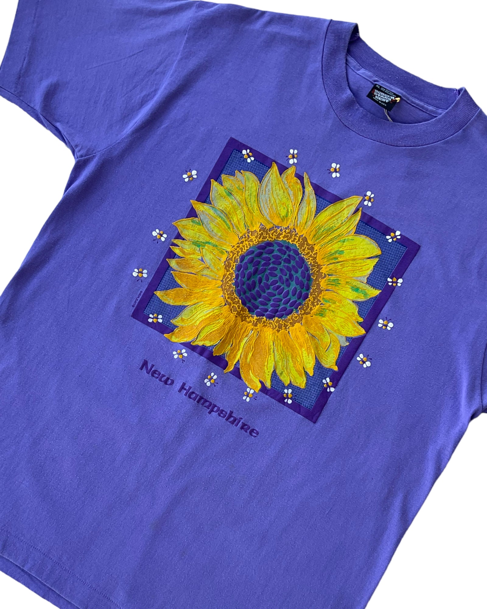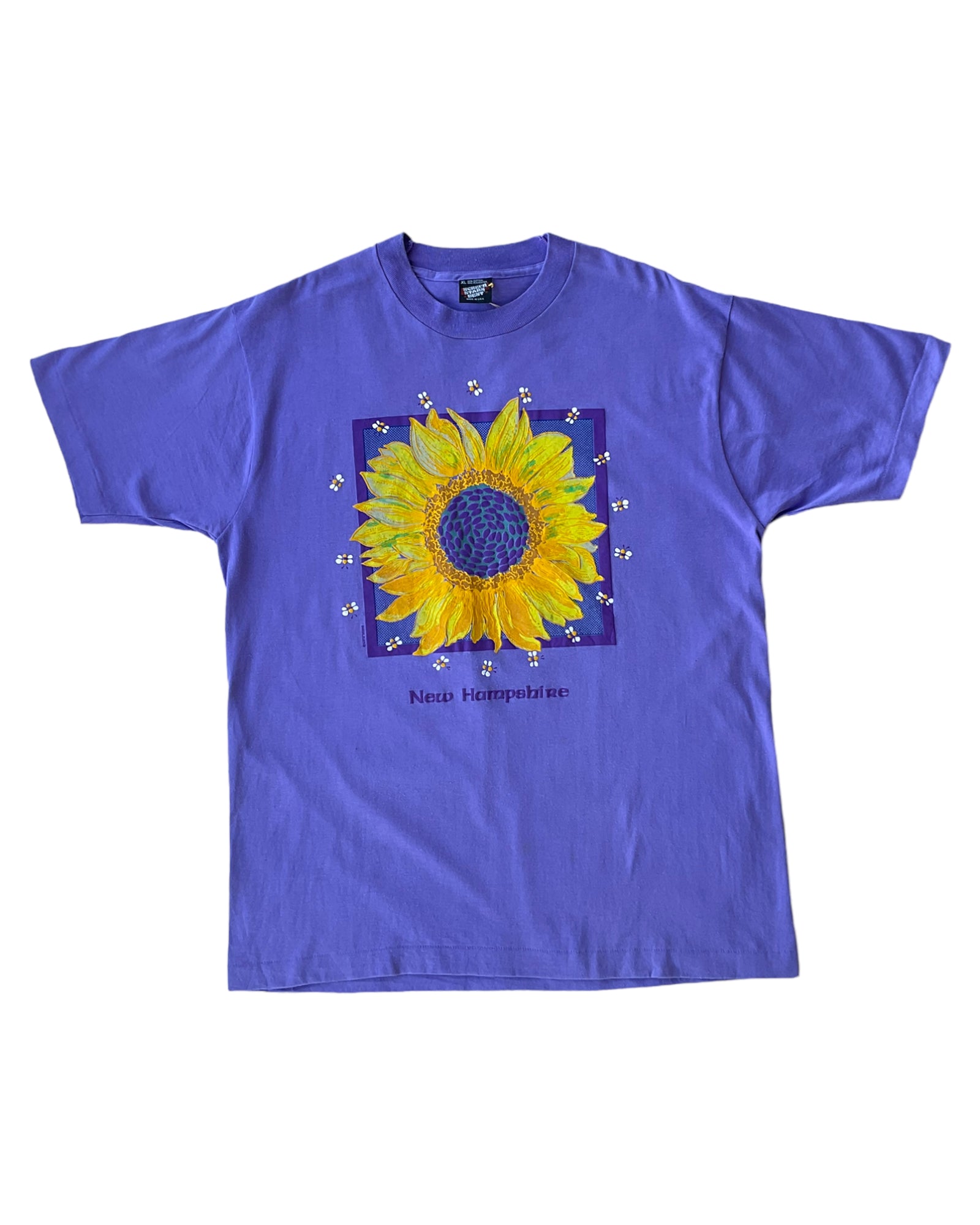 CAMISETA COLOR LILA CON ESTAMPADO CENTRAL DE GIRASOL Y LAS LETRAS NEW HAMPSHIRE EN COLORES AMARILLOS Y MORADO. 50% ALGODÓN Y 50% POLIÉSTER.