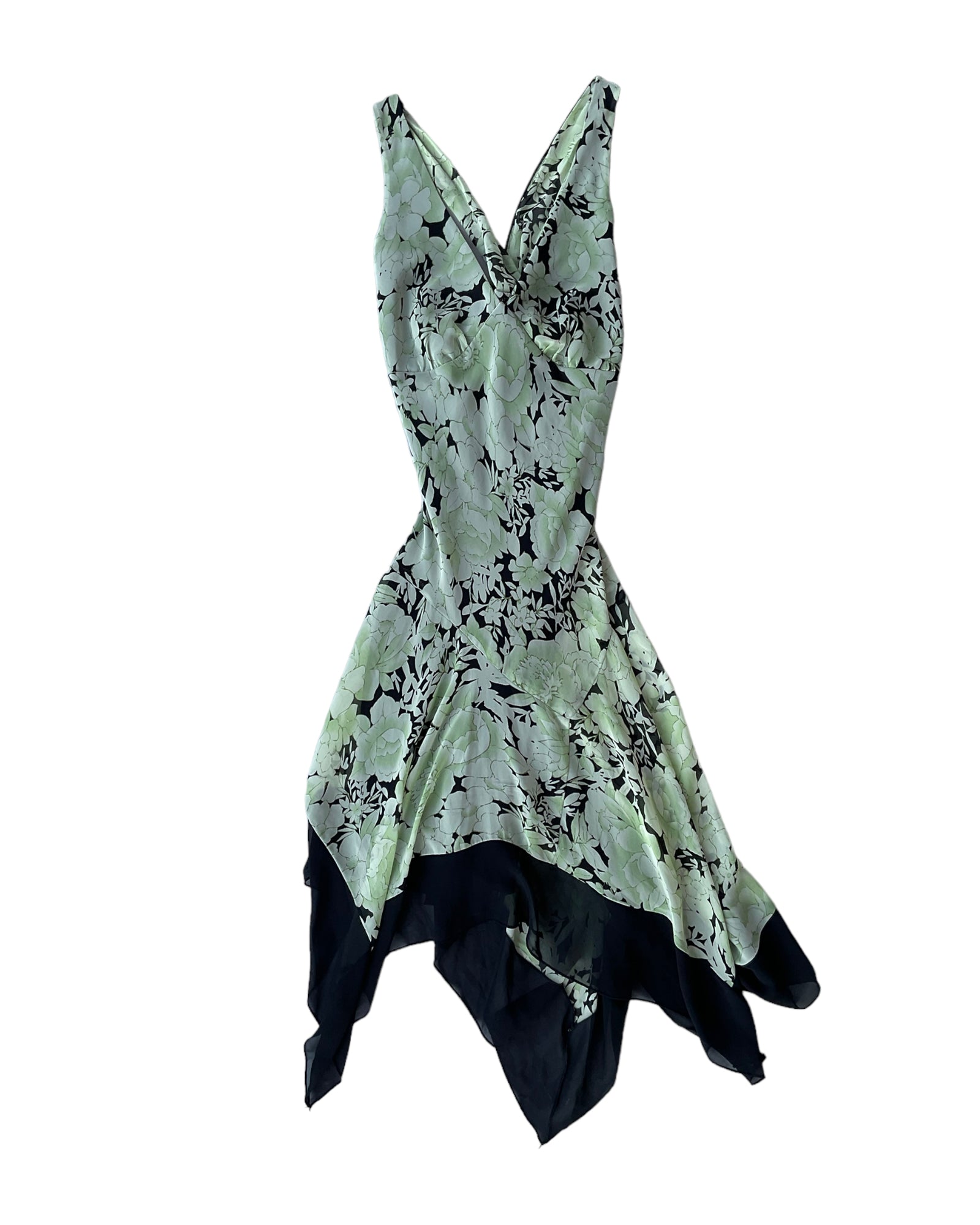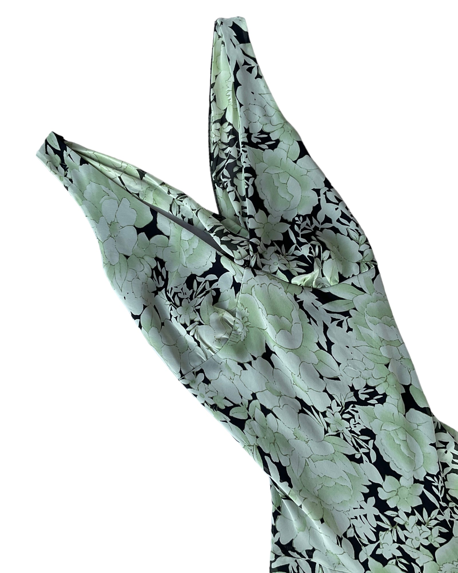 VESTIDO 100% POLYESTER NEGRO CON ESTAMPADO DE FLORES VERDE MENTA. DOBLADILLO EN DIAGONAL Y ESPALDA CRUZADA. TIRANTES NO AJUSTABLES. SIN DETALLES DE USO.