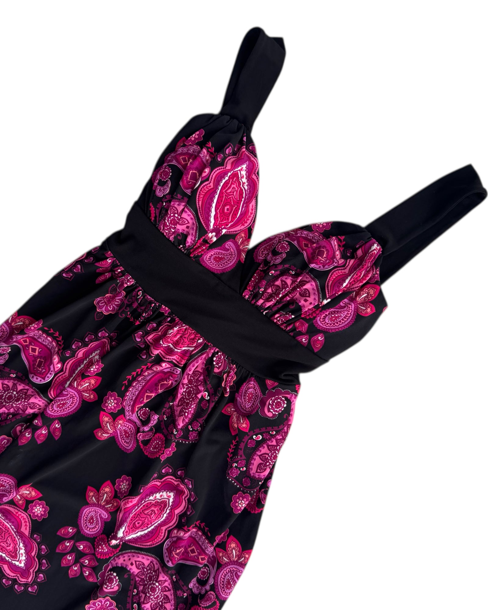 VESTIDO SPEECHLESS, TIRANTES, ESCOTE MUY CUTE EN V. PRINT PAISLEYS COLOR MAGENTA, ROSA Y NEGRO. LA TELA ES STRETCH Y ES POLIESTER. USALO CON UNOS PEQUEÑOS TACONES :) SOOO CUTE.