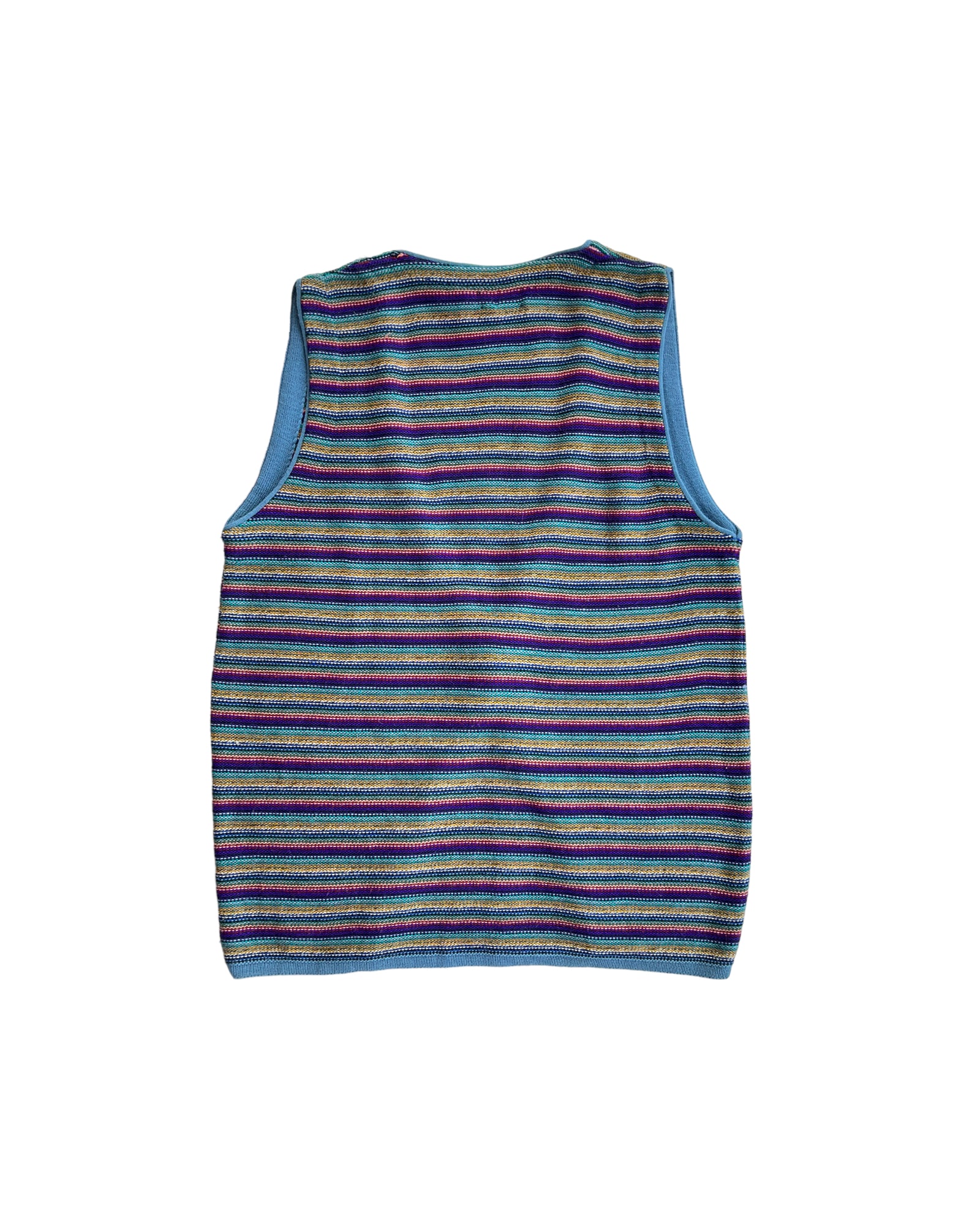 CHALECO 100% ACRILICO CON ESTAMPADO DE RALLAS DE COLOR MORADO, ROSA, BLANCO, AZUL, VERDE Y AMARILLO. BOTON DE MADERA PARA ABROCHAR EN EL CENTRO. SIN DETALLES DE USO.