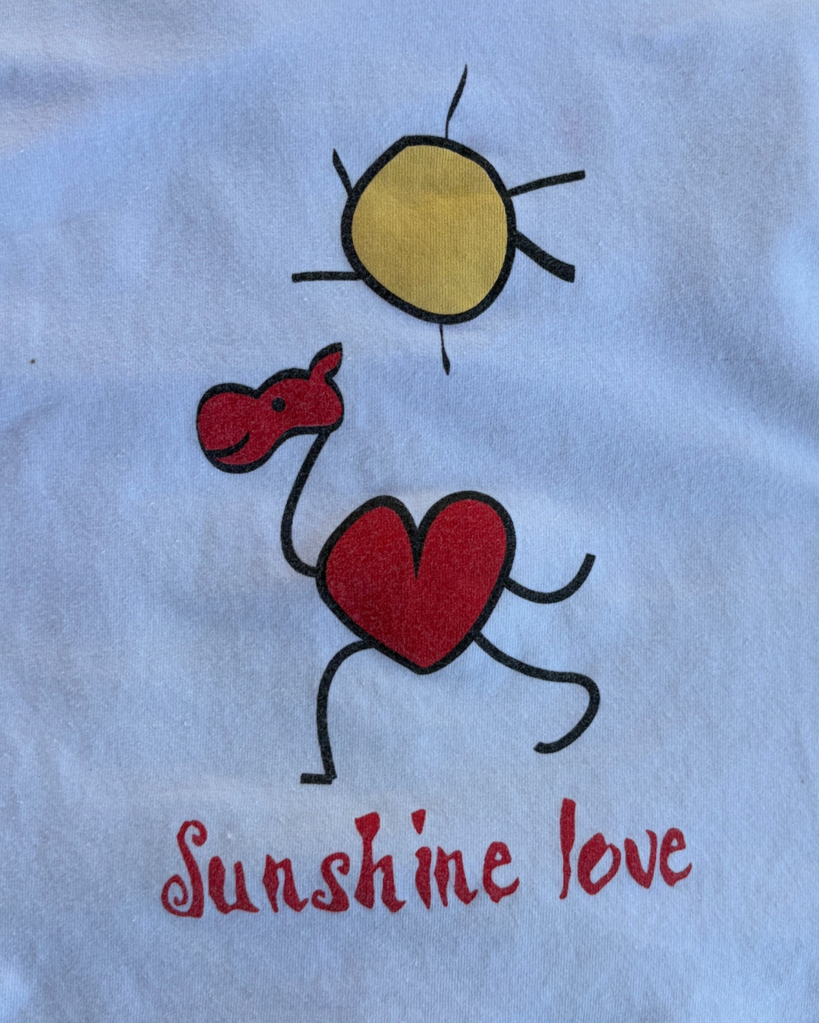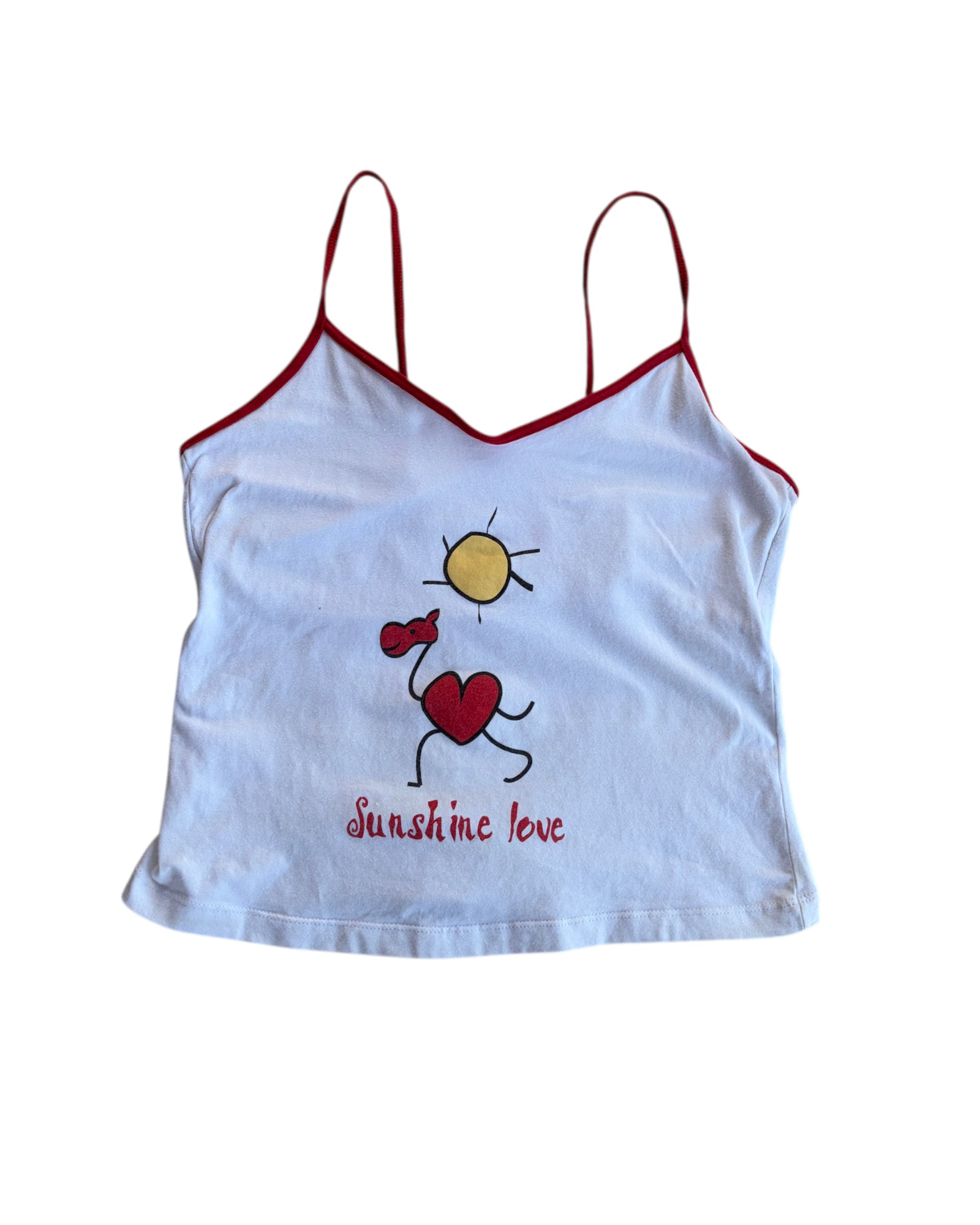 TOP BLANCO CON TRIMMING EN COLOR ROJO Y TIRANTES AJUSTABLES, PRINT DELANTERO DE CAMELLO CON FORMA DE CORAZON EN ROJO Y NEGRO Y SOL EN AMARILLO Y NEGRO. LETRAS SUNSHINE LOVE EN ROJO. 92% ALGODON Y 8% ELASTANO. BUILT IN BRA EN COLOR BLANCO. NO TIENE DETALLES, EN PERFECTAS CONDICIONES.