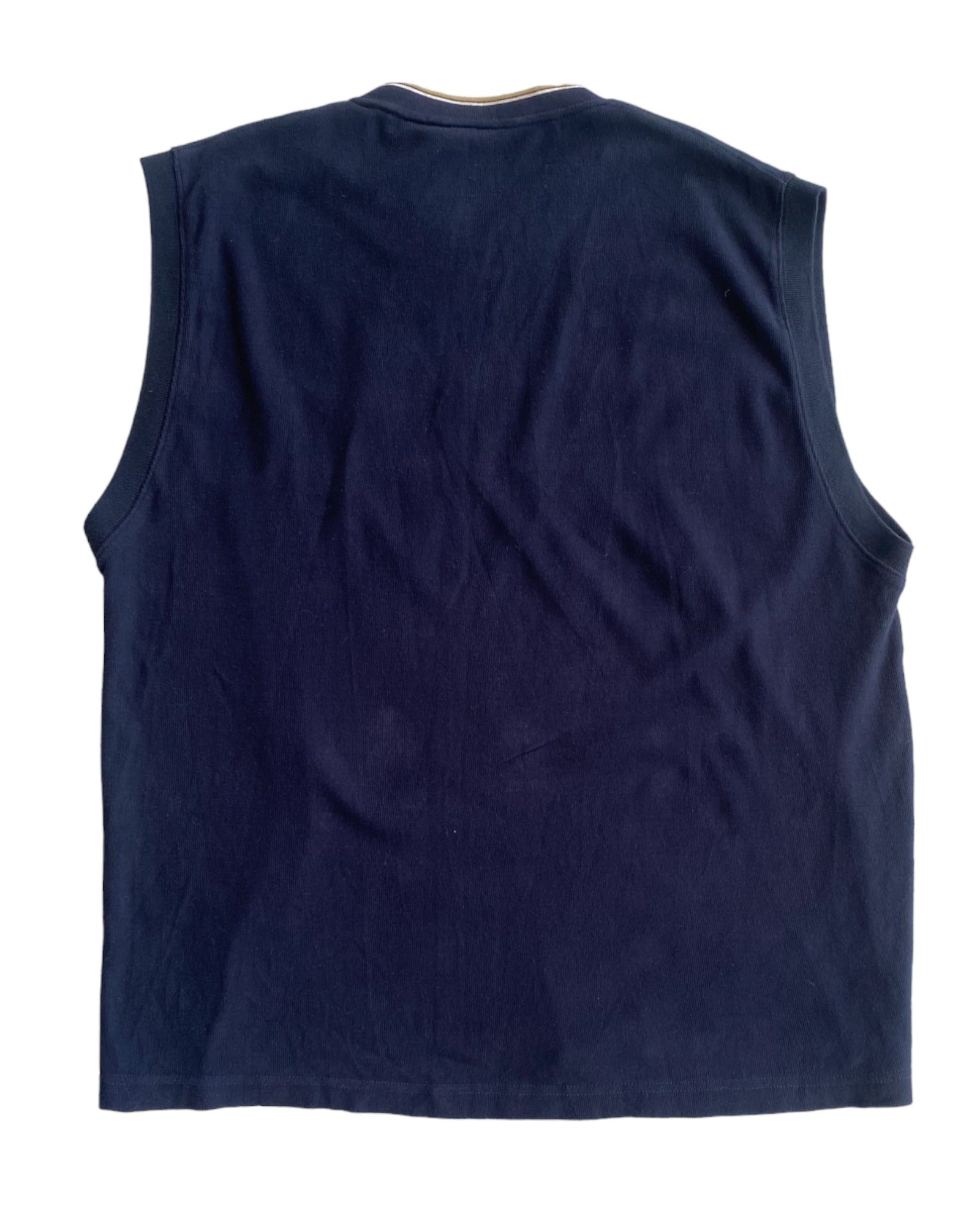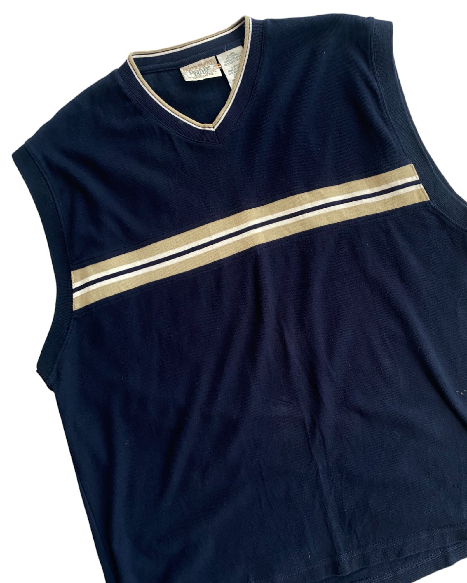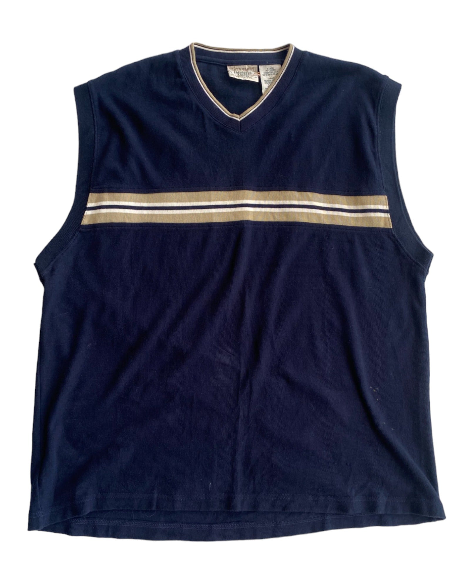 CHALECO AZUL MARINO CON DETALLE DE RAYA EN EL PECHO DORADA Y BLANCA. 1990S. FADED GLORY 100% COTTON