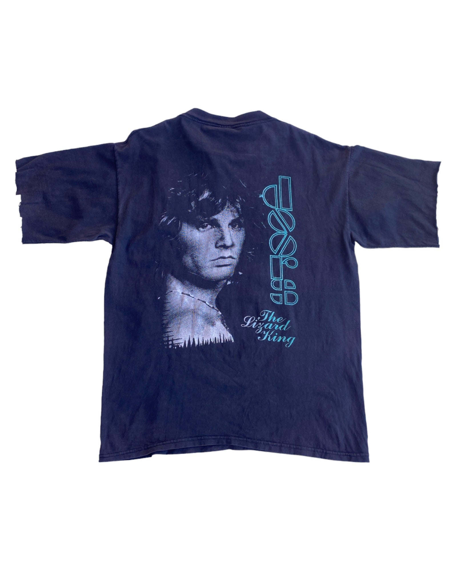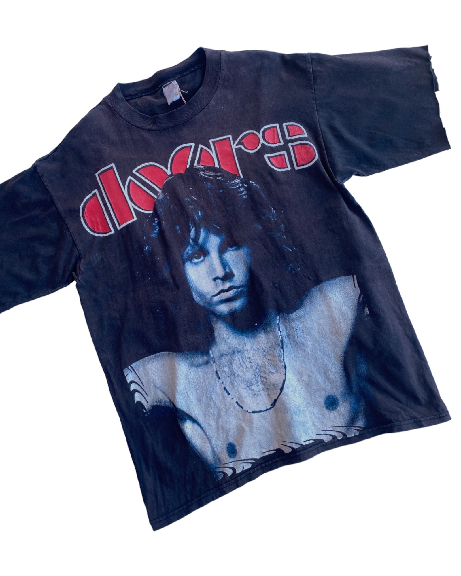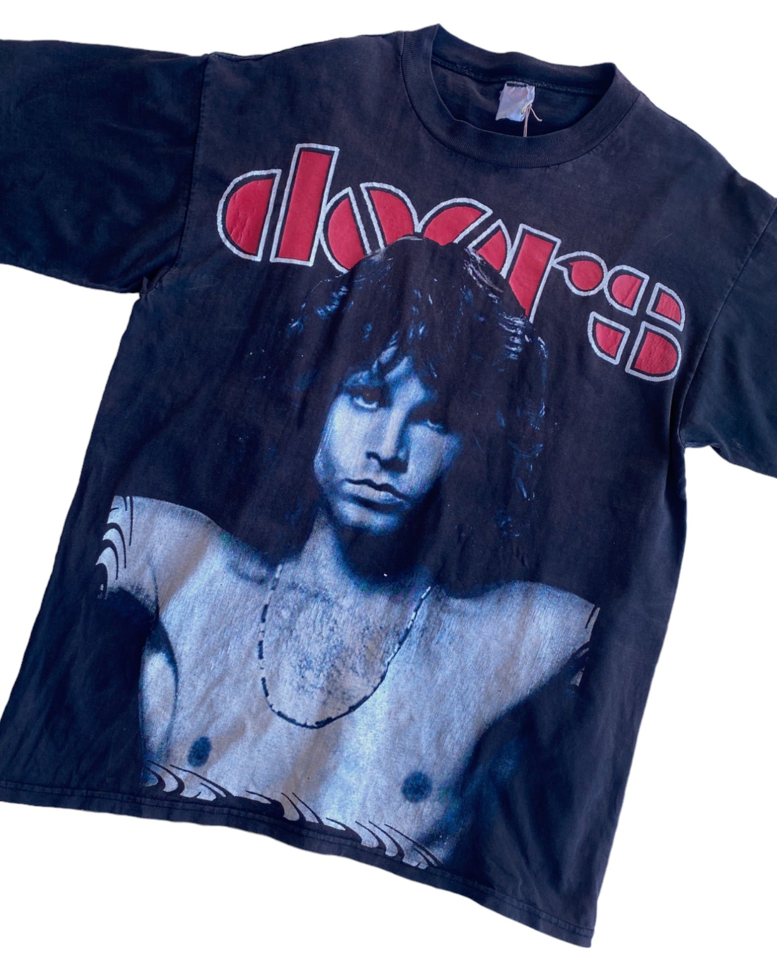 PLAYERA COLOR NEGRO 100% ALGODÓN CON ESTAMPADO CON EL LOGO DE THE DOORS Y JIM MORRISON EN GRANDE EN LA PARTE FRONTAL Y TRASERA. DETALLE DE MANGAS CORTADAS Y ESTAMPADO GASTADO POR EL USO.