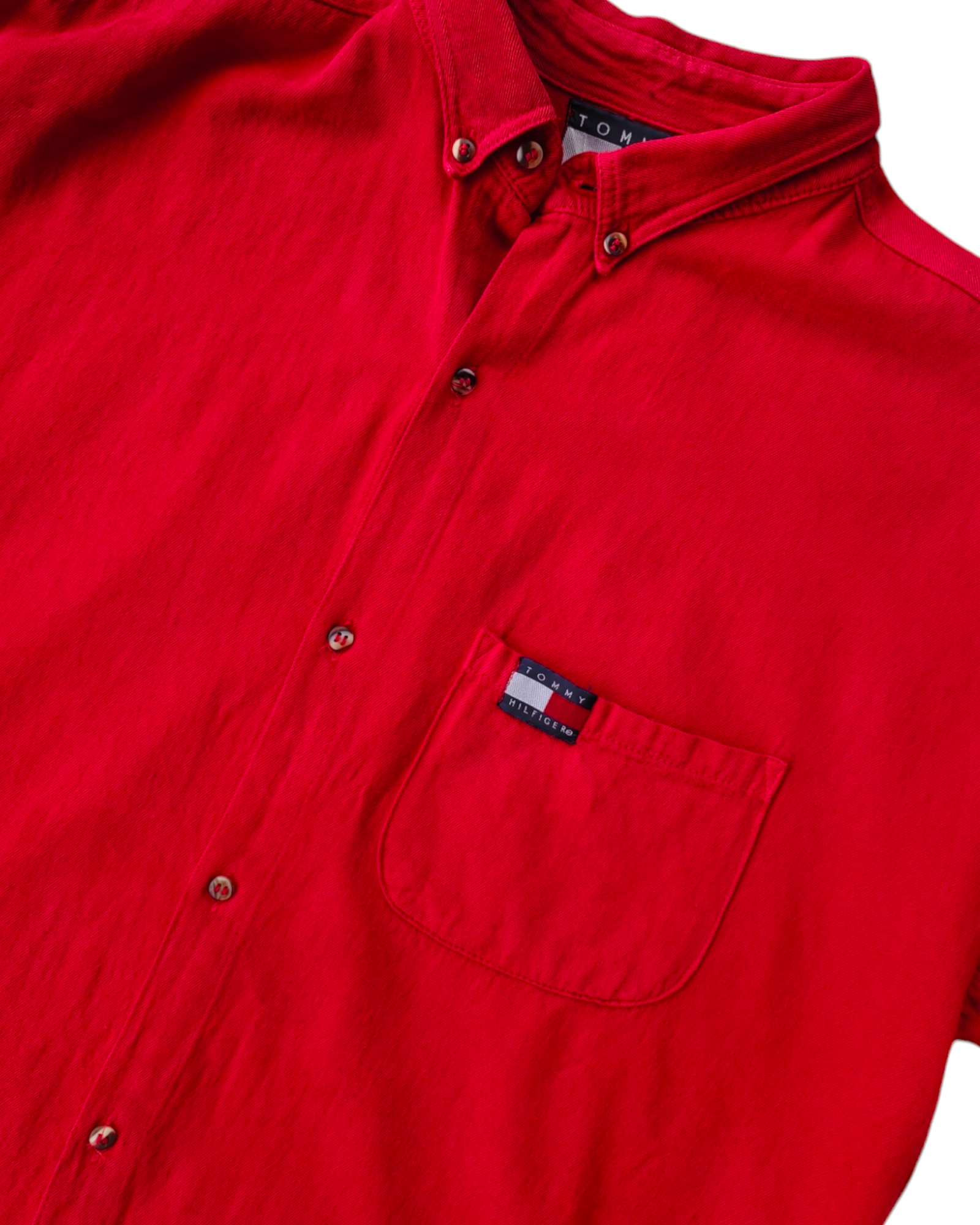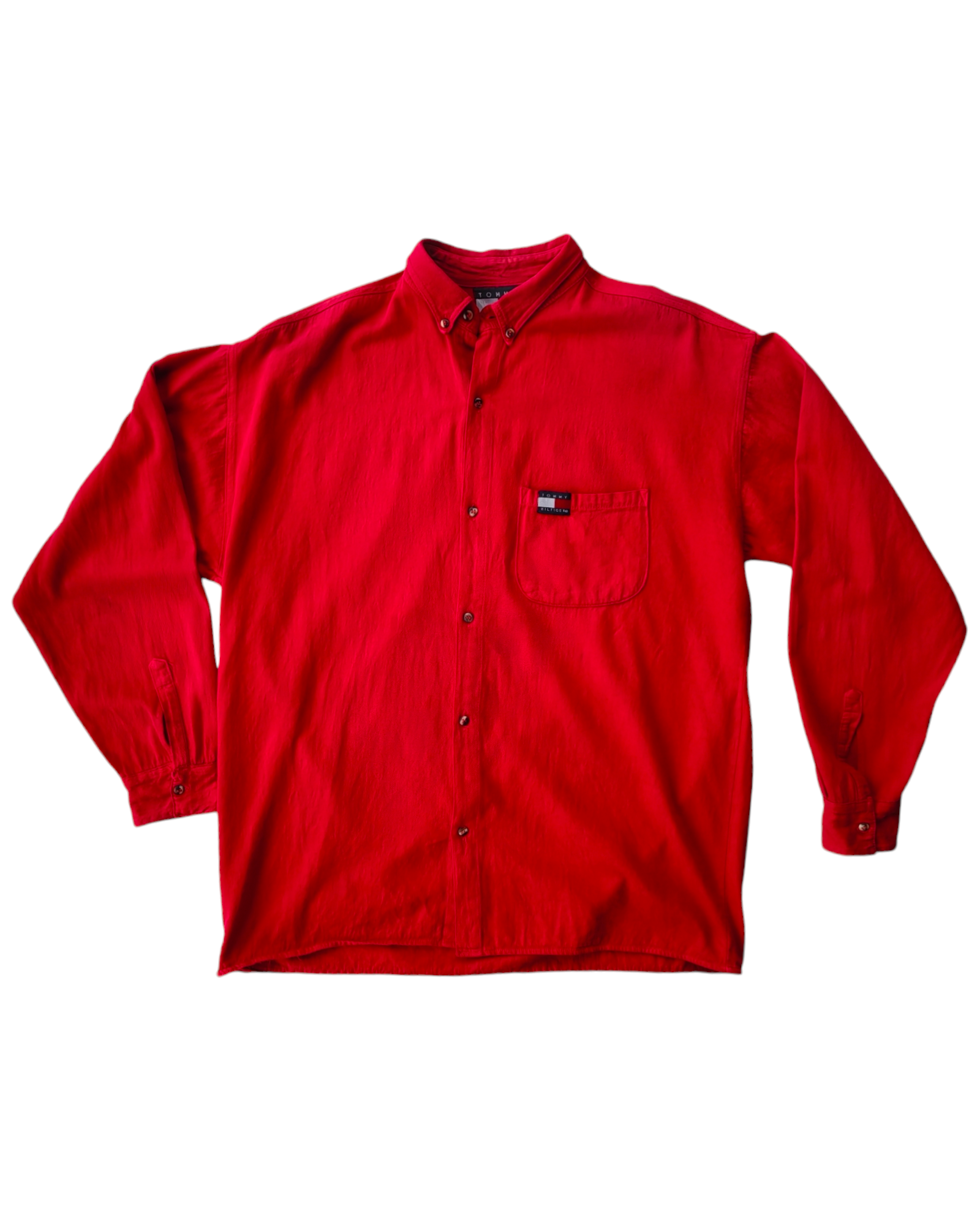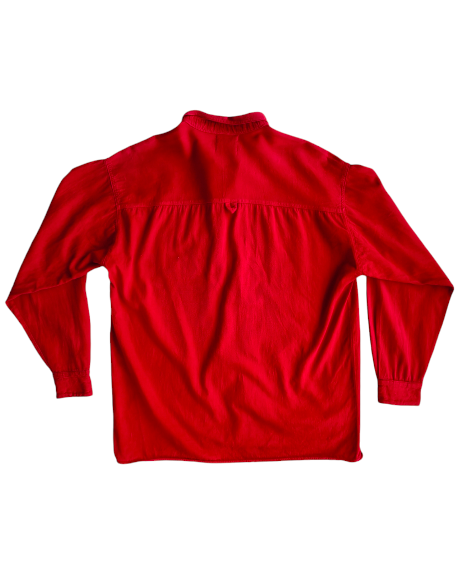 CAMISA MANGA LARGA COLOR ROJO, BOLSILLO FRONTAL, 6 BOTONES FRONTALES Y 1 EN CADA PUÑO. PEQUEÑAS MANCHAS EN LA PARTE INTERIOR DEL CUELLO Y DECOLORACIÓN EN LA PARTE INFERIOR IZQUIERDA.