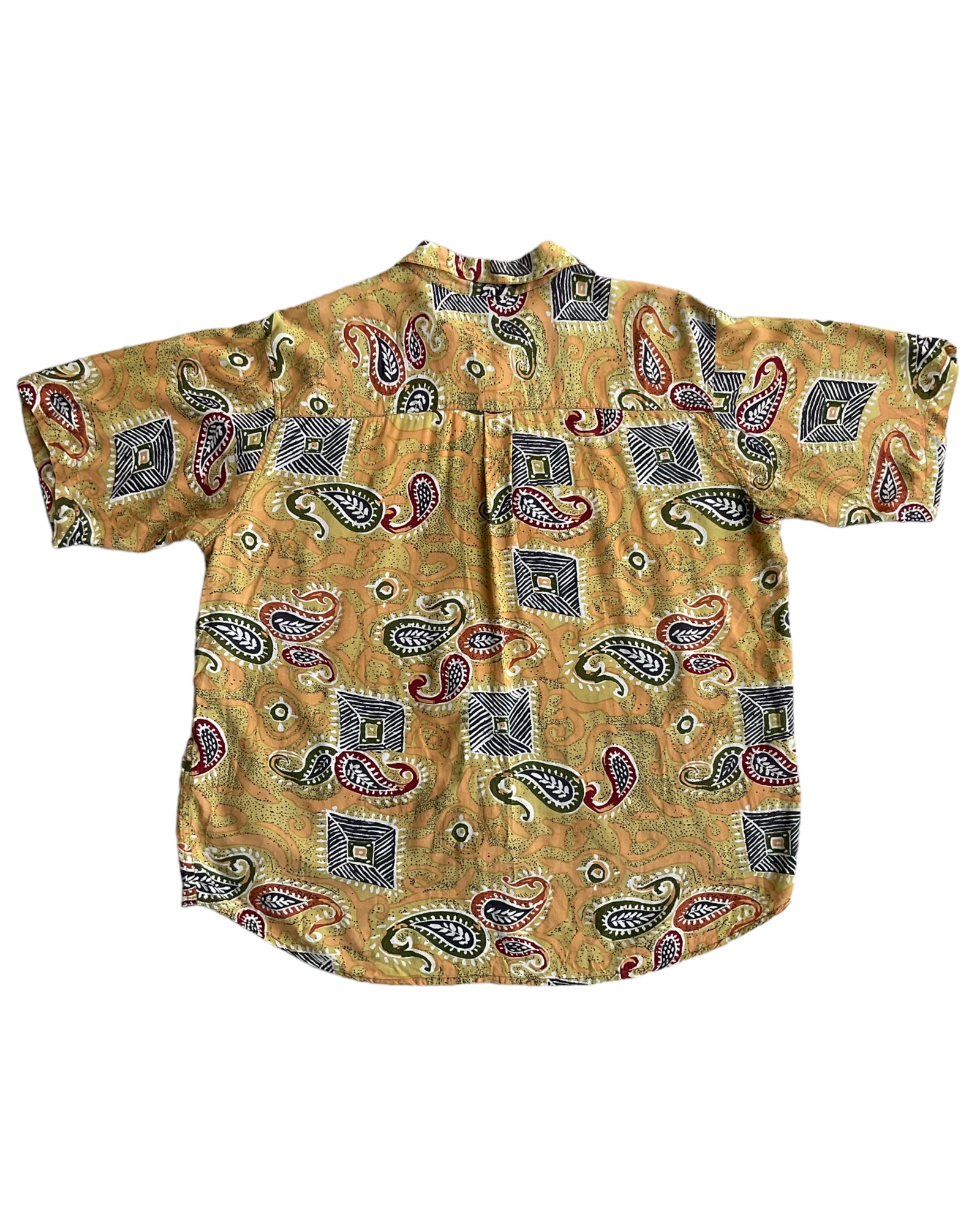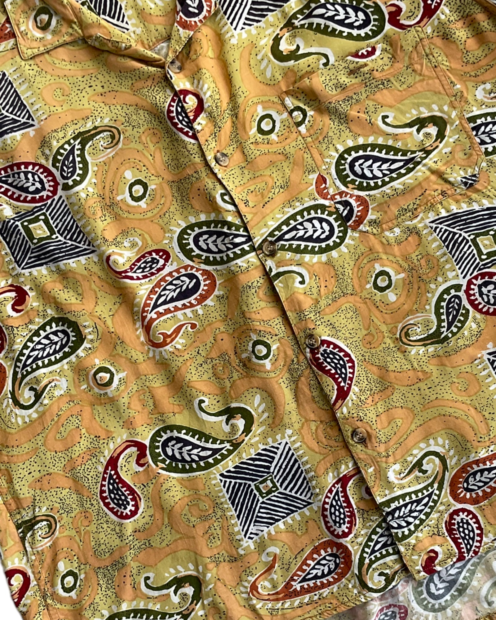CAMISA DE BOTONES 100% RAYON COLOR AMARILLO CON ESTAMPADO DE BACTERIAS EN COLOR MOSTAZA, VERDE, AZUL Y NARANJA. BOLSILLO FRONTAL CON BOTÓN. SIN DETALLES DE USO.