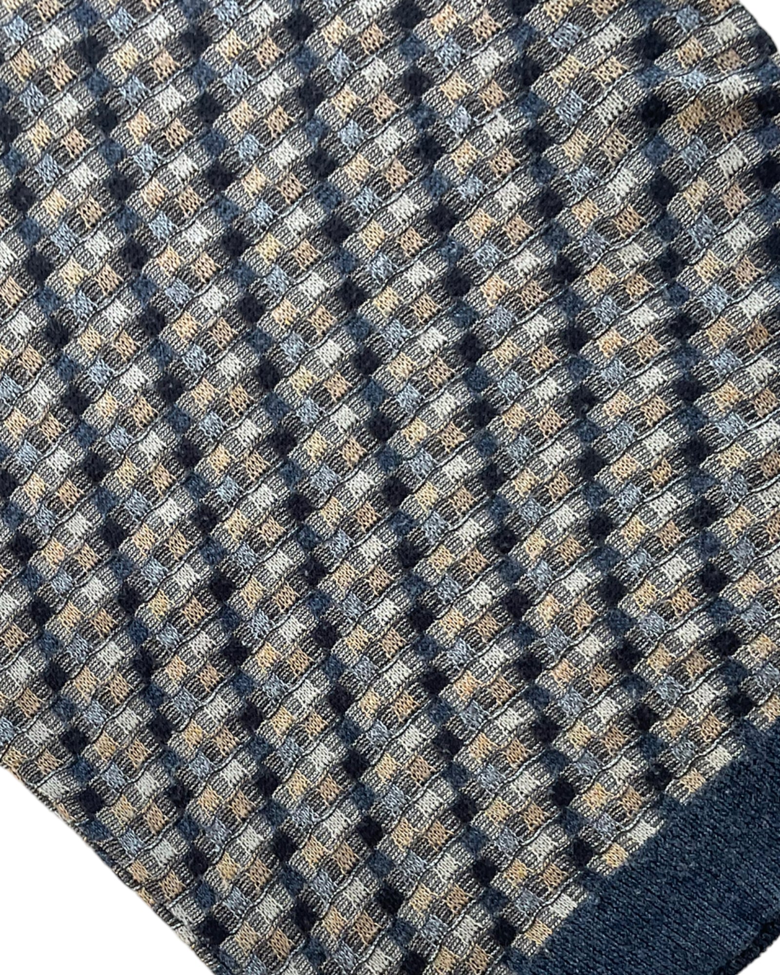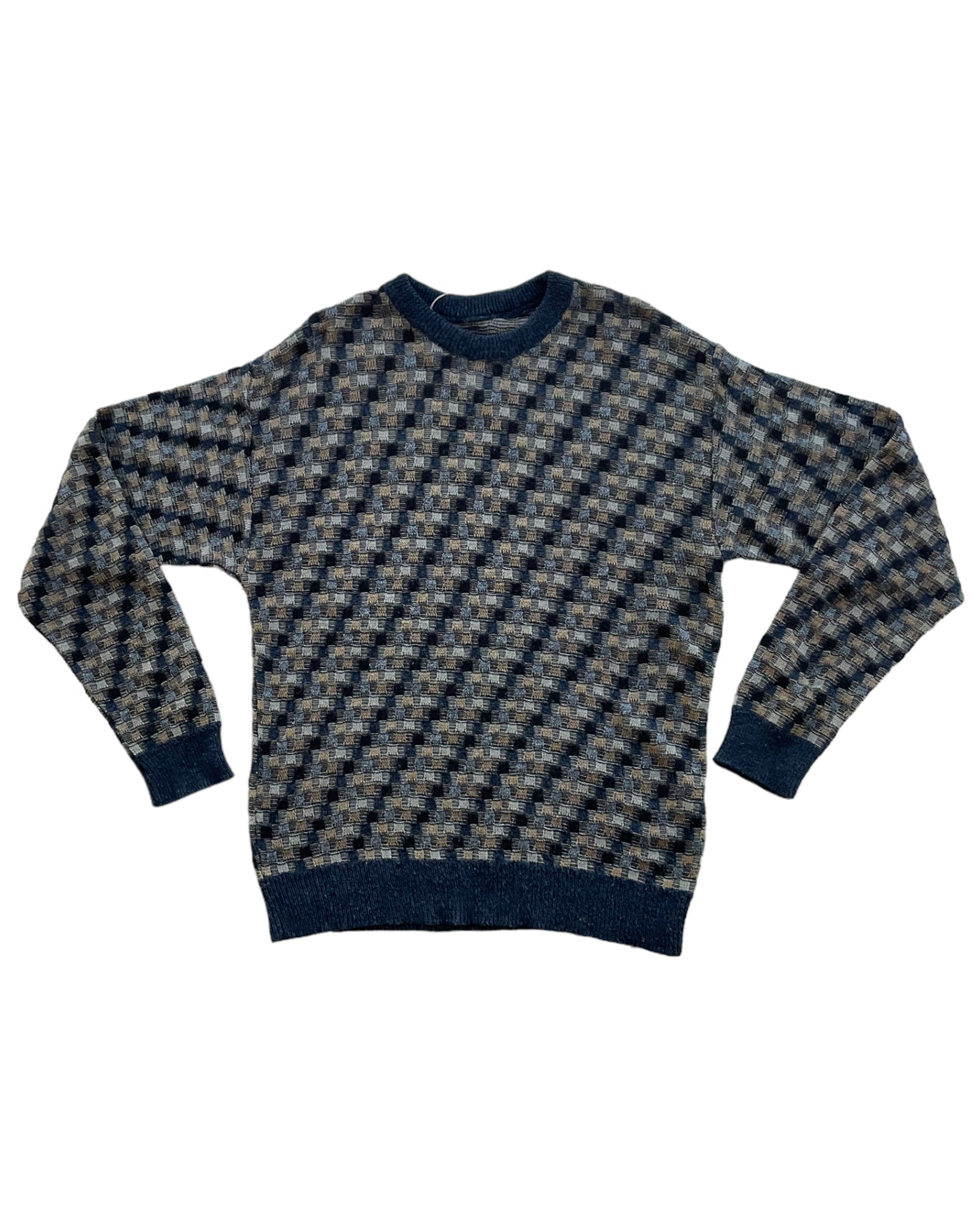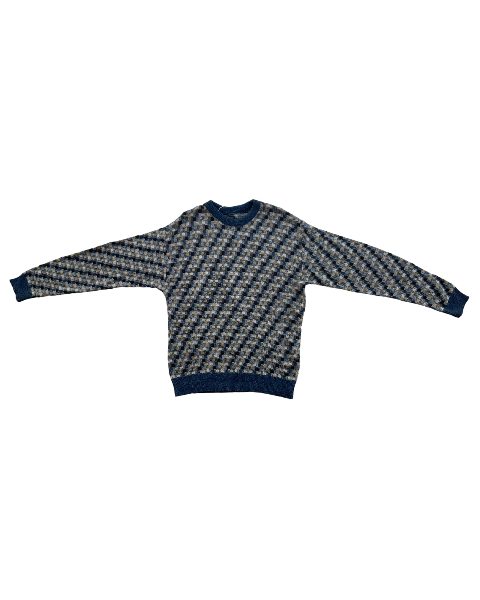 SUÉTER TEJIDO CON PATRÓN DE CUADRITOS DE COLORES AZUL, AMARILLO Y GRIS, PEQUEÑO AGUJERO EN LA PARTE PPSTERIOR.