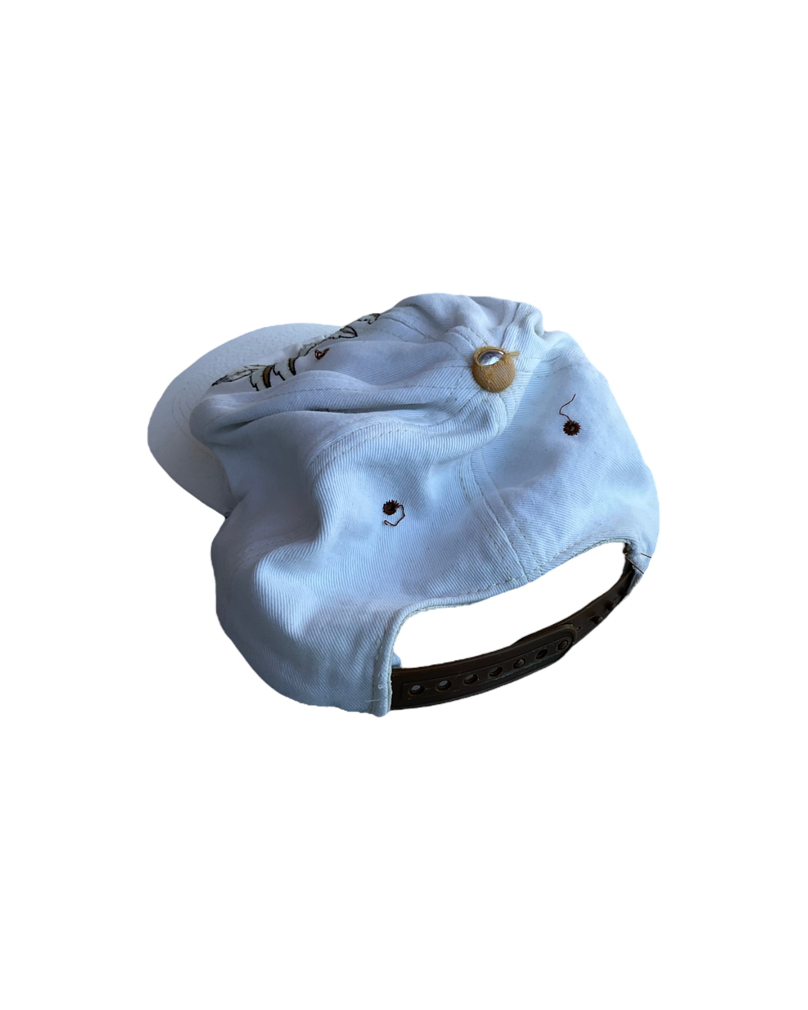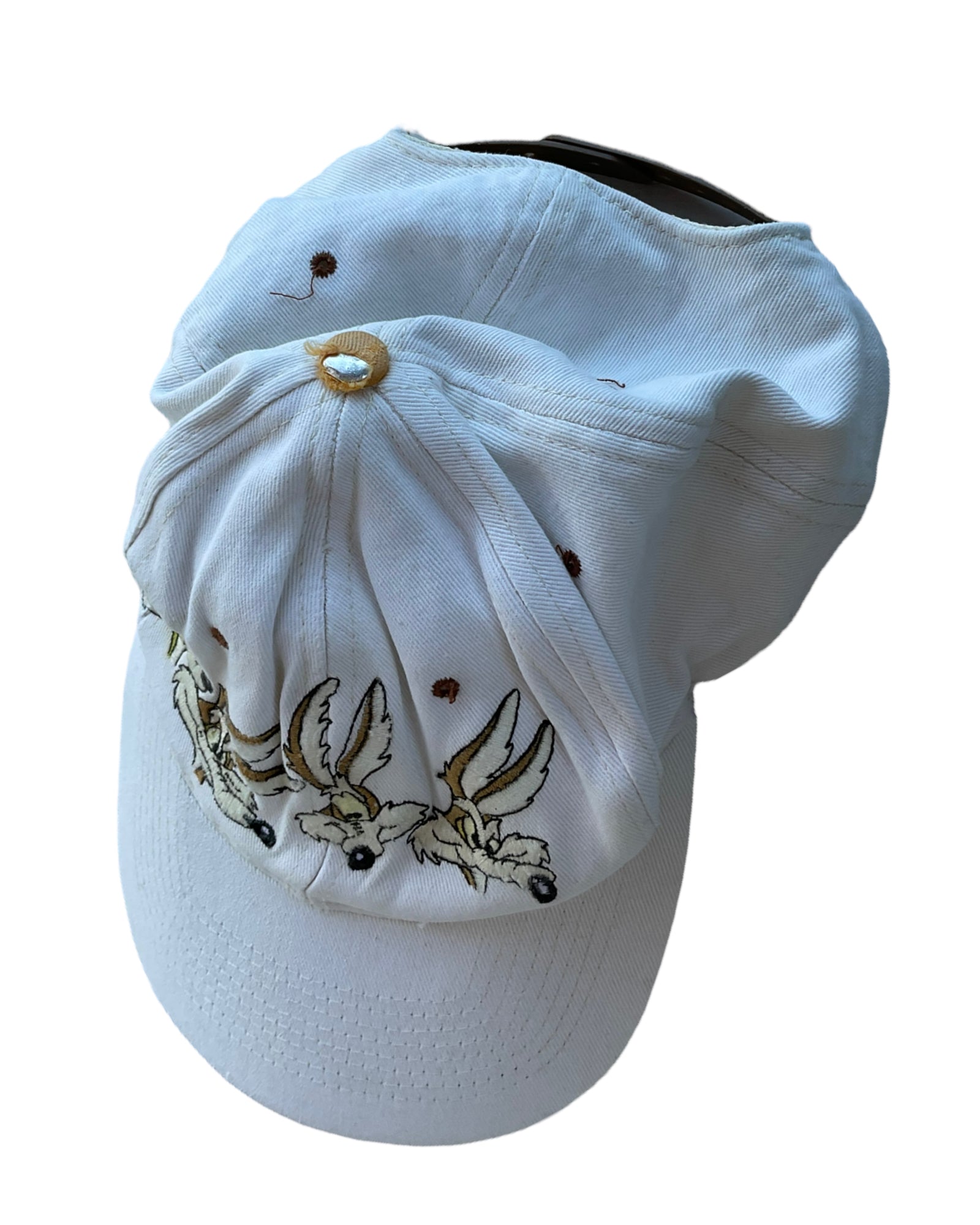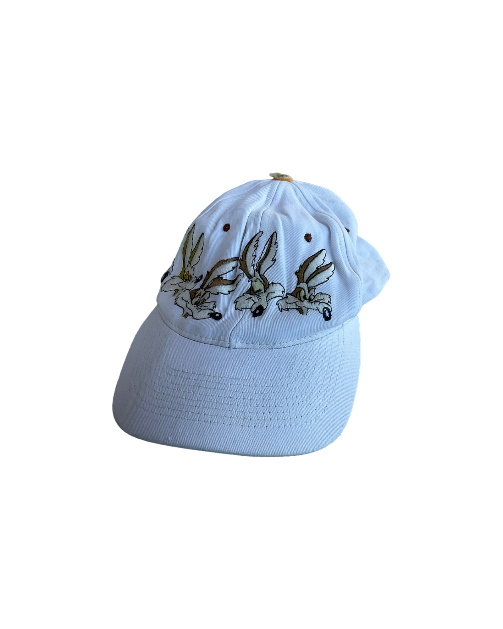 GORRA BLANCA CON DETALLES EN BEIGE Y CAFÉ Y CON VARIAS EXPRESIONES DE WILLY COYOTE BORDADAS AL FRENTE, INTERIOR VERDE. MERCANCÍA OFICIAL DE LOONEY TUNES
