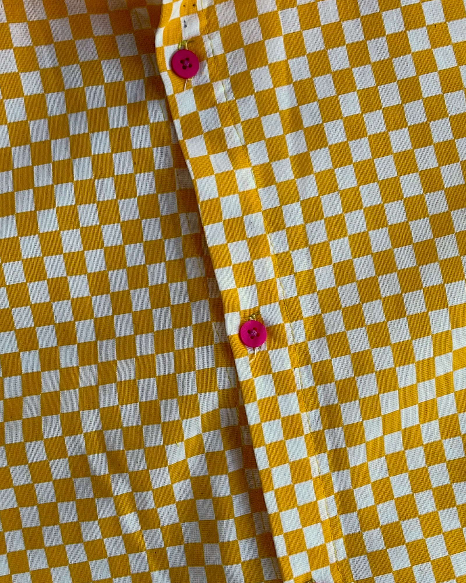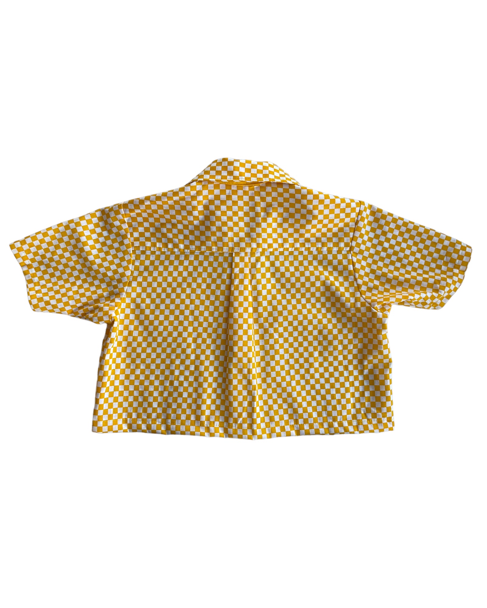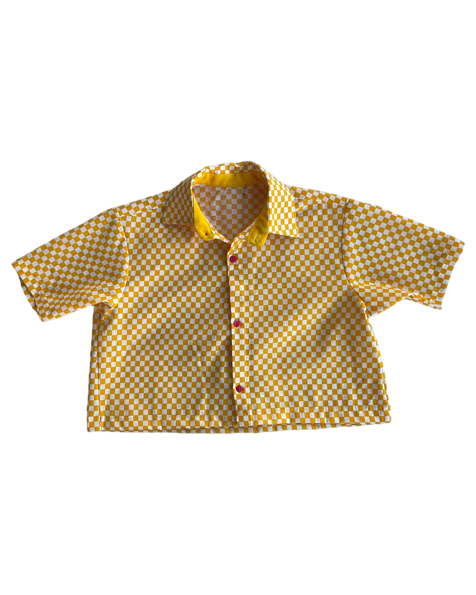 CAMISA DE CUADROS AMARILLOS Y BLANCOS CON BOTONES ROJOS, CORTE CROPPED. ALGUNAS MANCHITAS EN LA TELA POR ANTIGÜEDAD.
