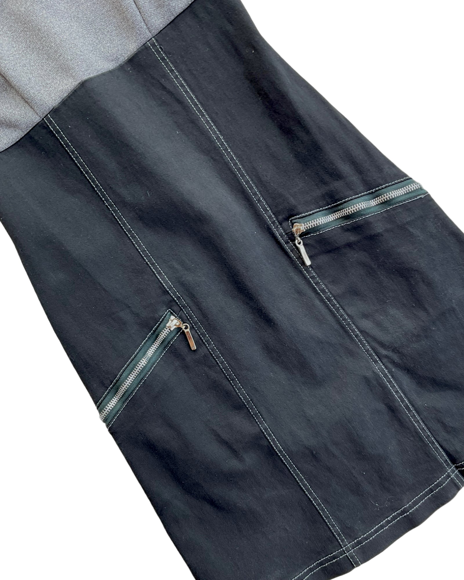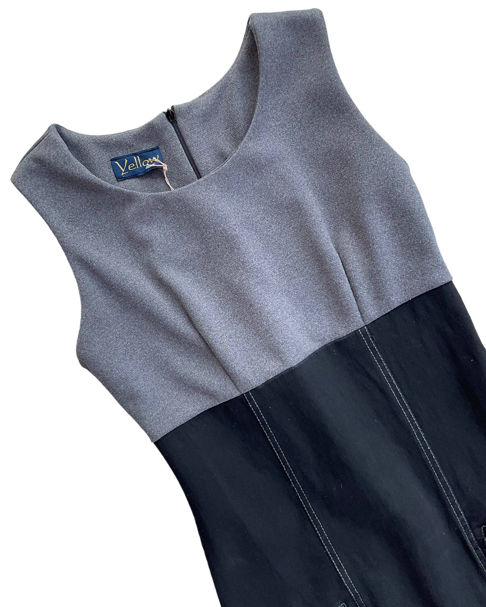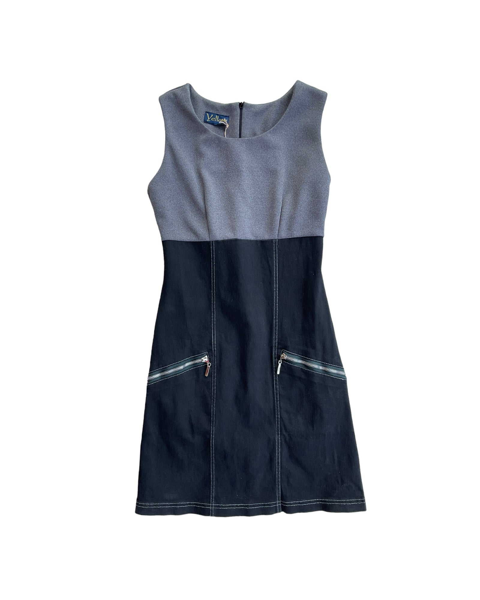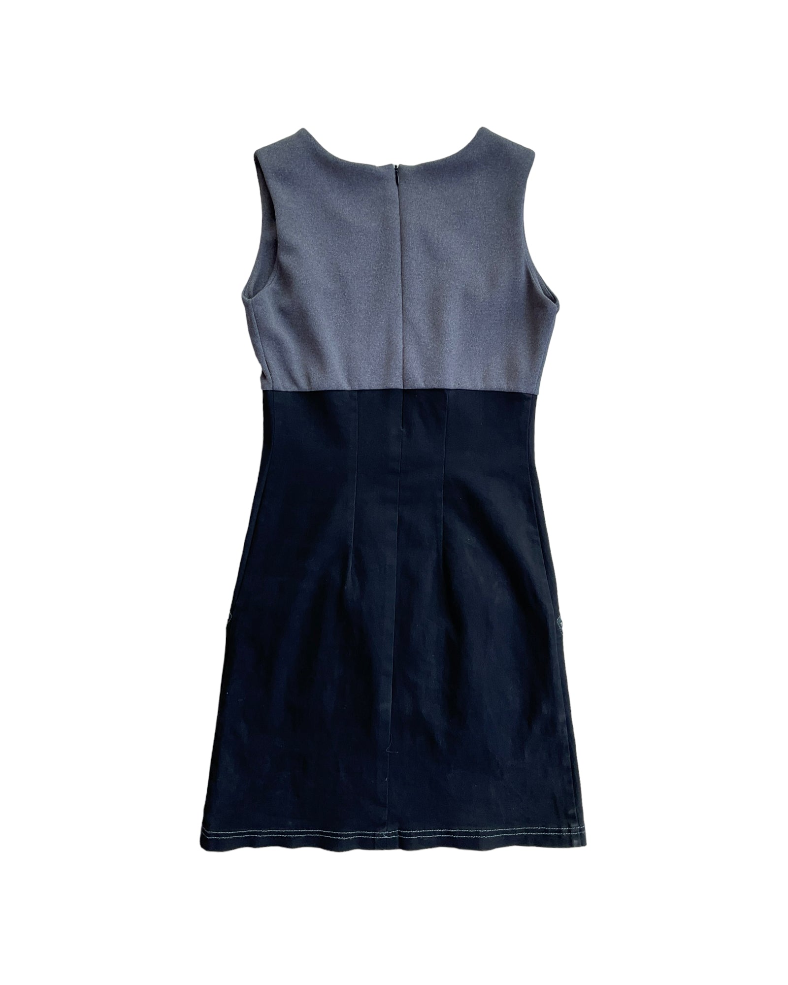 VESTIDO MITAD GRIS MITAD NEGRO MATERIAL TIPO MEZCLILLA CON COSTURAS BLANCAS. DOS BOLSILLOS FRONTALES EN LA FALDA. SIN DETALLES DE USO.