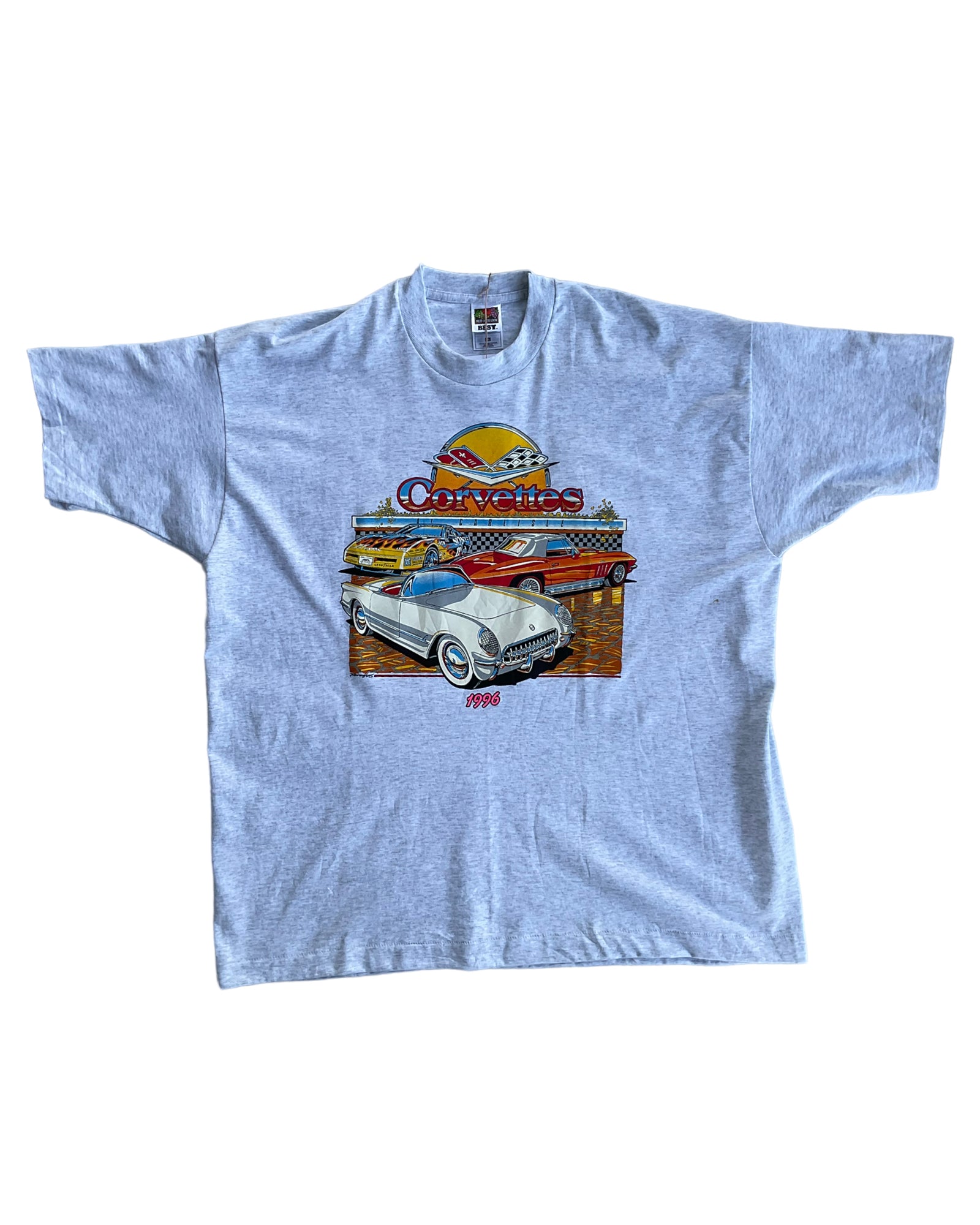 PLAYERA GRIS OVERSIZED CON ESTAMPADO DE CORVETTE. 50% ALGODÓN, 50% POLIÉSTER.