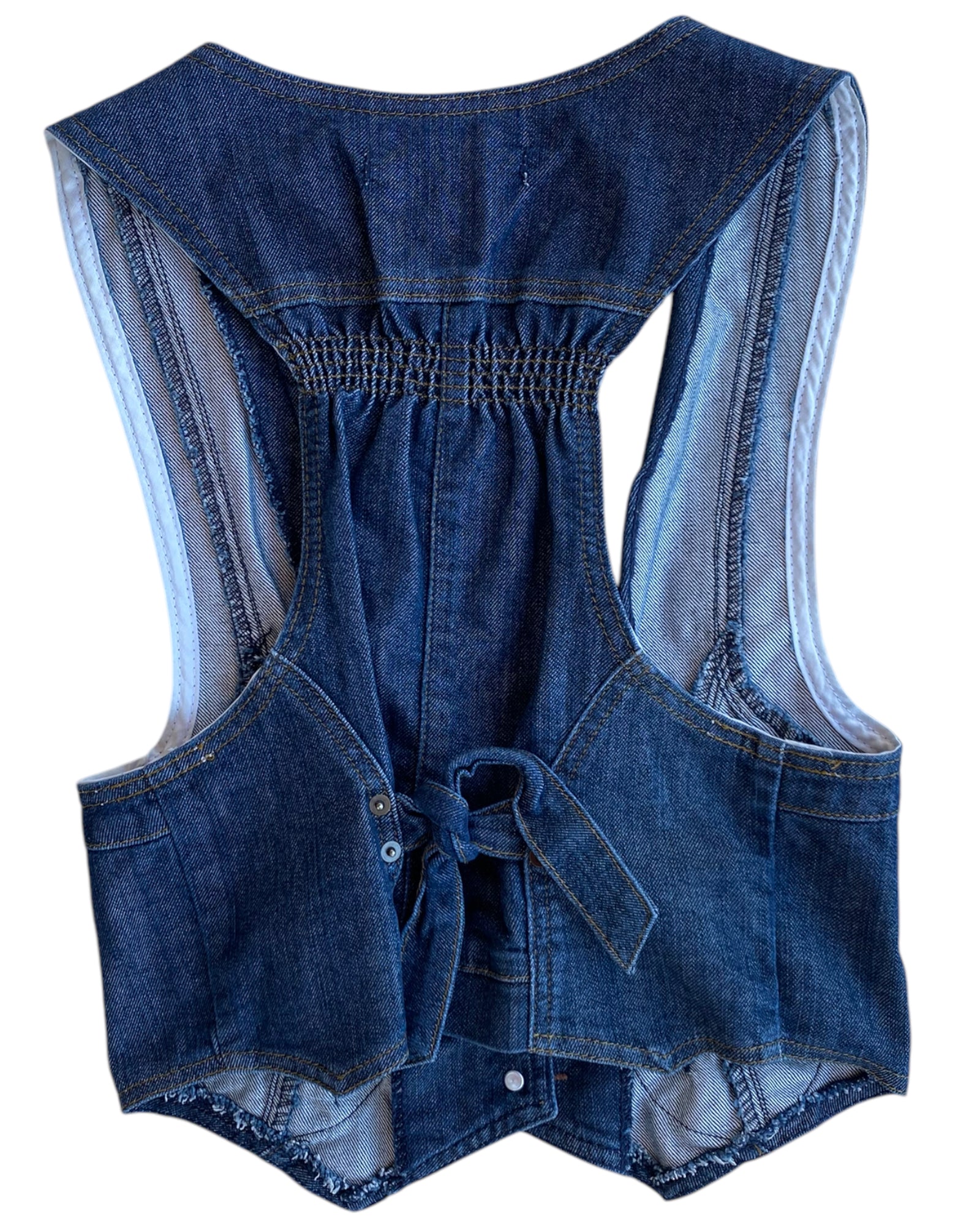 CHALECO DE DENIM OSCURO CON BOTONES FRONTALES. AJUSTABLE EN LA PARTE DE ATRAS. SIN DETALLES DE USO.