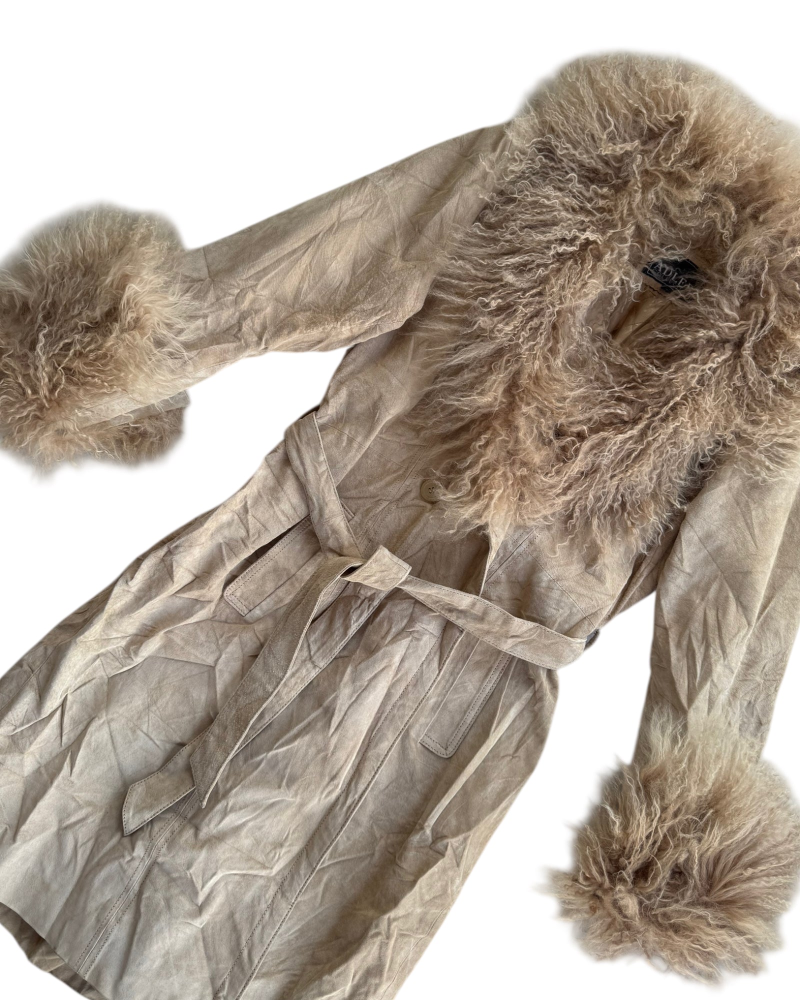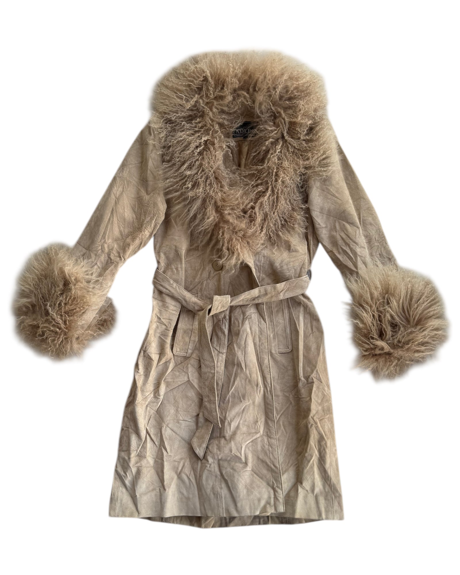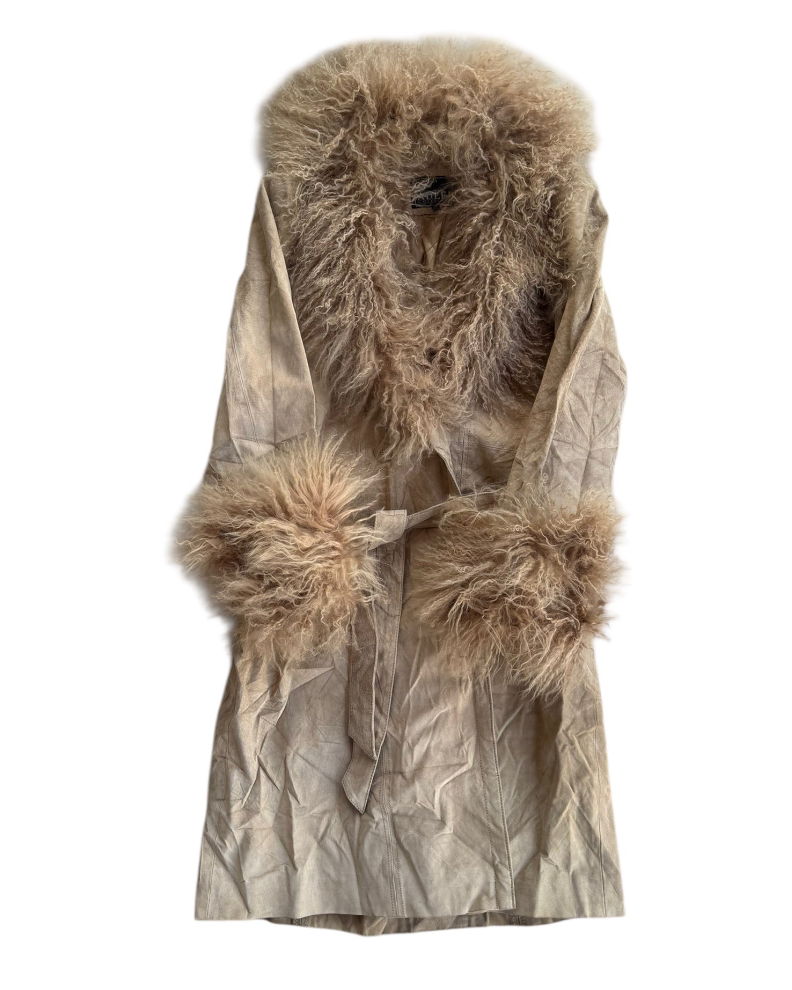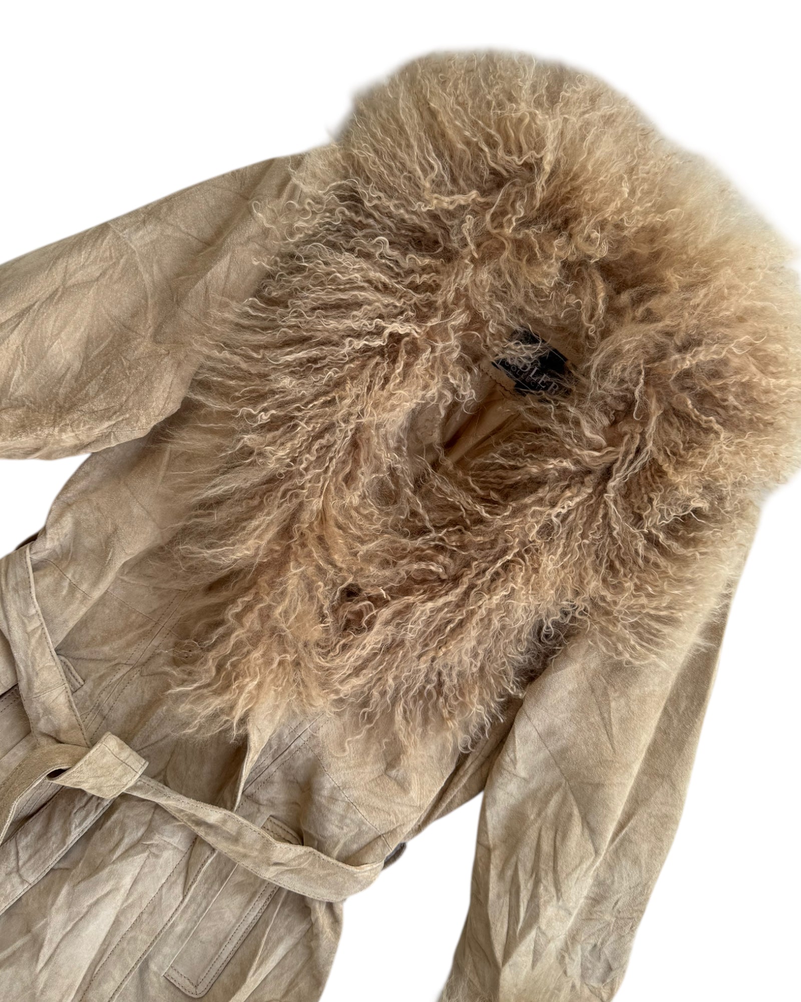 CHAMARRA DE PIEL COLOR BEIGE, CON PELO FALSO EN CUELLO Y PUÑOS, DOS BOTONES EN PARTE DELANTERA Y CINTILLO DE PIEL COLOR BEIGE. 100% PIEL, RELLENO 100% POLIESTER. EN PERFECTAS CONDICIONES.