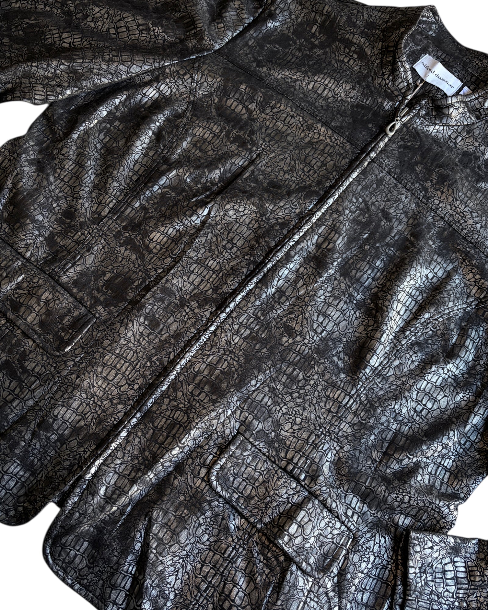 CHAMARRA 70% POLYESTER, 26% RAYON Y 4% SPANDEX CON TEXTURA DE COCODRILO EN COLOR GRIS METÁLICO Y CHAMARRA NEGRA, BOLSILLOS FUNCIONALES DELANTEROS Y ZIPPER PLATEADO AL FRENTE. NO TIENE DETALLES, EN PERFECTO ESTADO.