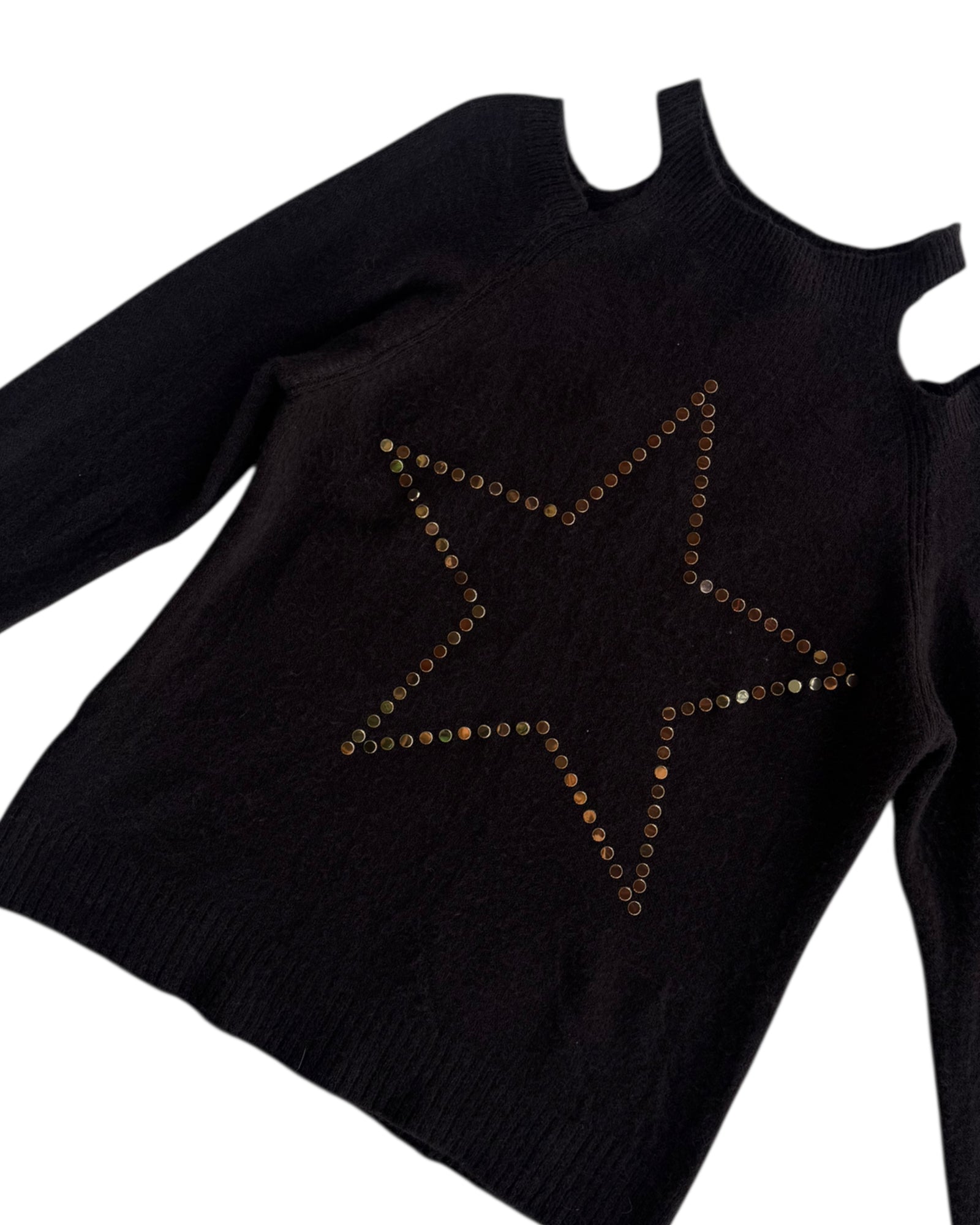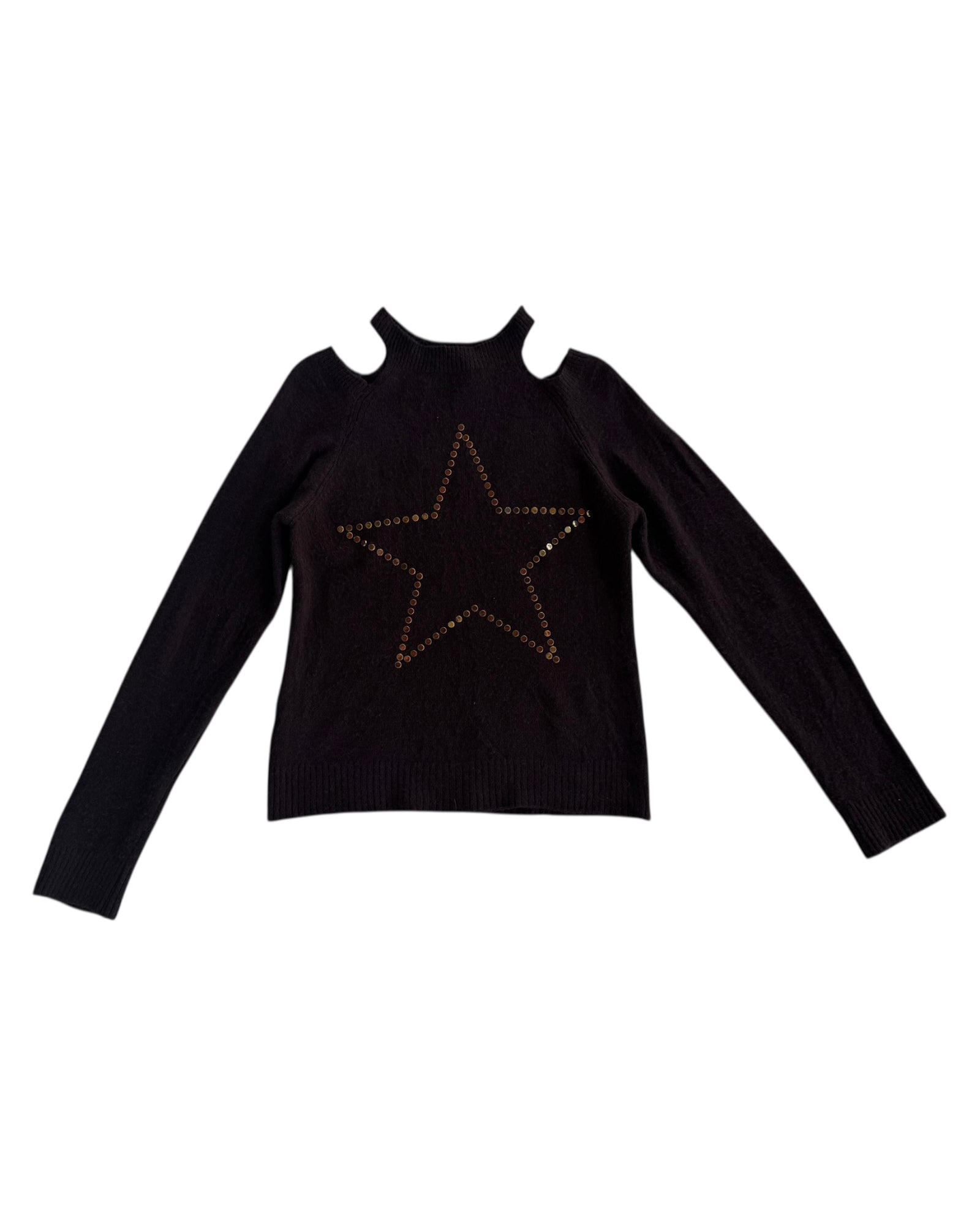 SUETER 50% ACRILICO, 22% POLIAMIDA Y 28% POLYESTER EN COLOR CAFE OSCURO CON ABERTURAS EN LOS HOMBROS Y ESTRELLA CON ESTOPEROLES DORADOS. NO TIENE DETALLES, EN PERFECTO ESTADO.