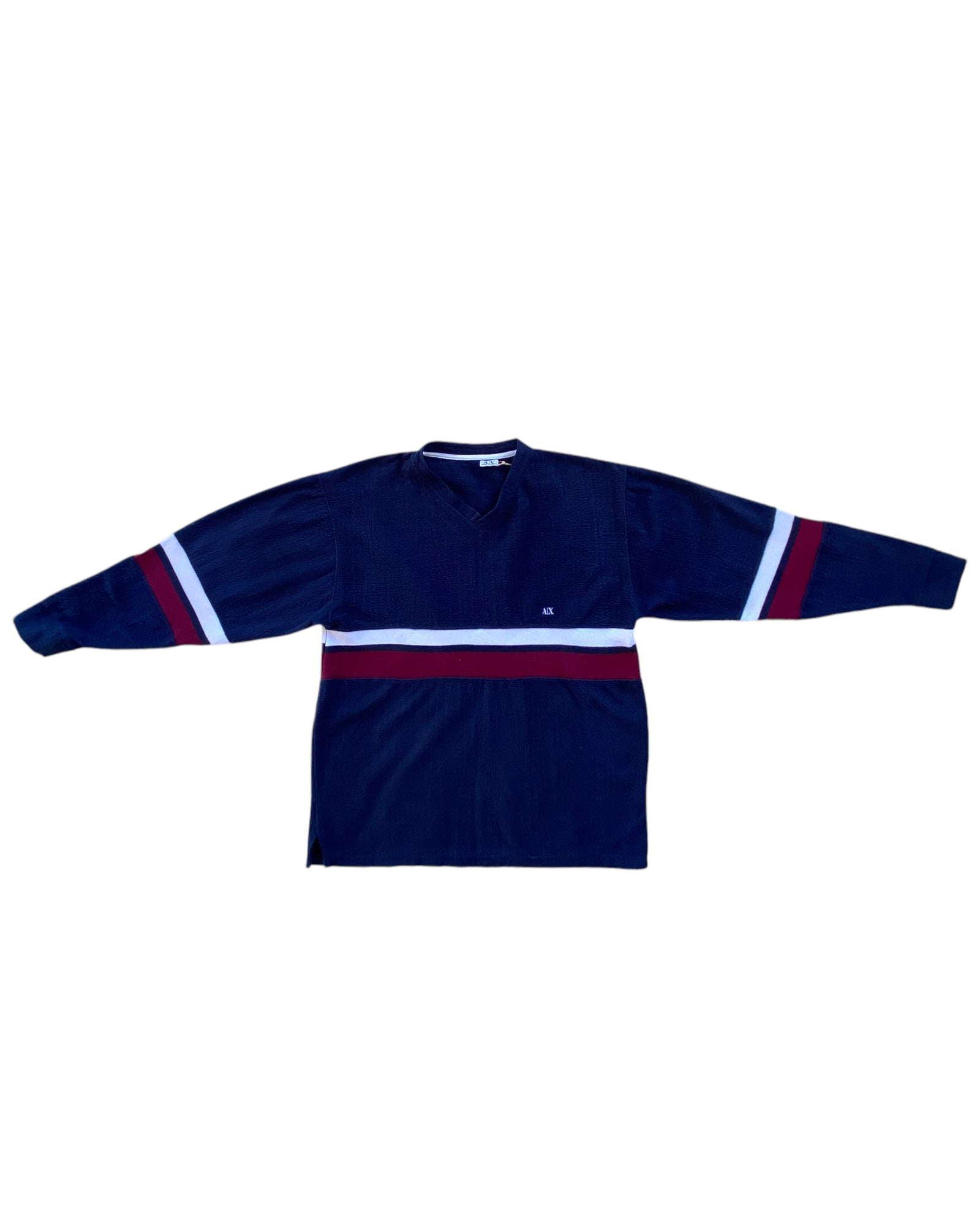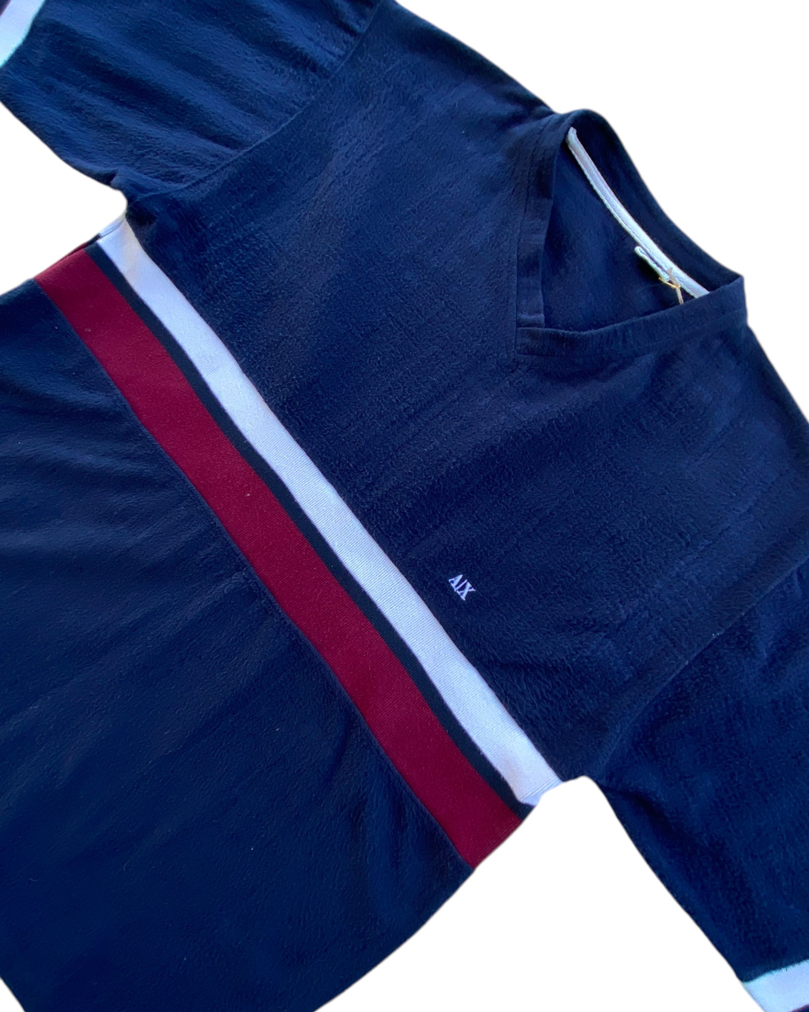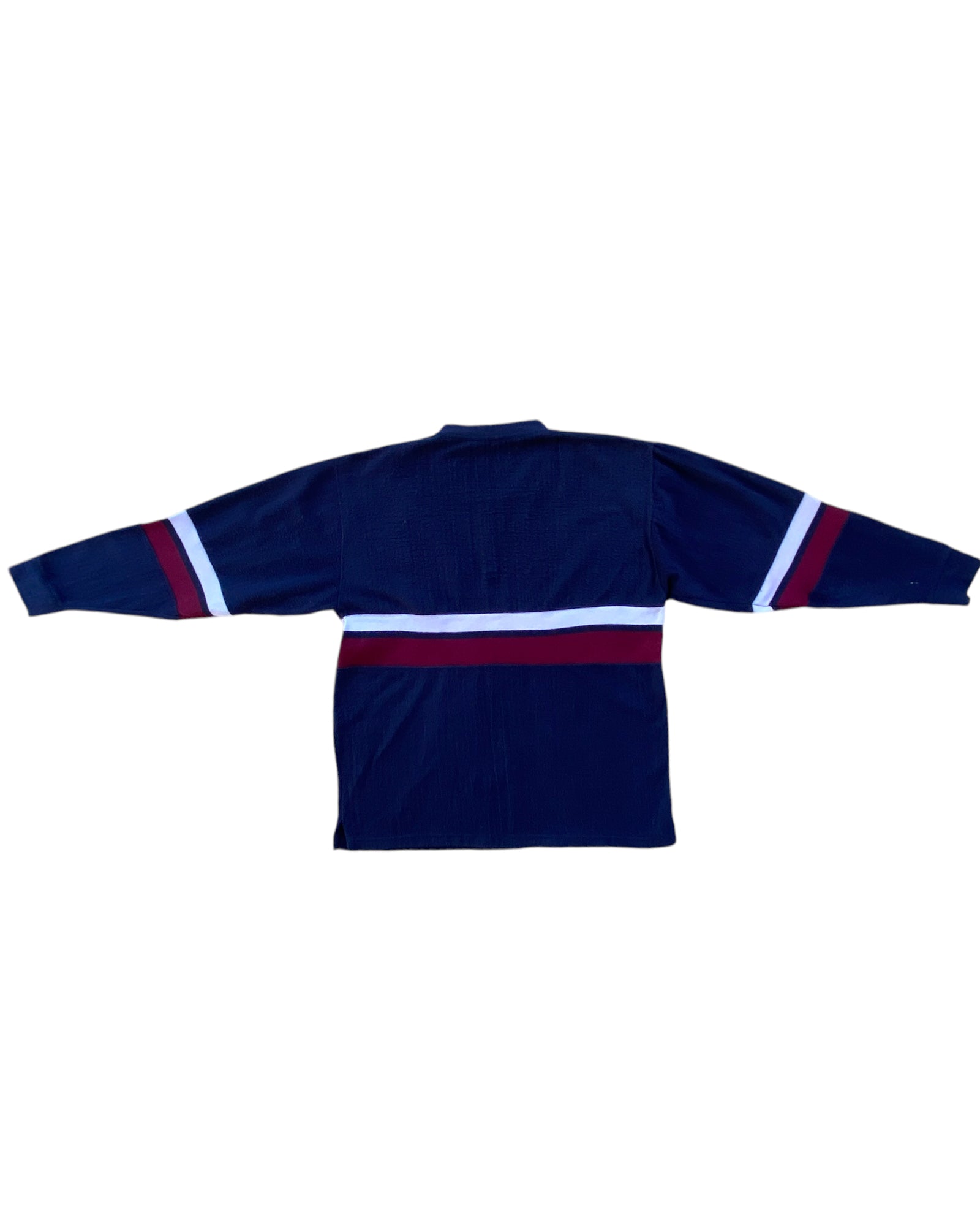 SUDADERA DE CUELO V DE TELA SUPER SUAVE Y PELUDITA CON LINEA BLANCA Y ROJA BORDADA EN EL MEDIO. SIN DETALLES DE USO.