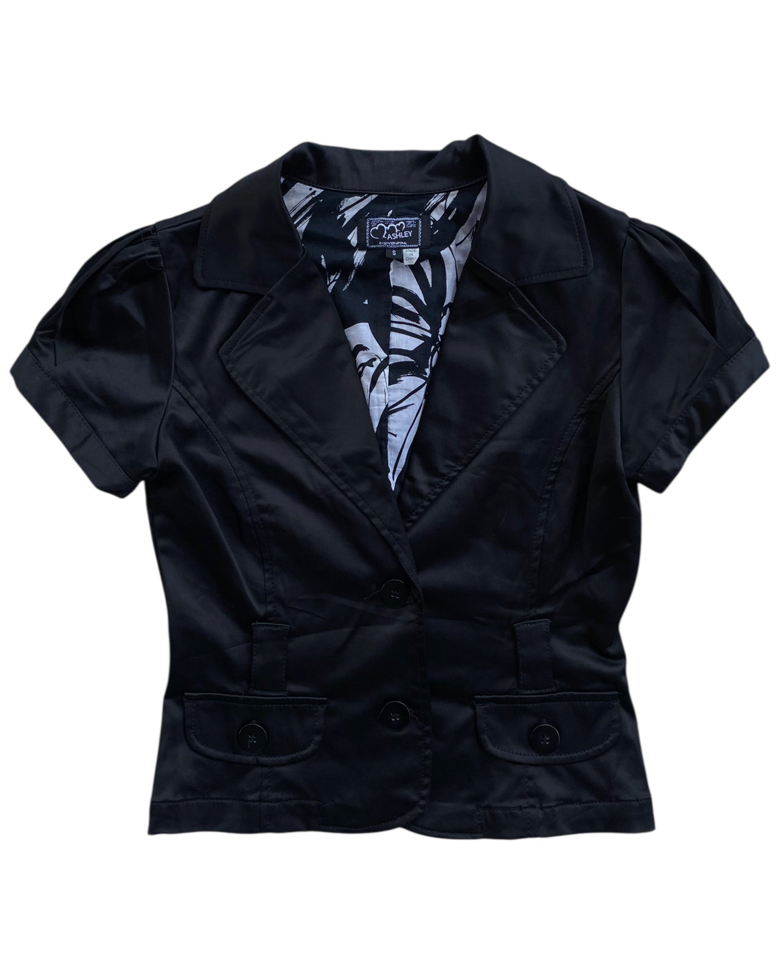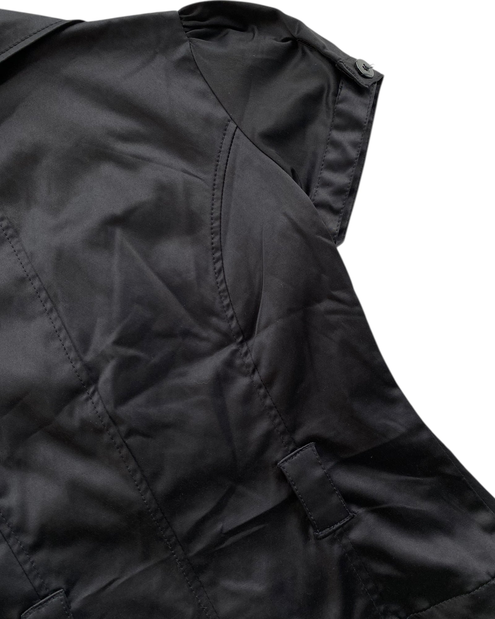 CHALECO DE MANGA CORTA EN NEGRO CON ACABADO SATINADO Y CUELLO EN V CON DOS BOTONES GRANDES NEGROS EN EL PECHO. BOLSAS MINIS A LOS LADOS NO FUNCIONALES, 55% ALGODON, 40% POLYESTER Y 5% SPANDEX, EN PERFECTO ESTADO.