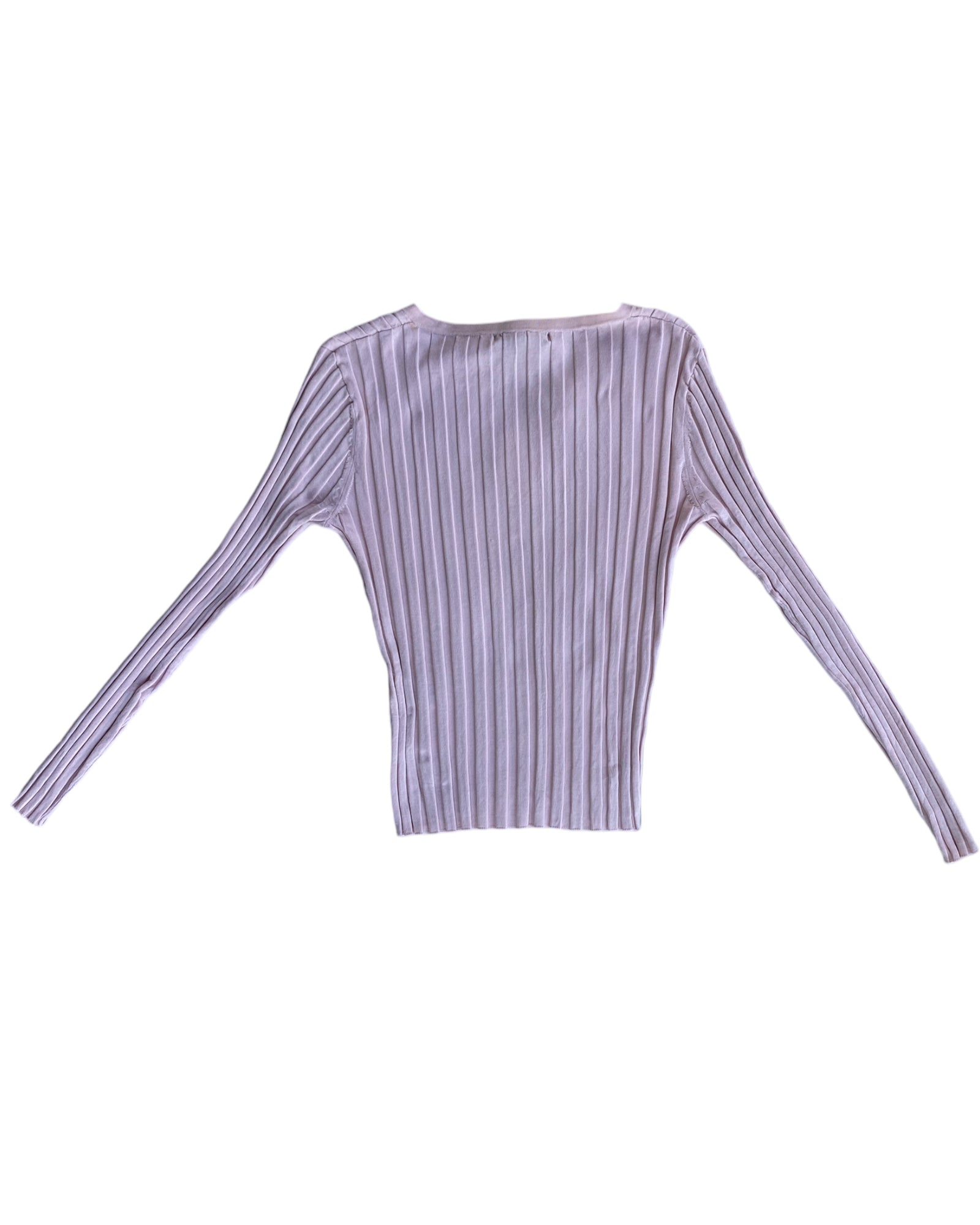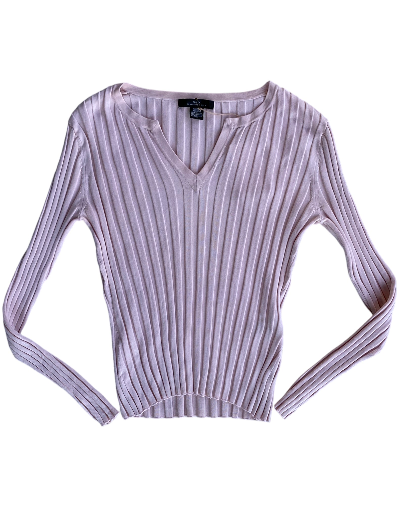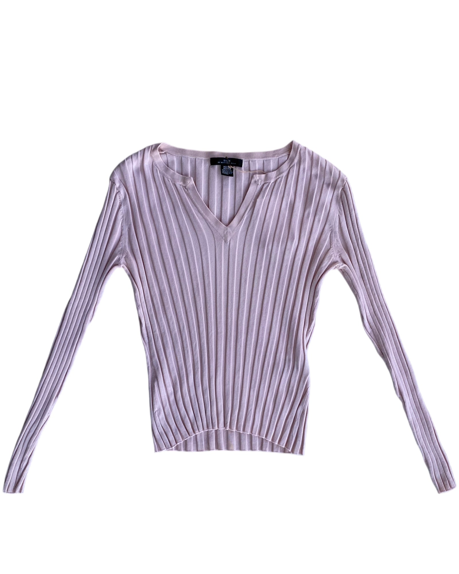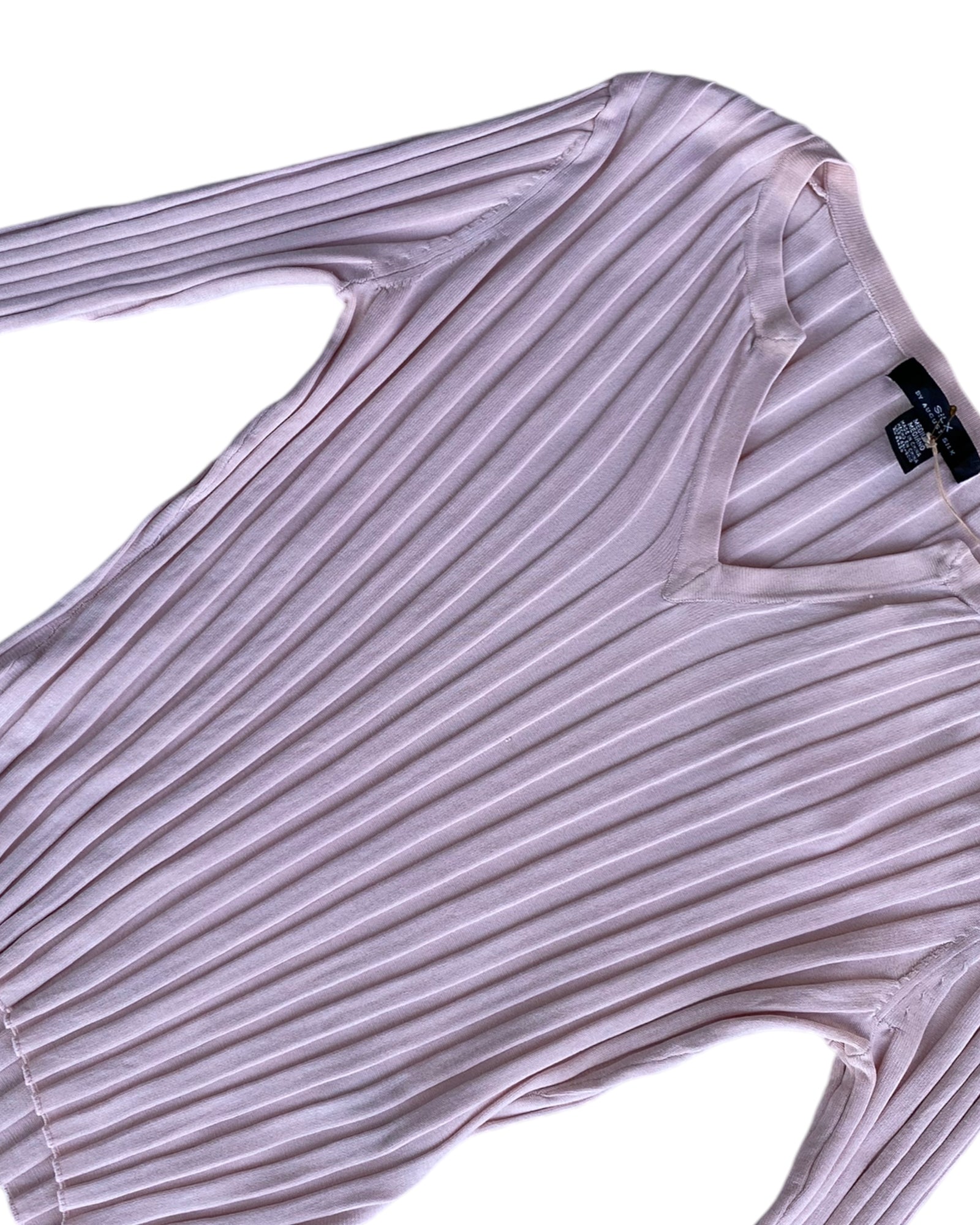 TOP DE PUNTO ROSA CLARO 53% SEDA, 26% NYLON, 21% RAYON CON RAYAS VERTICALES PARTE DEL TIPO DE PUNTO, CUELLO EN V, MANGA LARGA. SIN DETALLES DE USO.