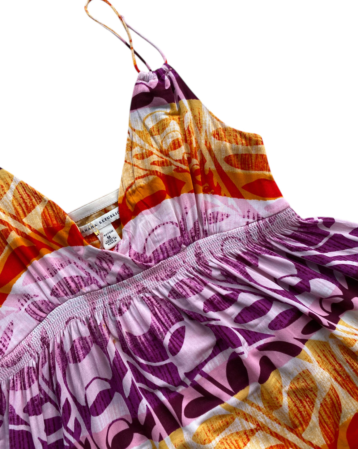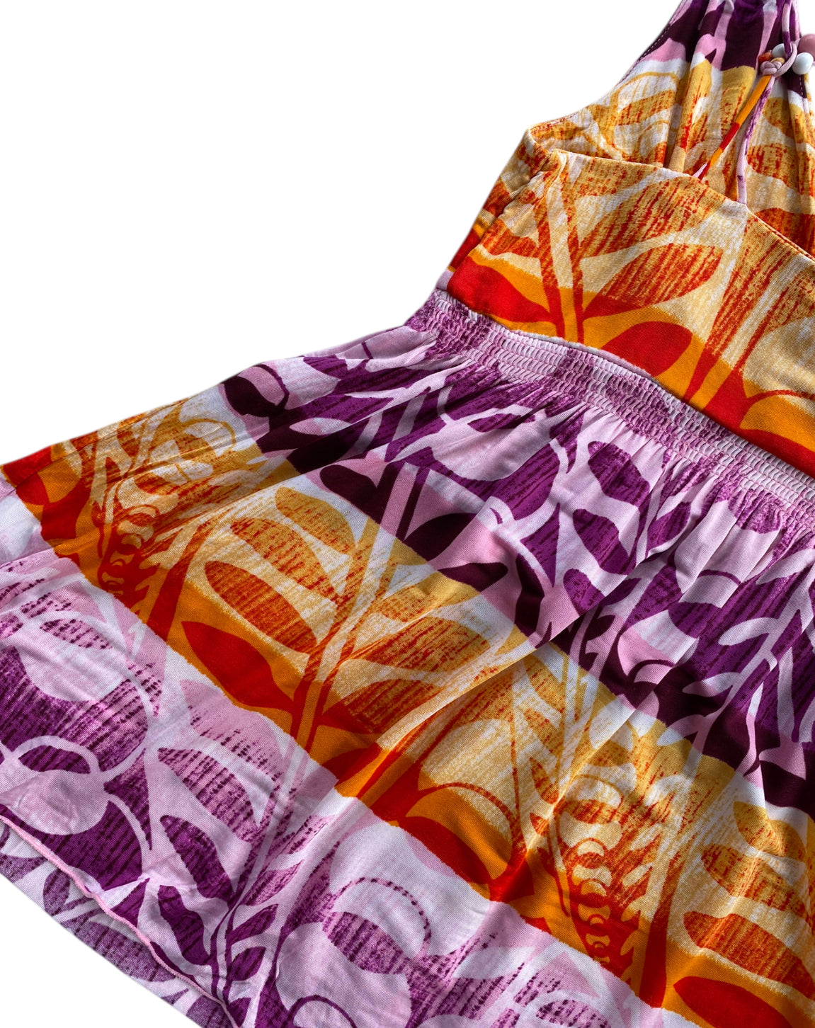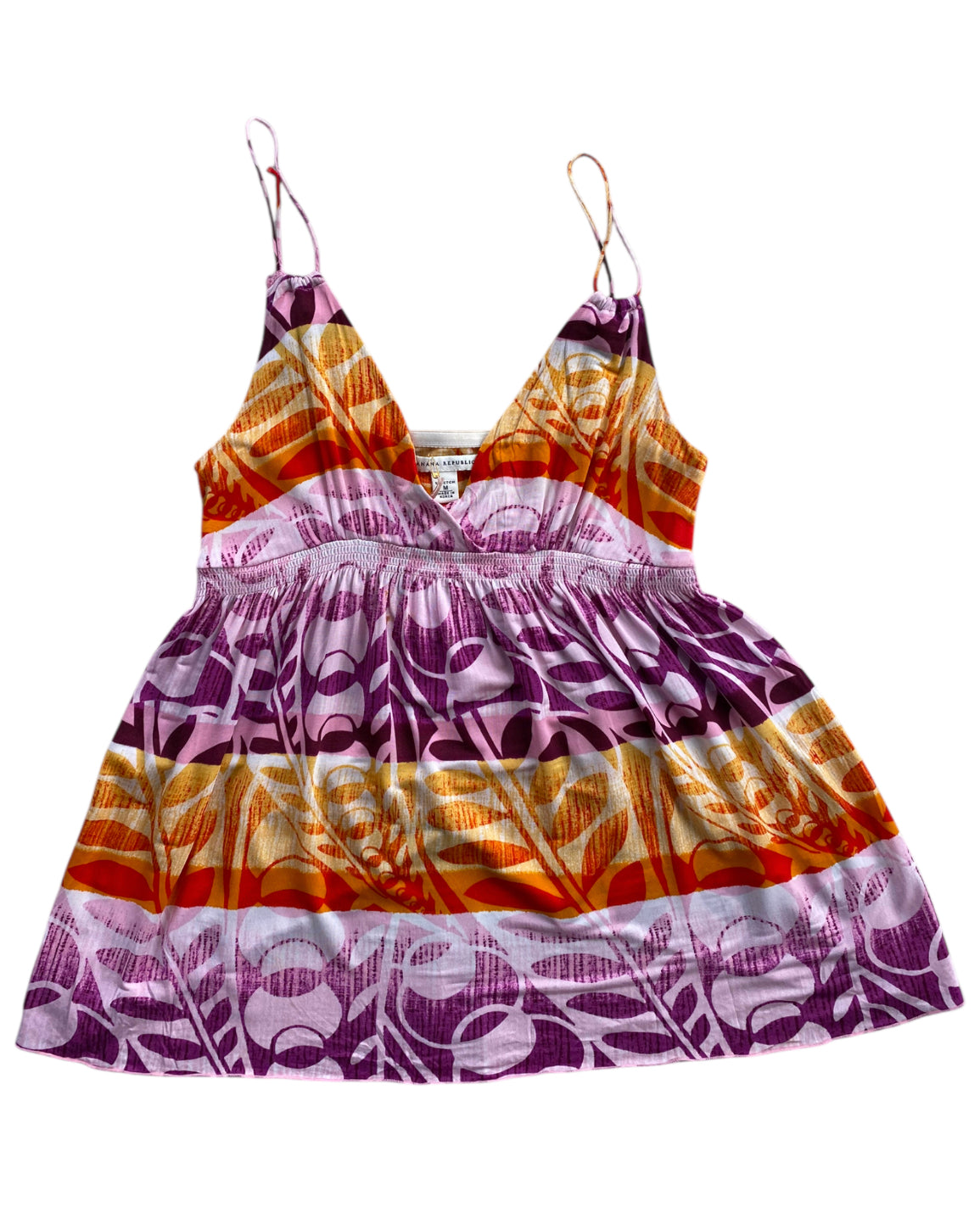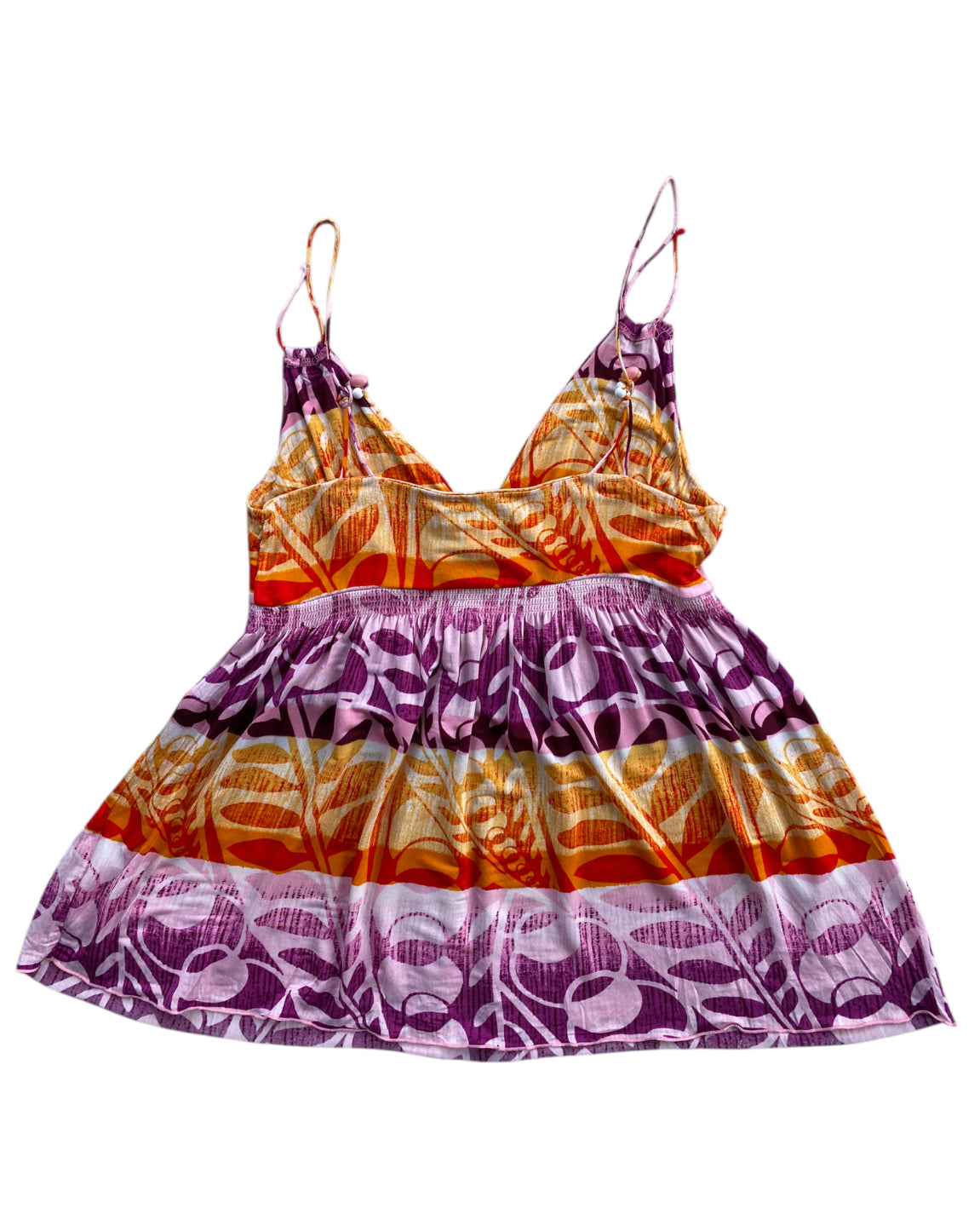 TOP 92% RAYÓN Y 8% SPANDEX CON PRINT EN COLOR MORADO Y NARANJA Y TIRANTES MUY DELGADOS CON CUENTAS NO AJUSTABLES, CUELLO BAJO, NO TIENE DETALLES, EN PERFECTO ESTADO.