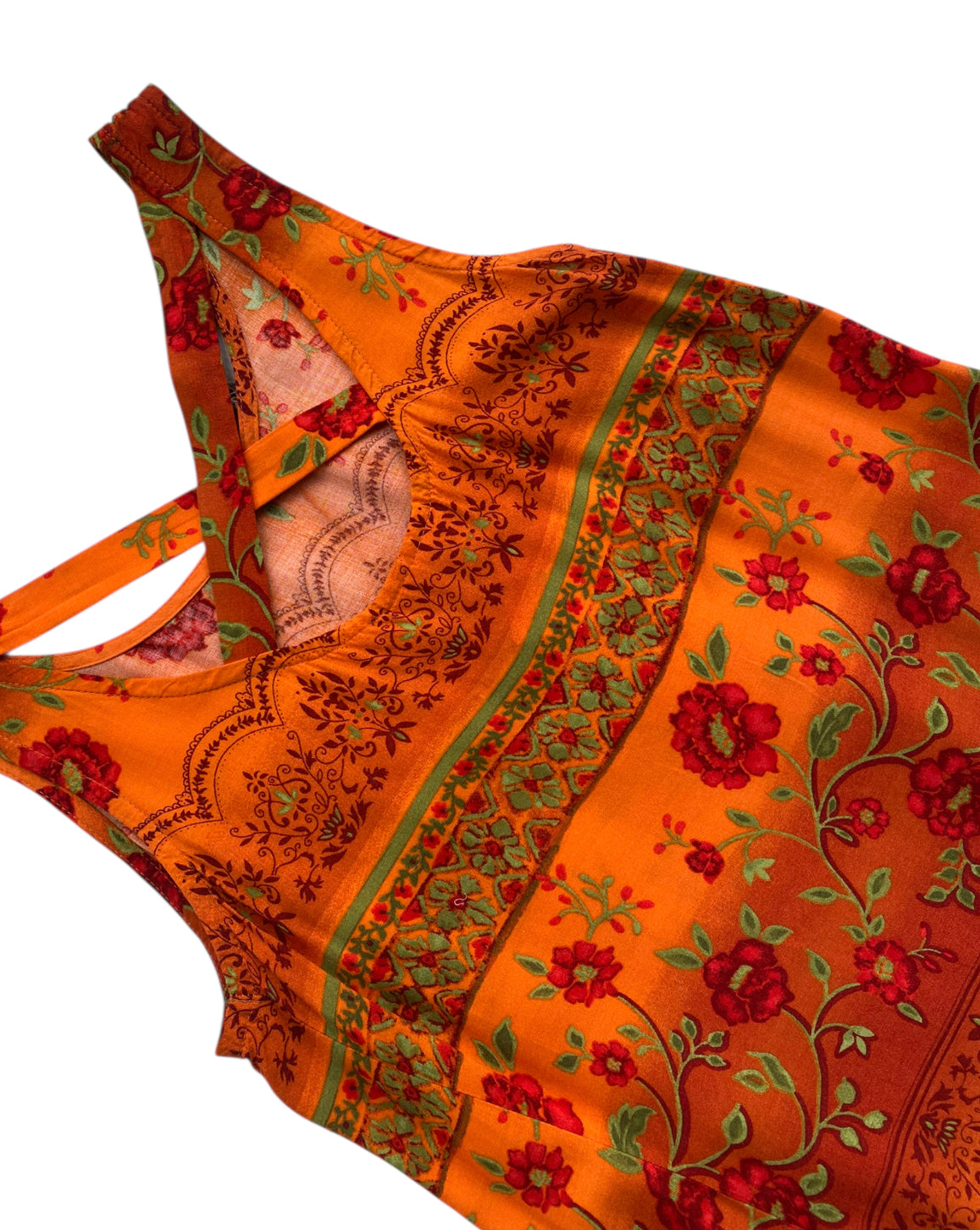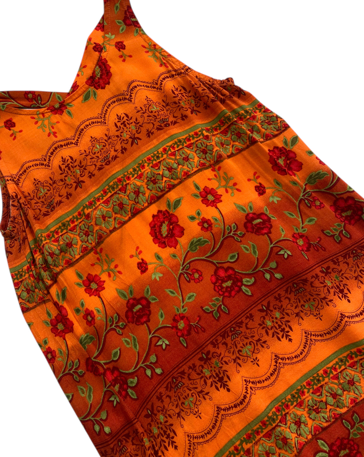 VESTIDO 100% RAYON EN COLOR NARANJA CON PRINT DE FLORES EN PATRON VERTICAL EN COLOR ROJO Y VERDE. ESPALDA CON LINEAS CRUZADAS, NO TIENE DETALLES, EN PERFECTO ESTADO.