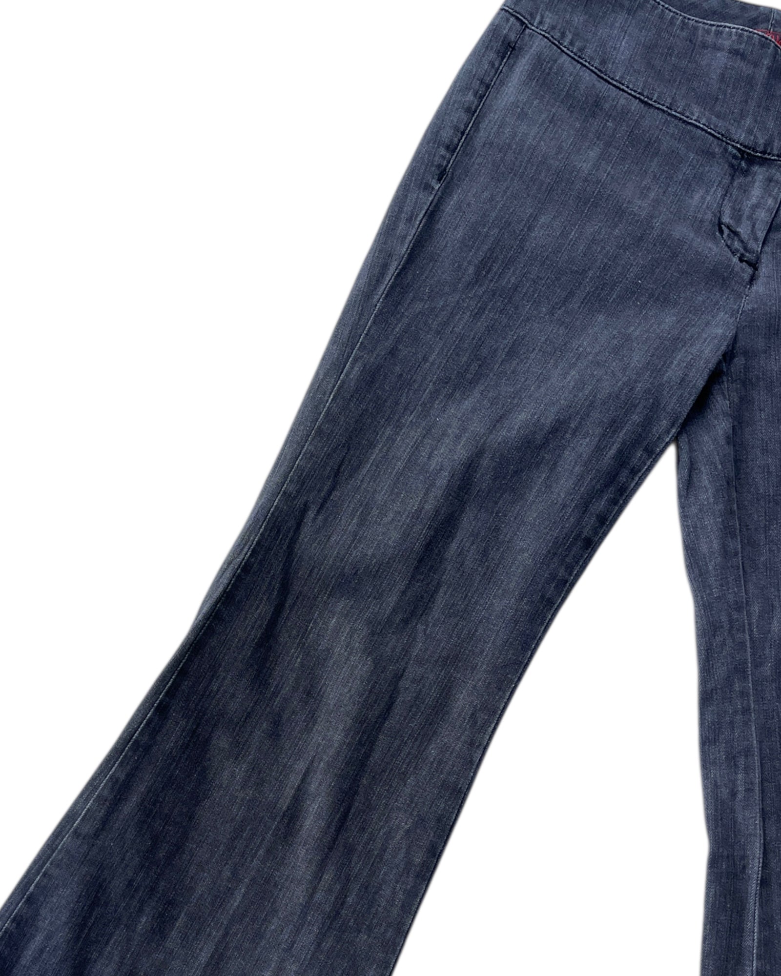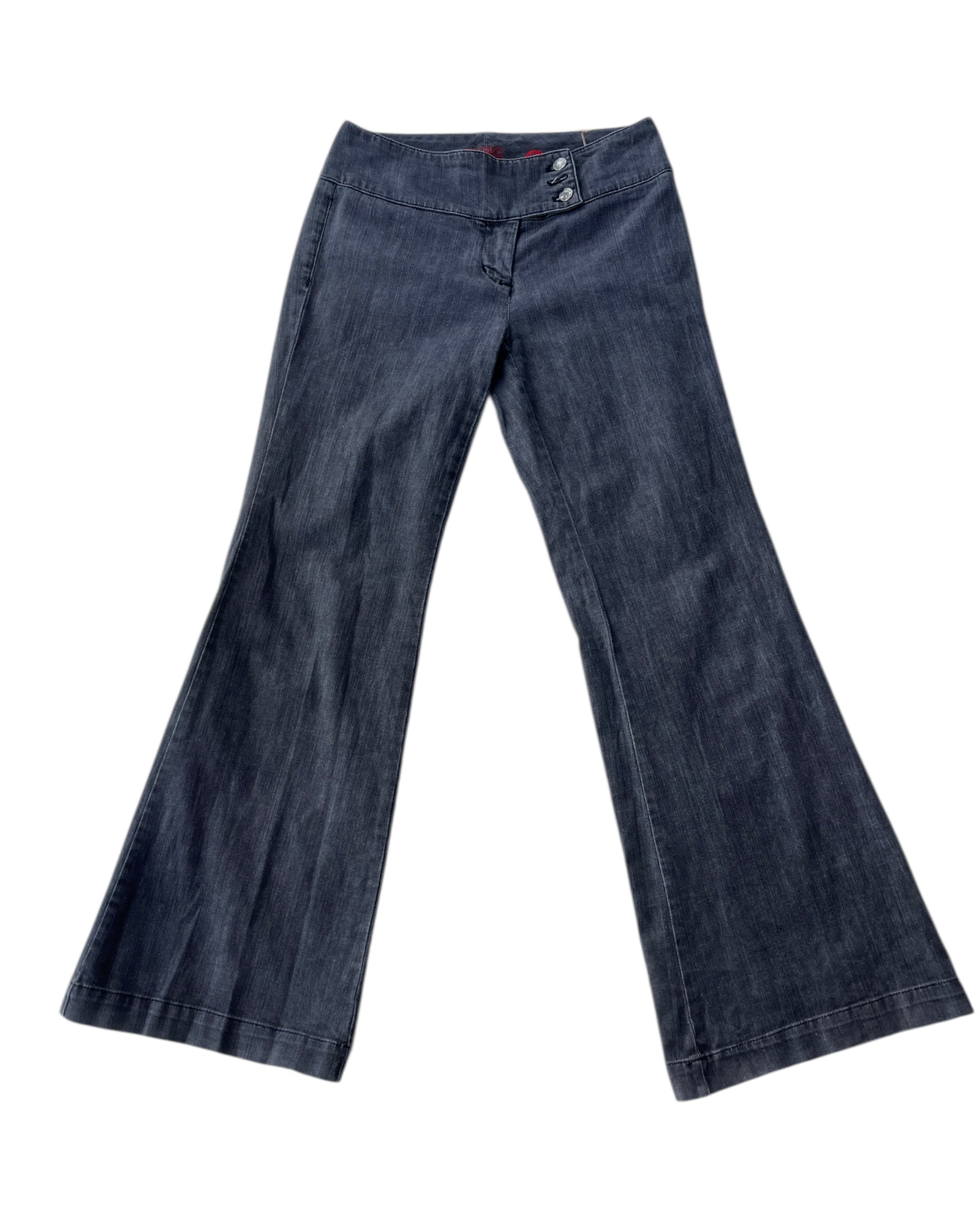 JEANS FLARE EN COLOR GRIS OXFORD CON CINTURA ANCHA CON TRES BOTONES PARA AMARRAR, SIN BOTONES EN LA PARTE TRASERA 99% ALGODON Y 1% SPANDEX, NO TIENE DETALLES, EN PERFECTO ESTADO.