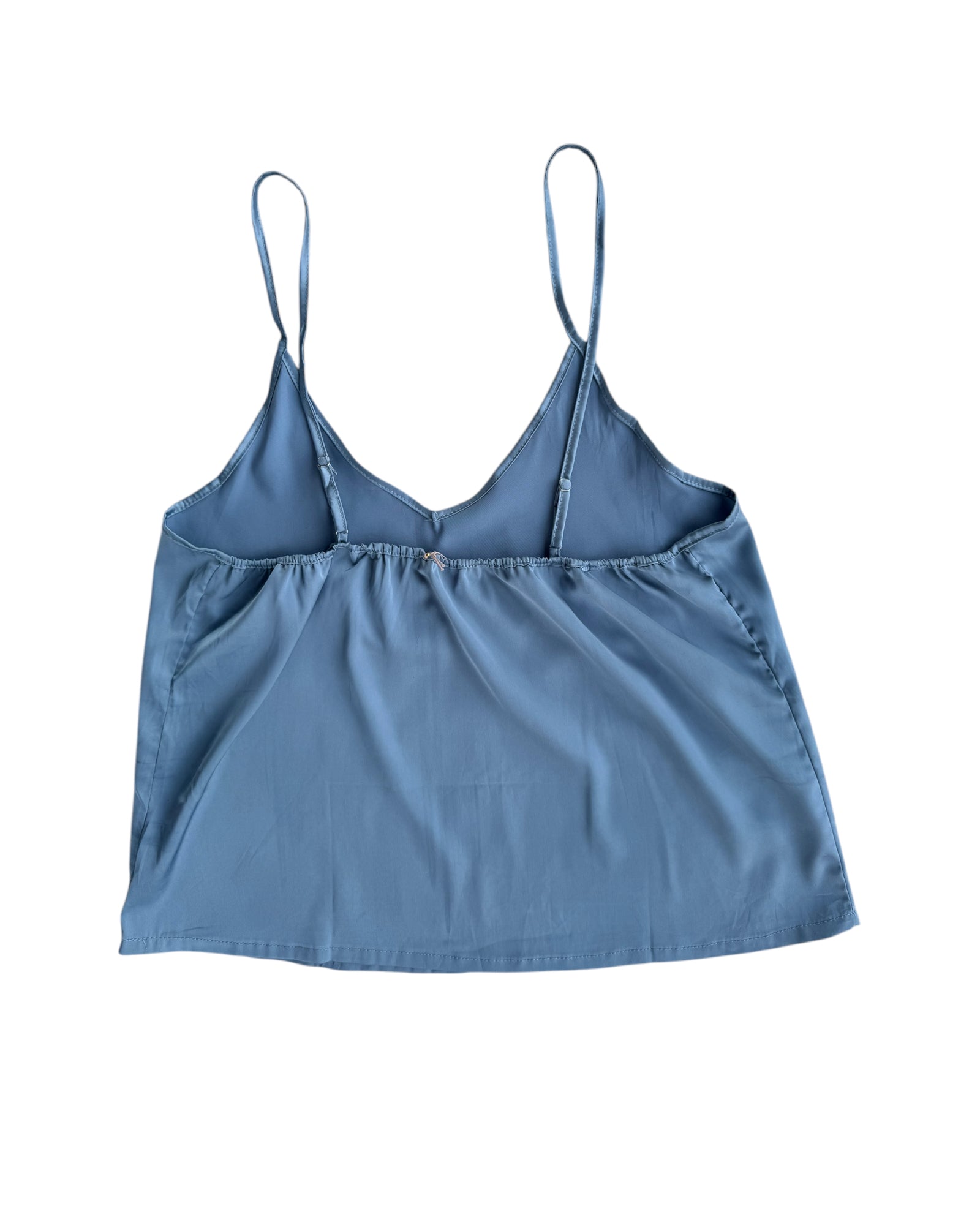 TOP TIPO LENCERO SIMILANDO SEDA AZUL CIELO CON CUELLO EN PICO Y TIRANTES AJUSTABLES. EN MUY BUEN ESTADO