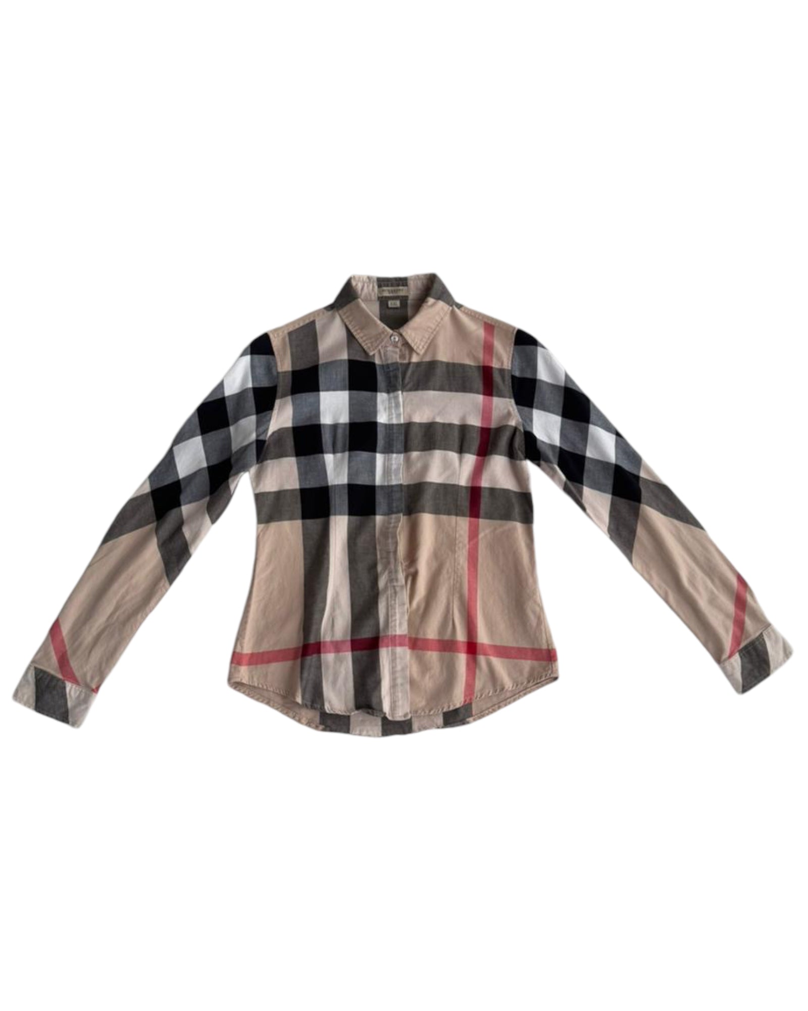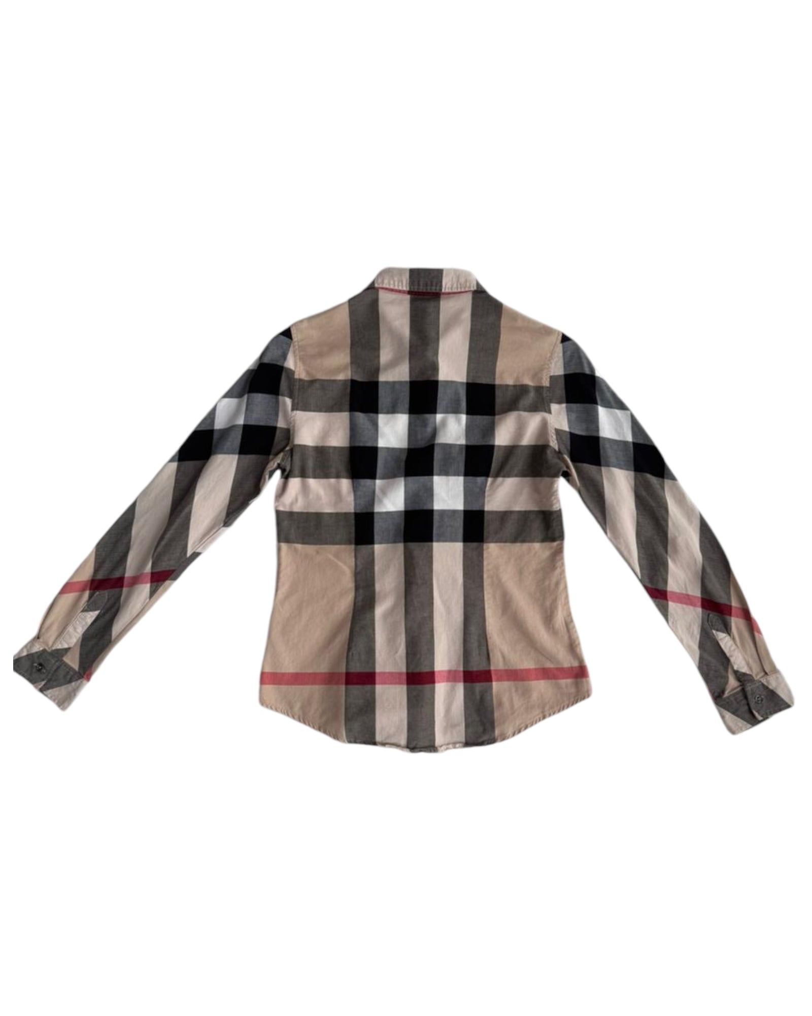 CAMISA BURBERRY BRIT 100% ALGODON CON PRINT ICONICO DE CUADROS CAFE, NEGRO Y ROJO. BOTONES CENTRALES PLATEADOS. SIN DETALLES DE USO.