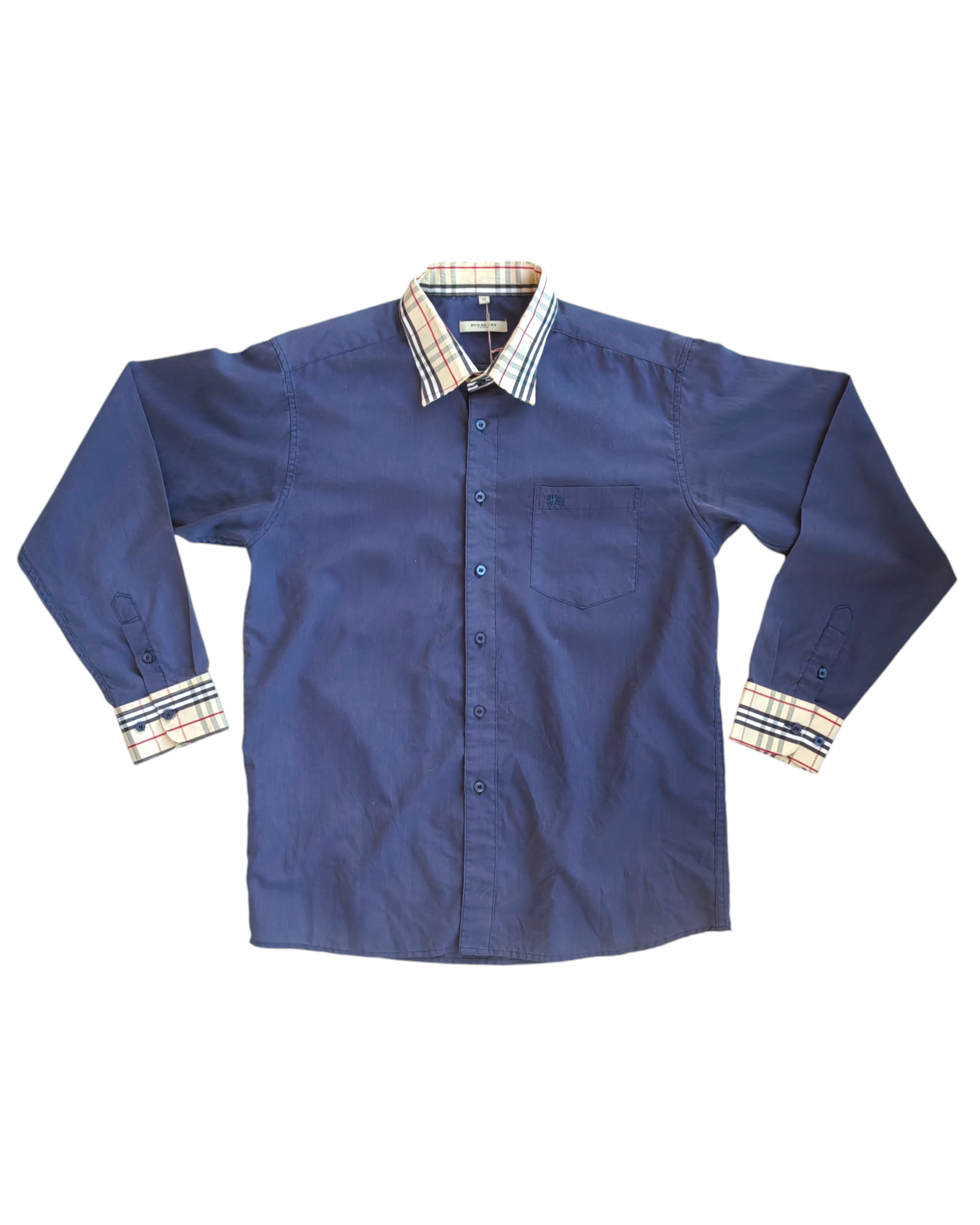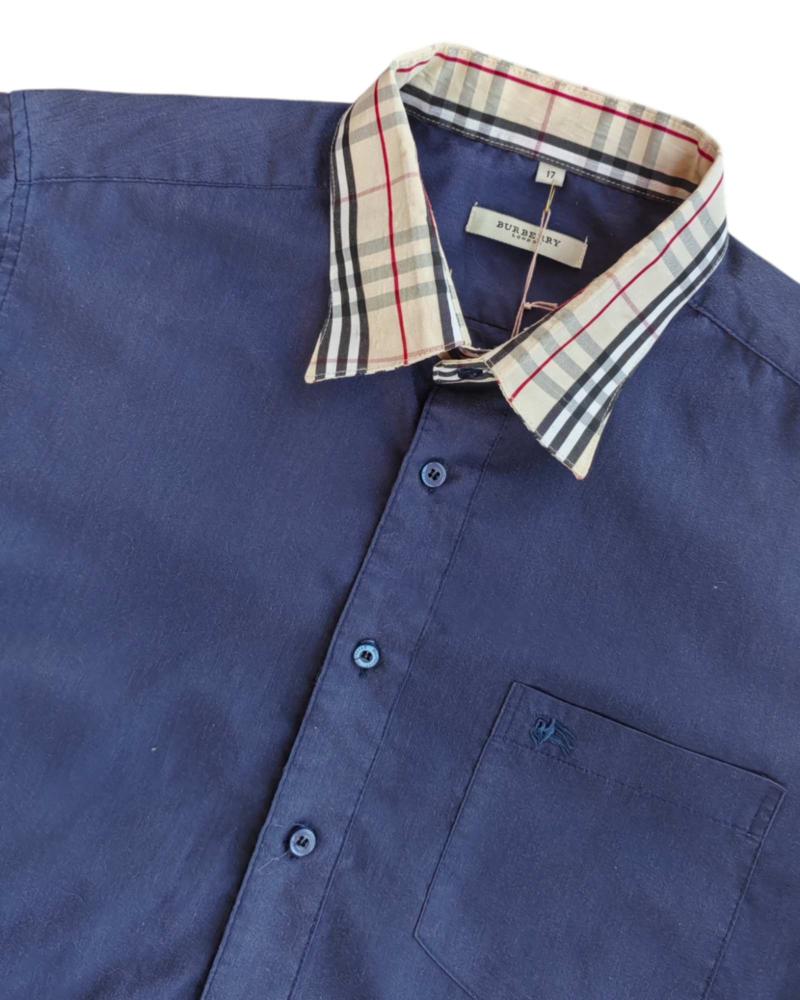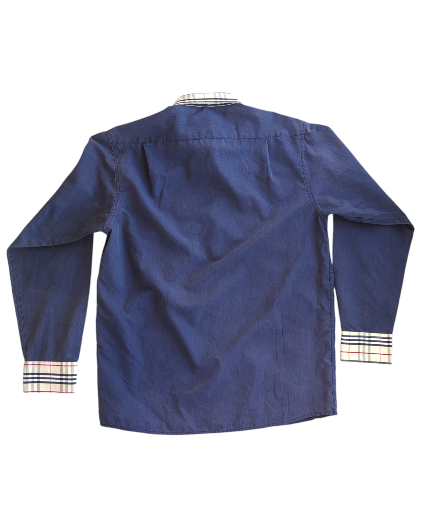 CAMISA AZUL OSCURO CON DETALLE EN PUÑOS Y CUELLO DE PRINT CLASICO DE BURBERRY. BORDADO DEL LOGO DE BURBERRY EN BOLSILLO FUNCIONAL DEL LADO IZQUIERDO. SIN DETALLES DE USO.