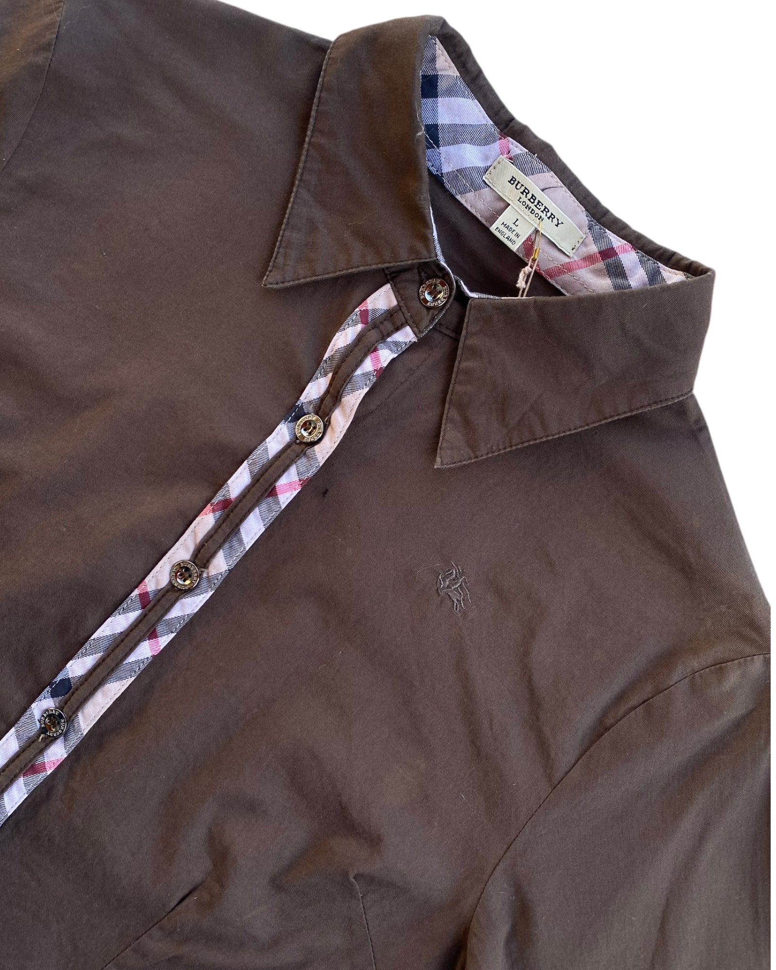 CAMISA CAFE BURBERRY CON PRINT DE CUADROS EN DETALLE EN EL PUÑO Y CUELLO DE BOTONES, 96% ALGODON 4% ELASTANO. SIN DETALLES DE USO.