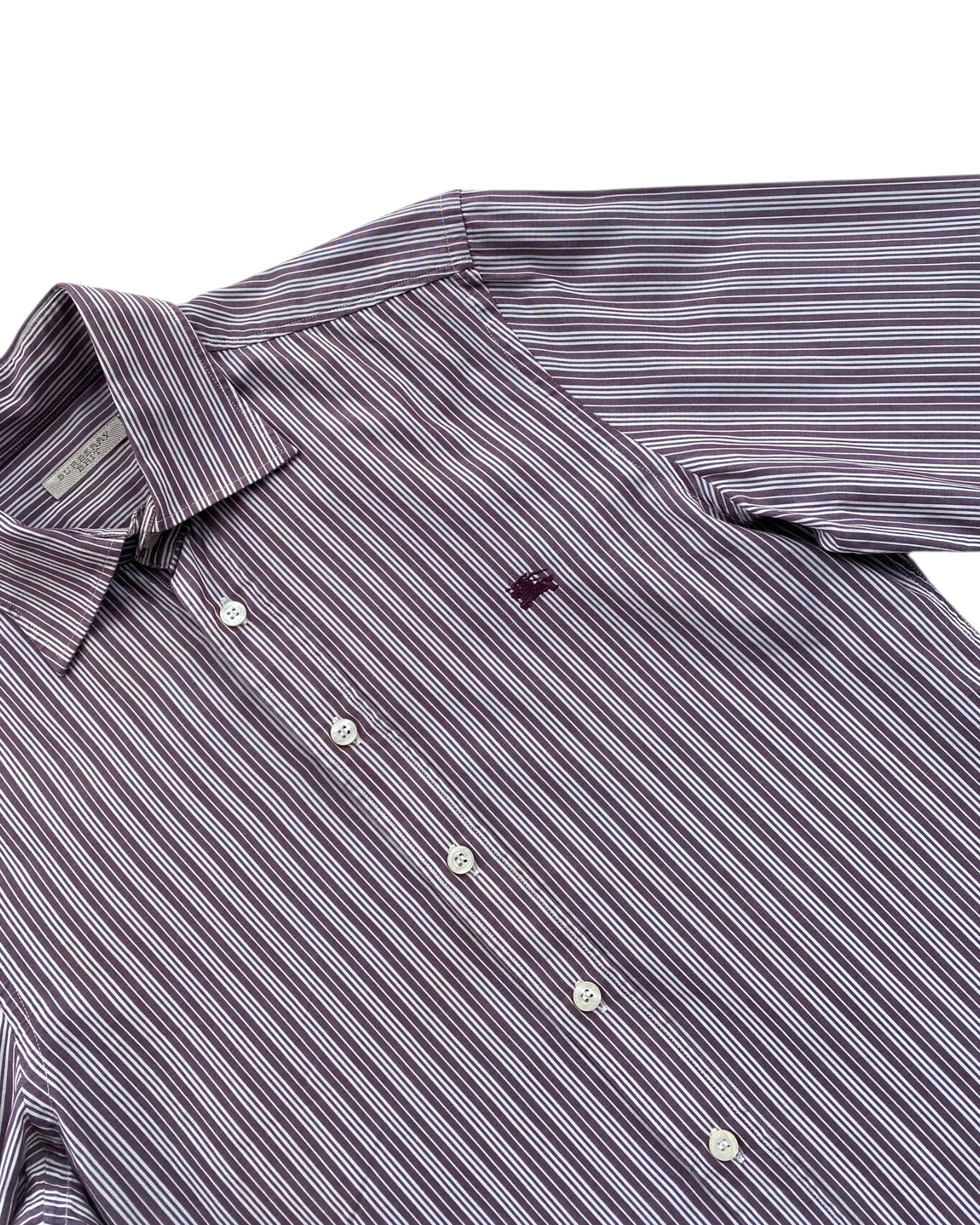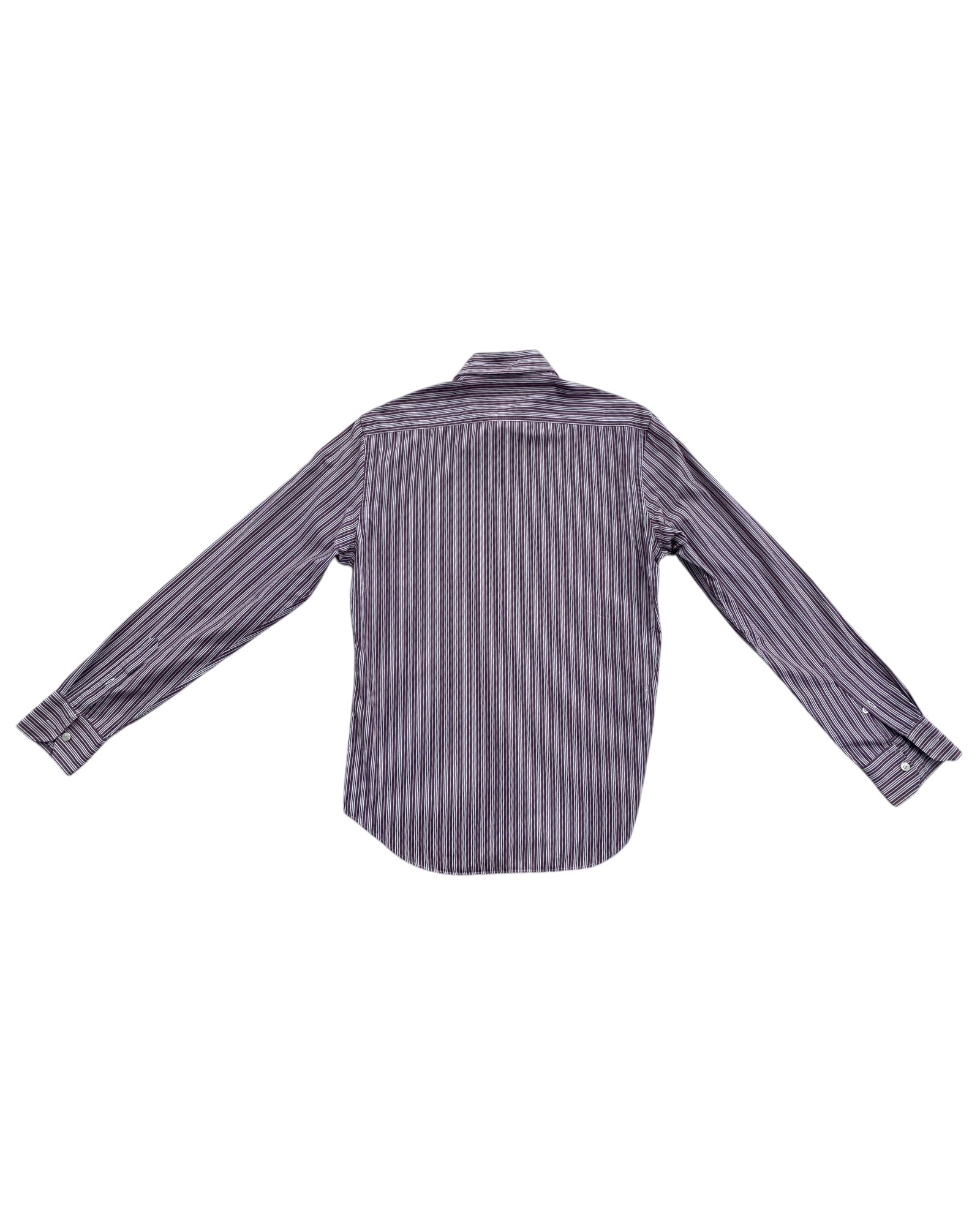 CAMISA 100% ALGODON DE RAYAS VERTICALES DE COLOR VINO Y BLANCAS CON LOGO BORDADO EN EL LADO IZQUIERDO EN COLOR VINO, NO TIENE DETALLES, EN PERFECTO ESTADO.