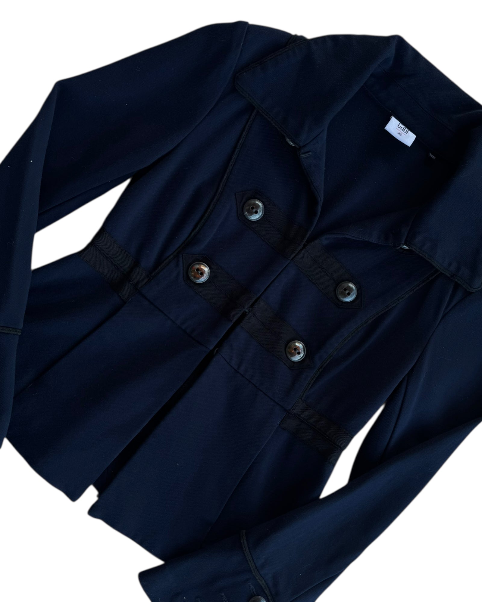 CHAMARRA EN COLOR AZUL MARINO CON CUELLO CON SOLAPA Y CUATRO BOTONES NEGROS EN EL PECHO, 78% RAYÓN, 19% NYLON Y 3% SPANDEX, LIGERA PARA EL OTOÑO. NO TIENE DETALLES, EN PERFECTO ESTADO.