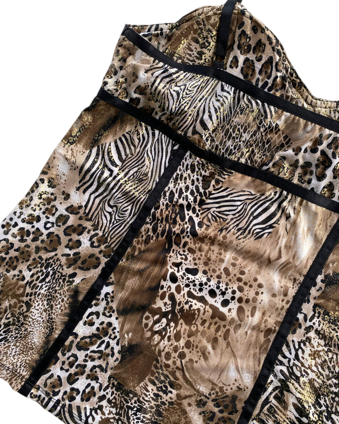 TOP 96% POLYESTER Y 4% SPANDEX DE TELA METÁLICA CON TIRANTES NEGROS AJUSTABLES Y PUSH UP, PRINT ANIMAL DE LEOPARDO, SERPIENTES Y ZEBRA, DETALLES ESTILO VARILLAS EN NEGRO, NO TIENE DETALLES, EN PERFECTO ESTADO.