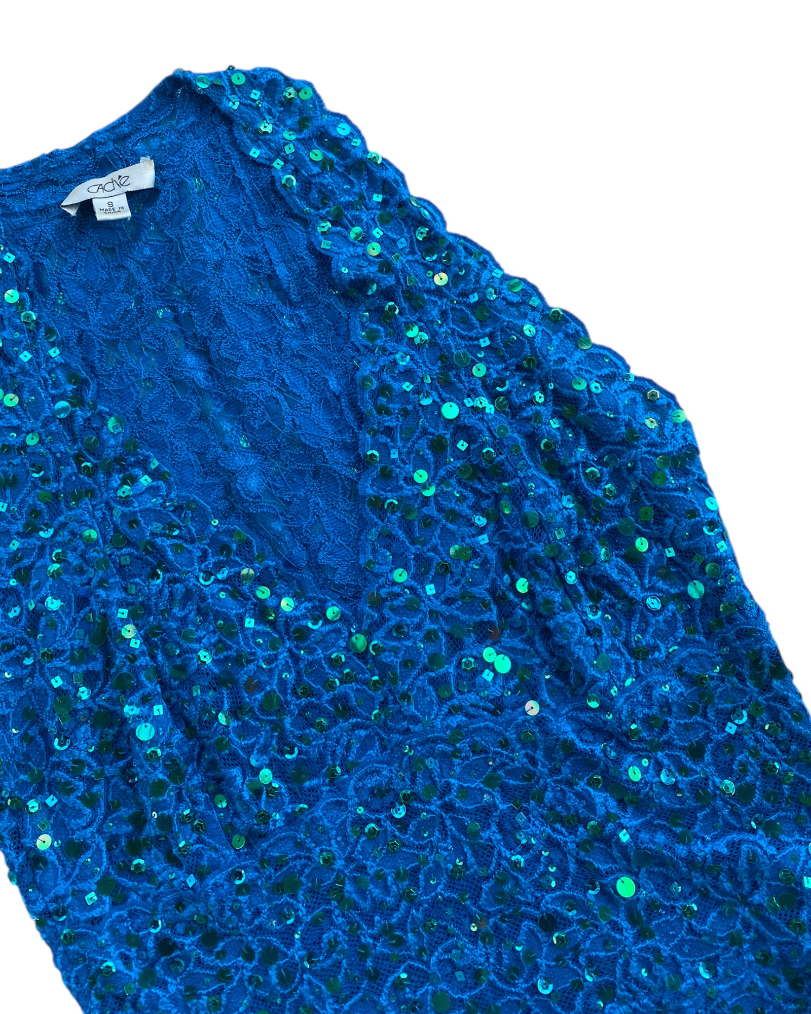 TOP DE ENCAJE 80% NYLON Y 20% LYCRA CON LENTEJUELAS TORNASOL VERDE AZULADAS Y SPANDEX, TRANSPARENTE DEBIDO AL ENCAJE. NO TIENE DETALLES, EN PERFECTO ESTADO.