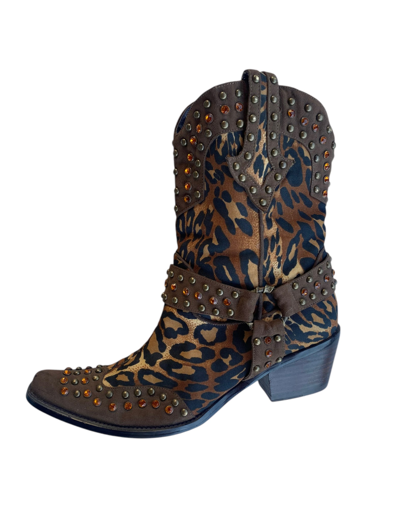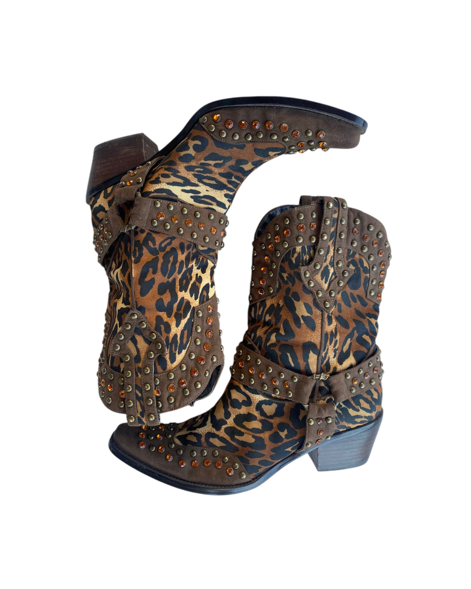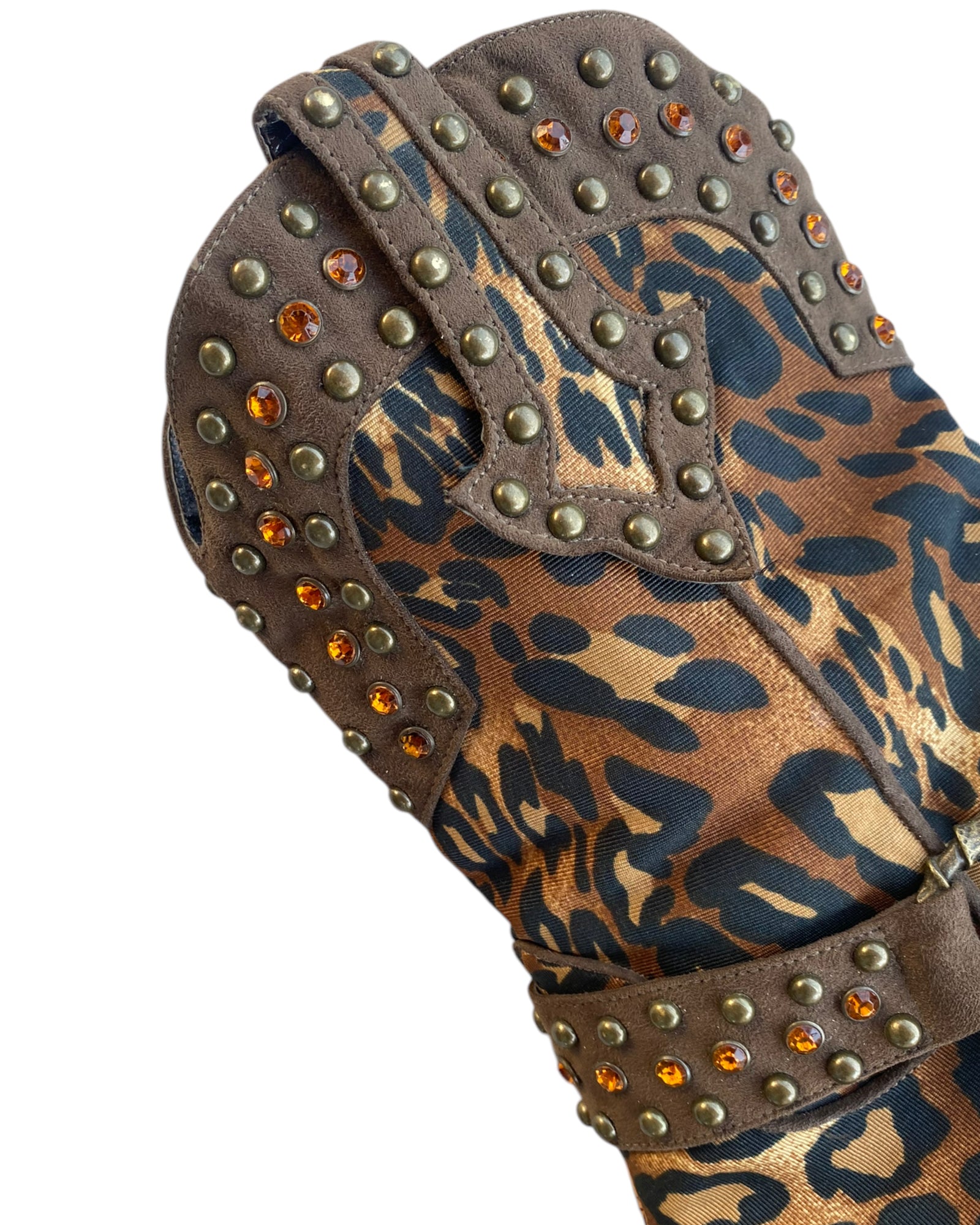 BOTAS VAQUERAS DE ANIMAL PRINT CON PEDRERÍA CAFÉ Y NARANJA Y ESTOPEROLES DORADO CON TACÓN DE 4 CM Y PUNTA LARGA. ESTÁN EN PERFECTAS CONDICIONES
