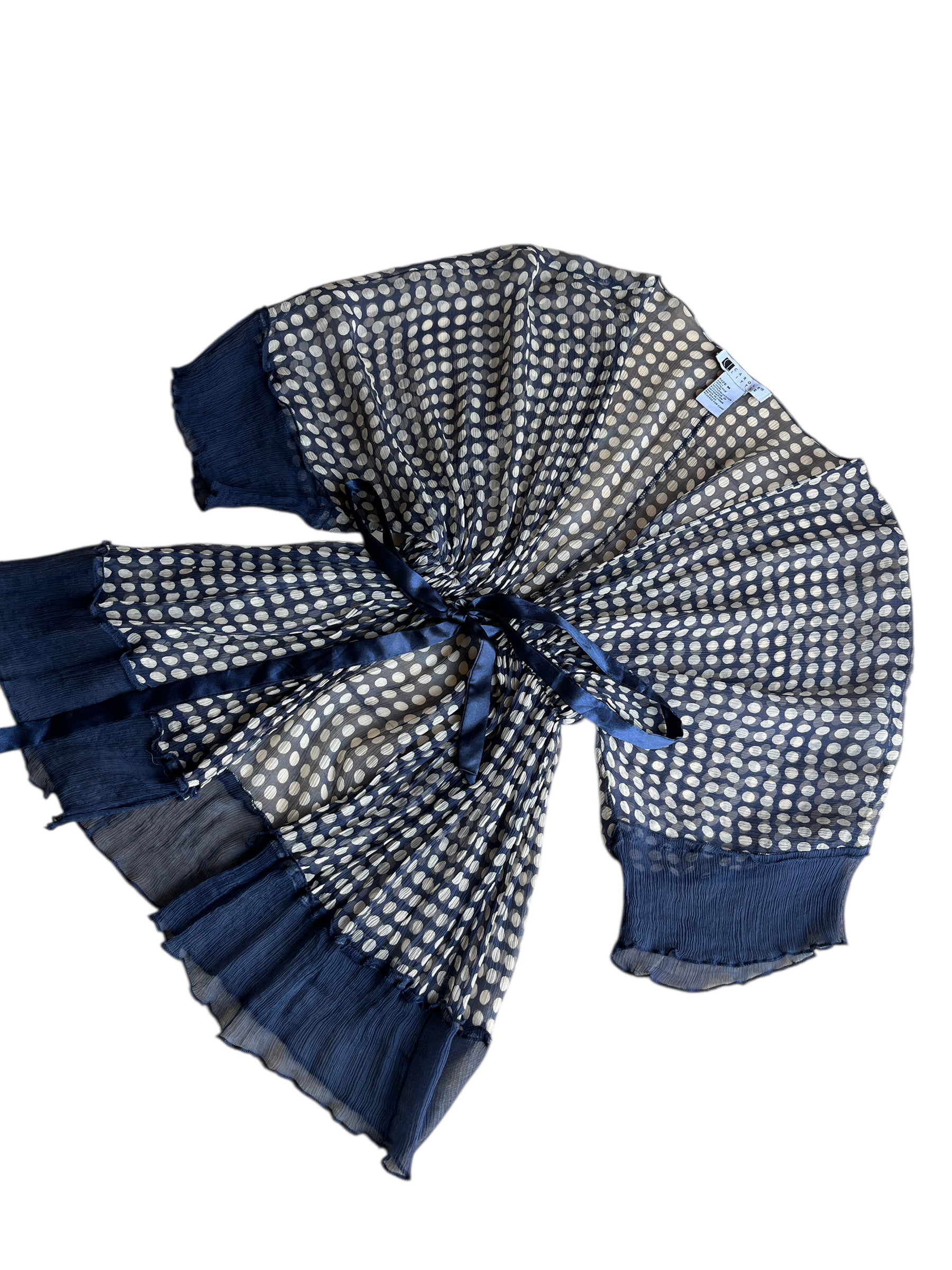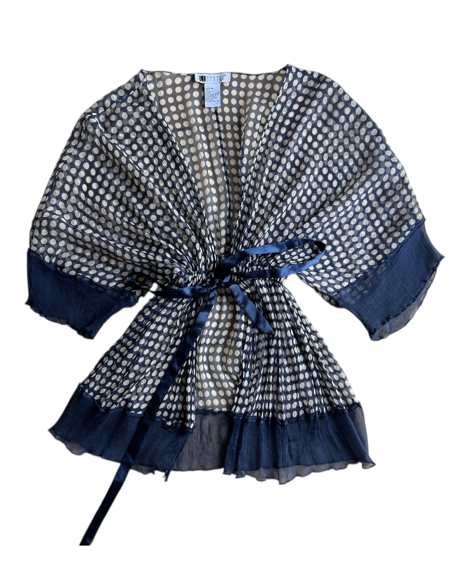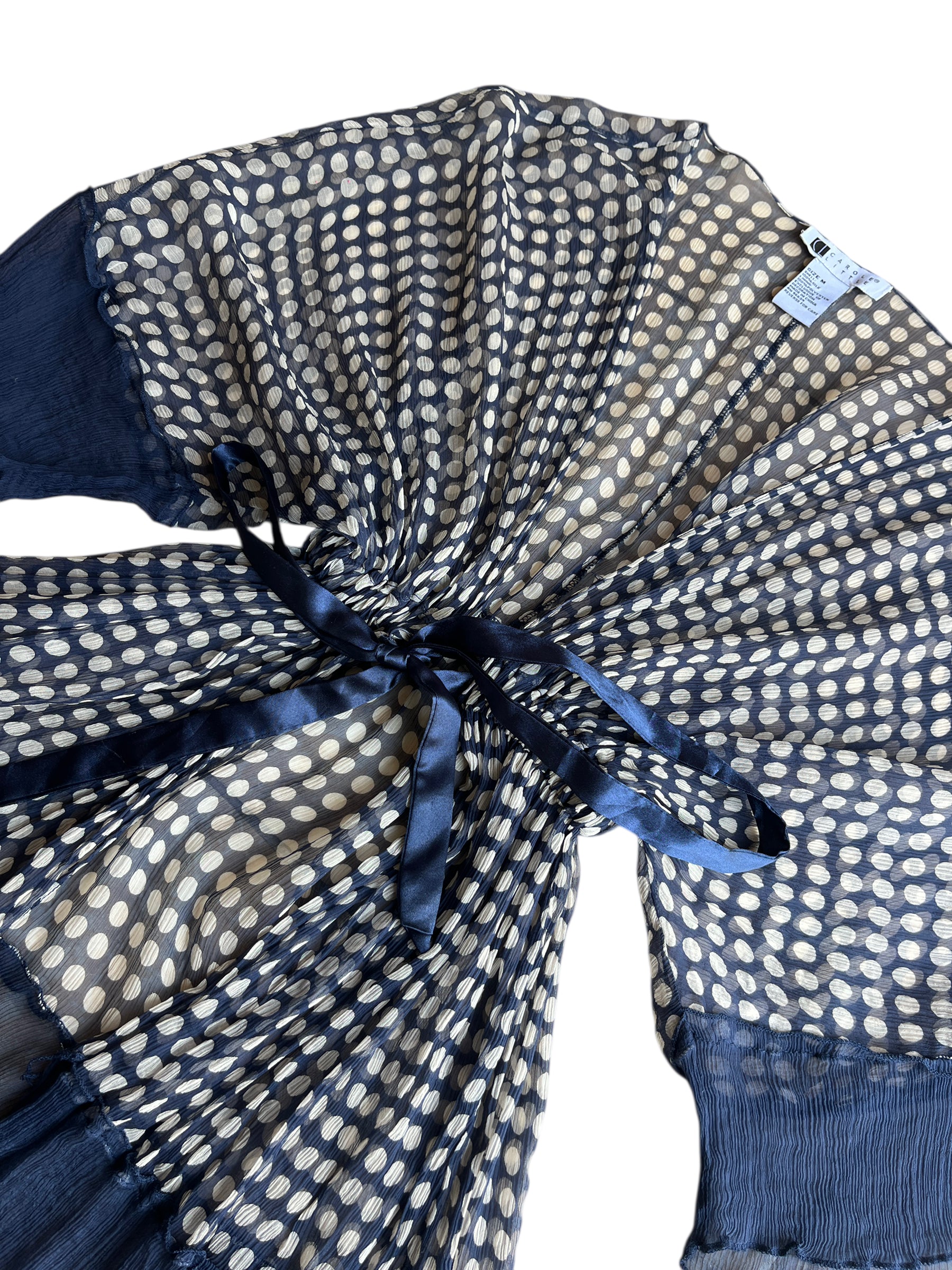 BLUSA 100% SEDA ESTILO LENCERA CON MANGAS DE MURCIÉLAGO Y LISTÓN AZUL MARINO PARA AMARRAR EN EL CENTRO, PATRÓN DE PUNTOS POR TODA LA BLUSA Y DOBLADILLO EN COLOR AZUL MARINO, NO TIENE DETALLES, EN PERFECTO ESTADO.