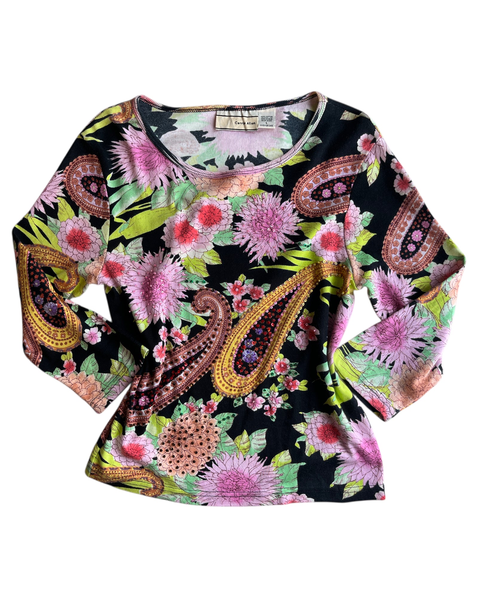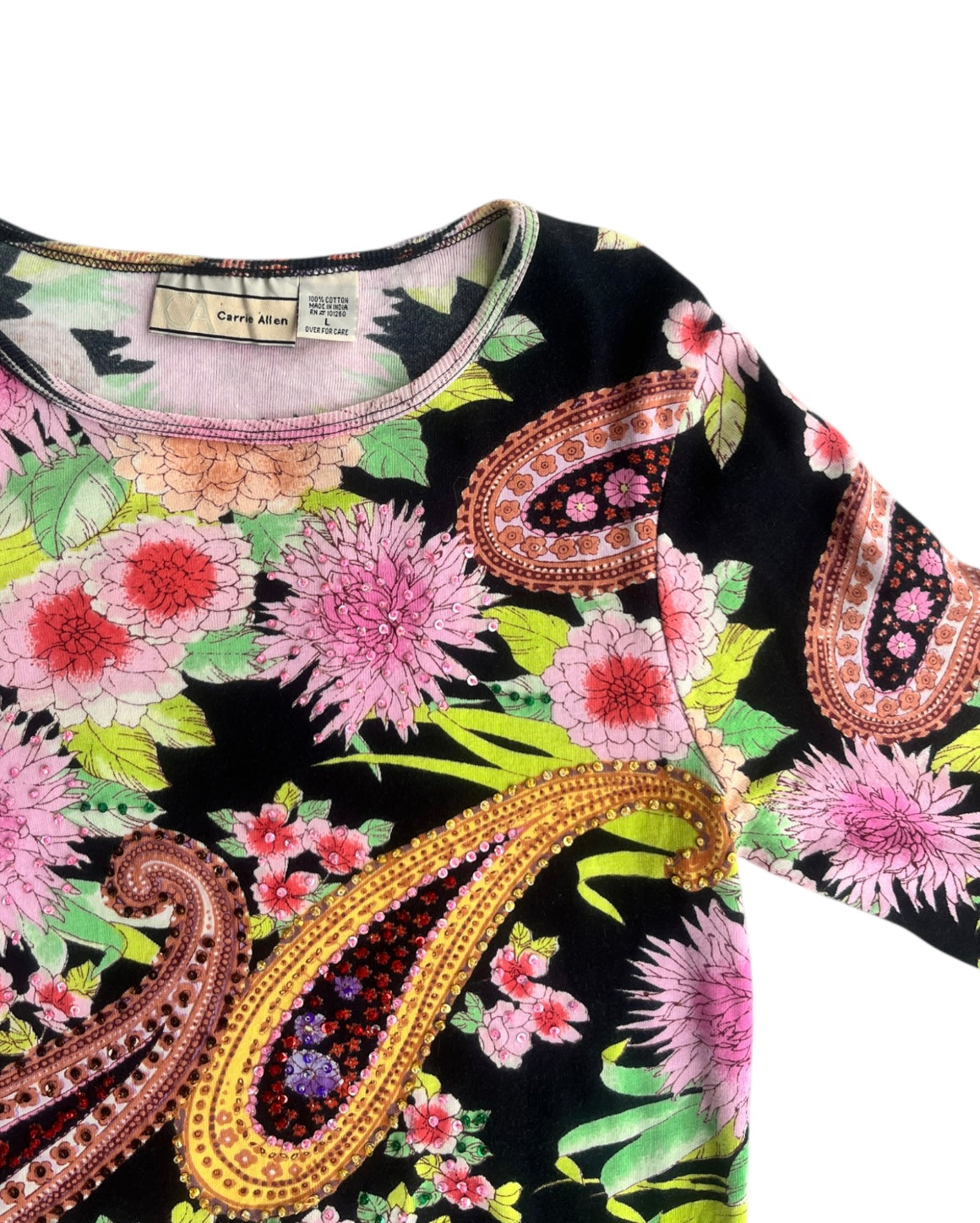 BLUSA 100% ALGODON MANGA LARGA CON CUENTAS ROSAS Y PATRON DE MANDALAS EN DIFERENTES COLORES (ROSA, VERDE, NARANJA, ETC), NO TIENE DETALLES, EN PERFECTO ESTADO.