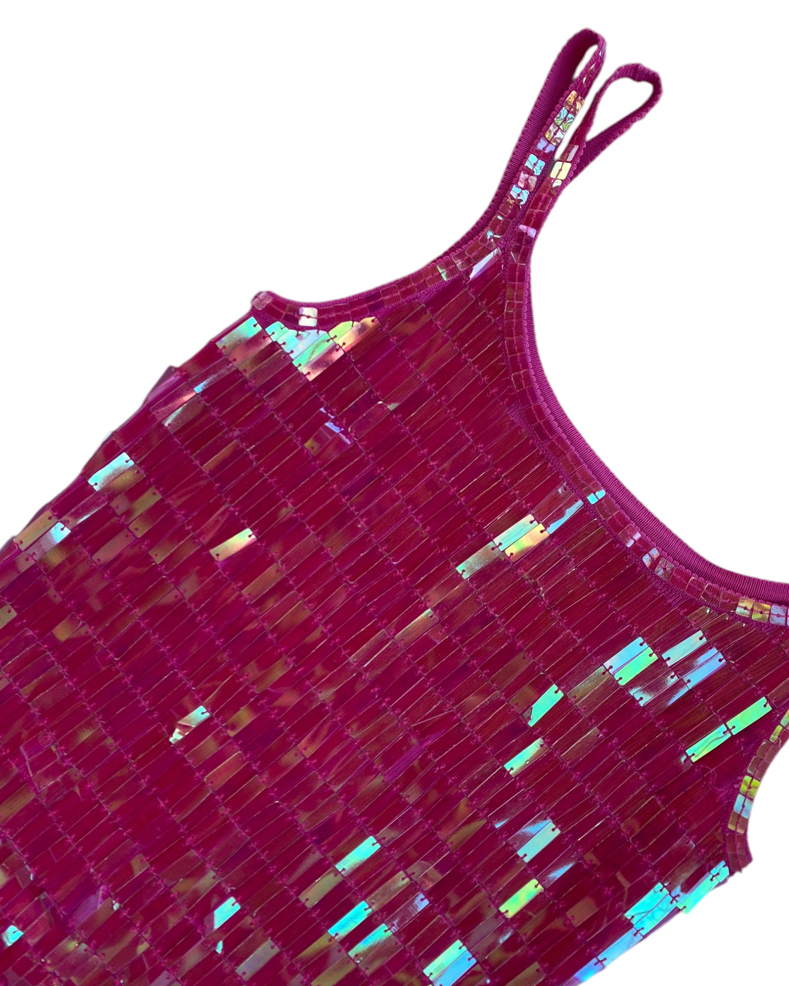TOP DE LENTEJUELAS ROSAS 65% RAYON 35% NYLON Y TELA DE PUNTO DEL MISMO COLOR QUE ESTIRA UN POCO. SIN DETALLES DE USO.
