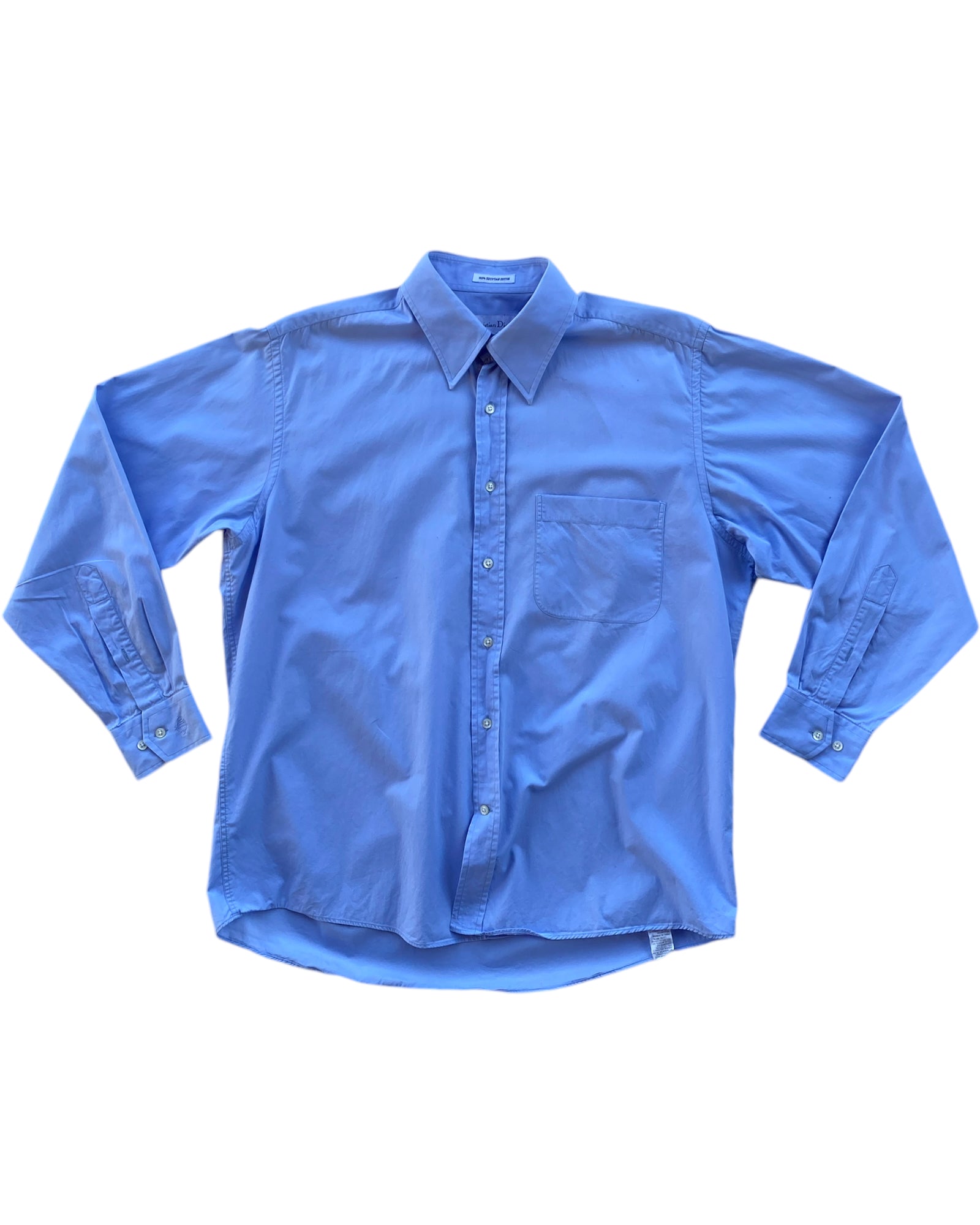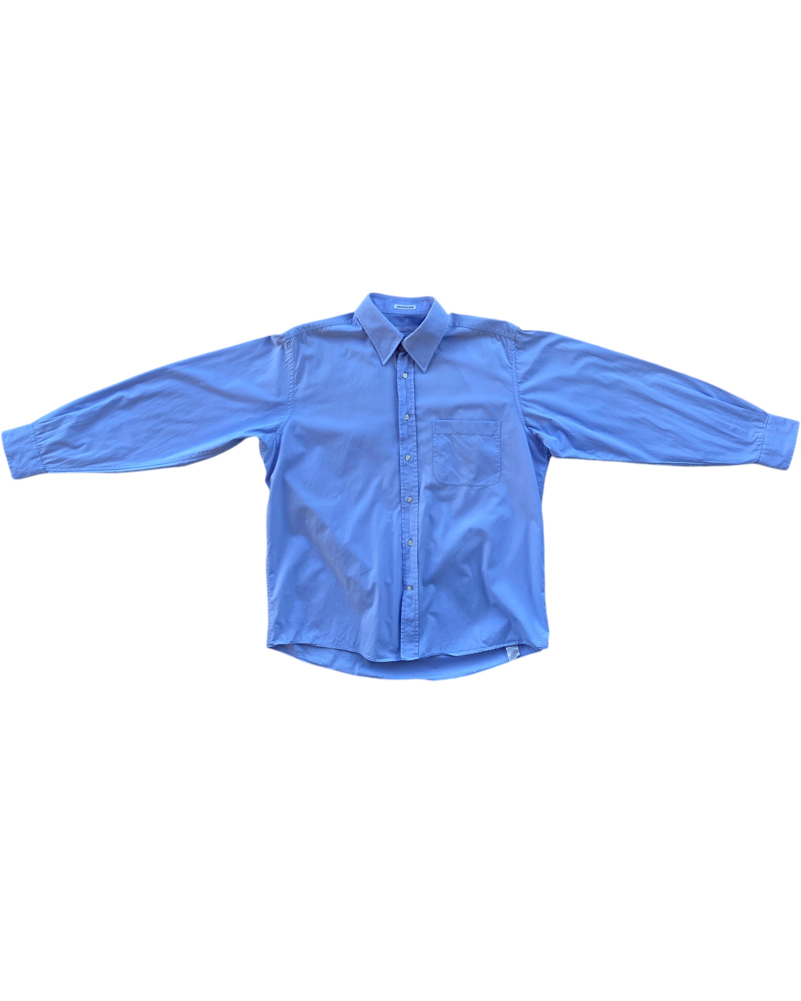 CAMISA 100% ALGODON AZUL CLARO CON TELA DE JAPON, BOLSILLO IZQUIERDO FUNCIONAL Y BOTONES BLANCO- BEIGE. SIN DETALLES DE USO.