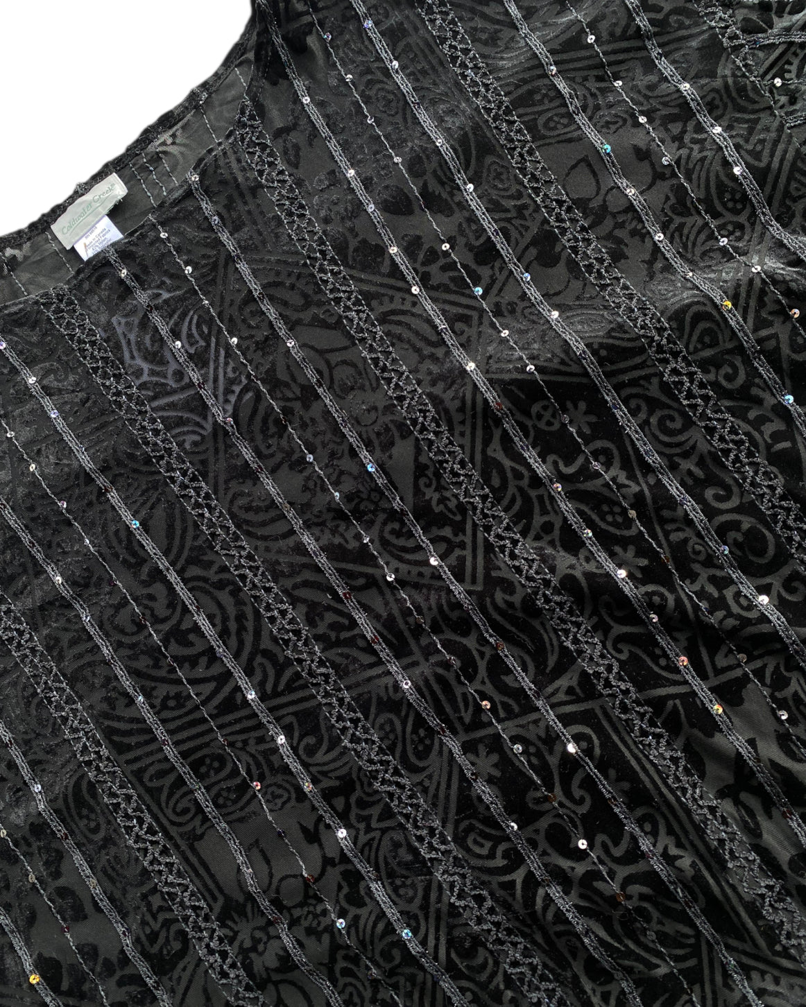 BLUSA NEGRA DE MANGA LARGA DE MESH CON PATRON EN TERCIOPELO DE FLORES Y LINEAS VERTICALES CON LENTEJUELAS PLATEADAS .43% NYLON 41% POLYESTER Y 16% SPANDEX. NO TIENE DETALLES, EN PERFECTO ESTADO.