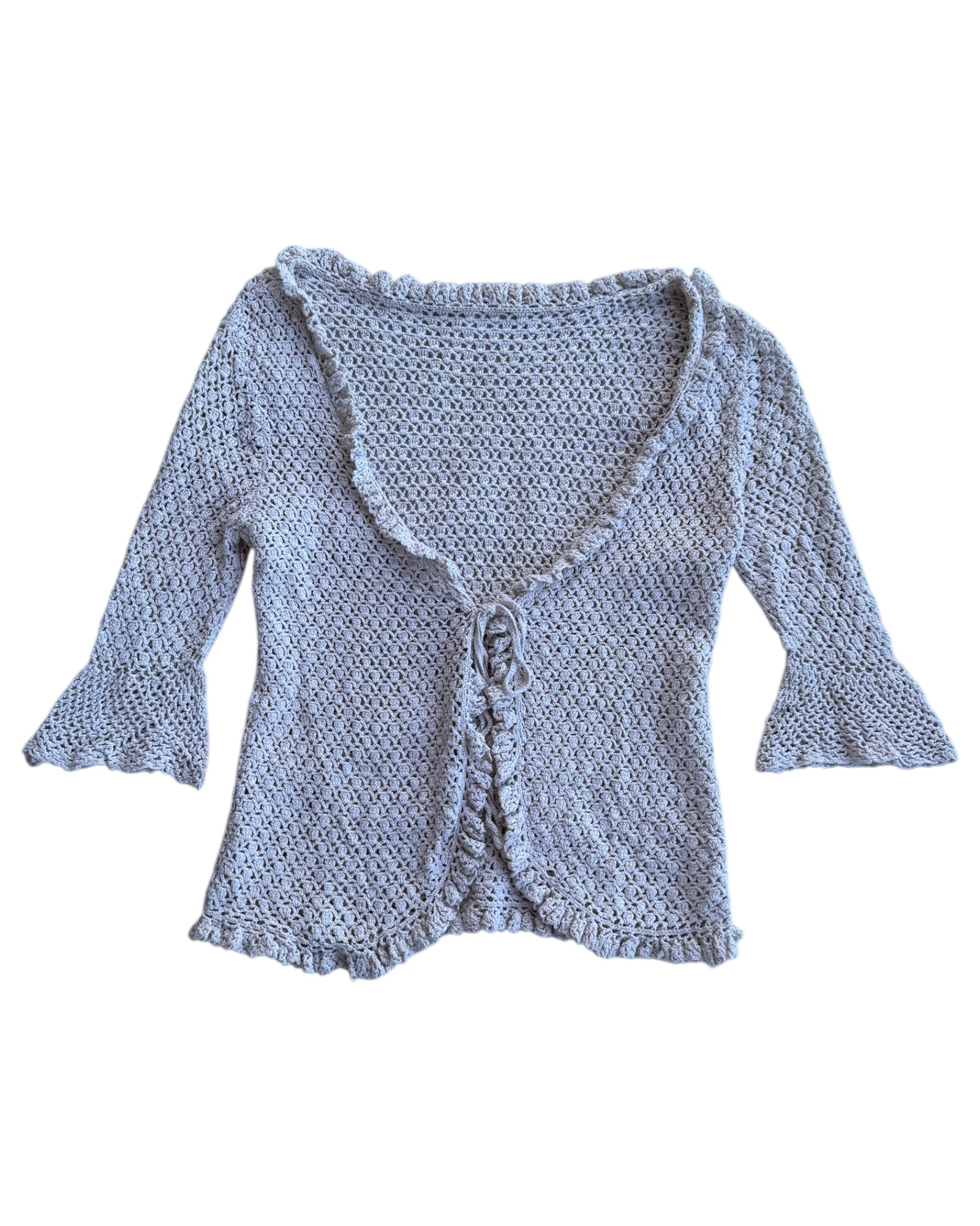 CARDIGAN EN COLOR HUESO DE CROCHET CON BORDES ESTILO LECHUGA, TIRA PARA AJUSTAR AL PECHO Y MANGAS TRES CUARTOS. NO TIENE DETALLES, EN PERFECTO ESTADO.