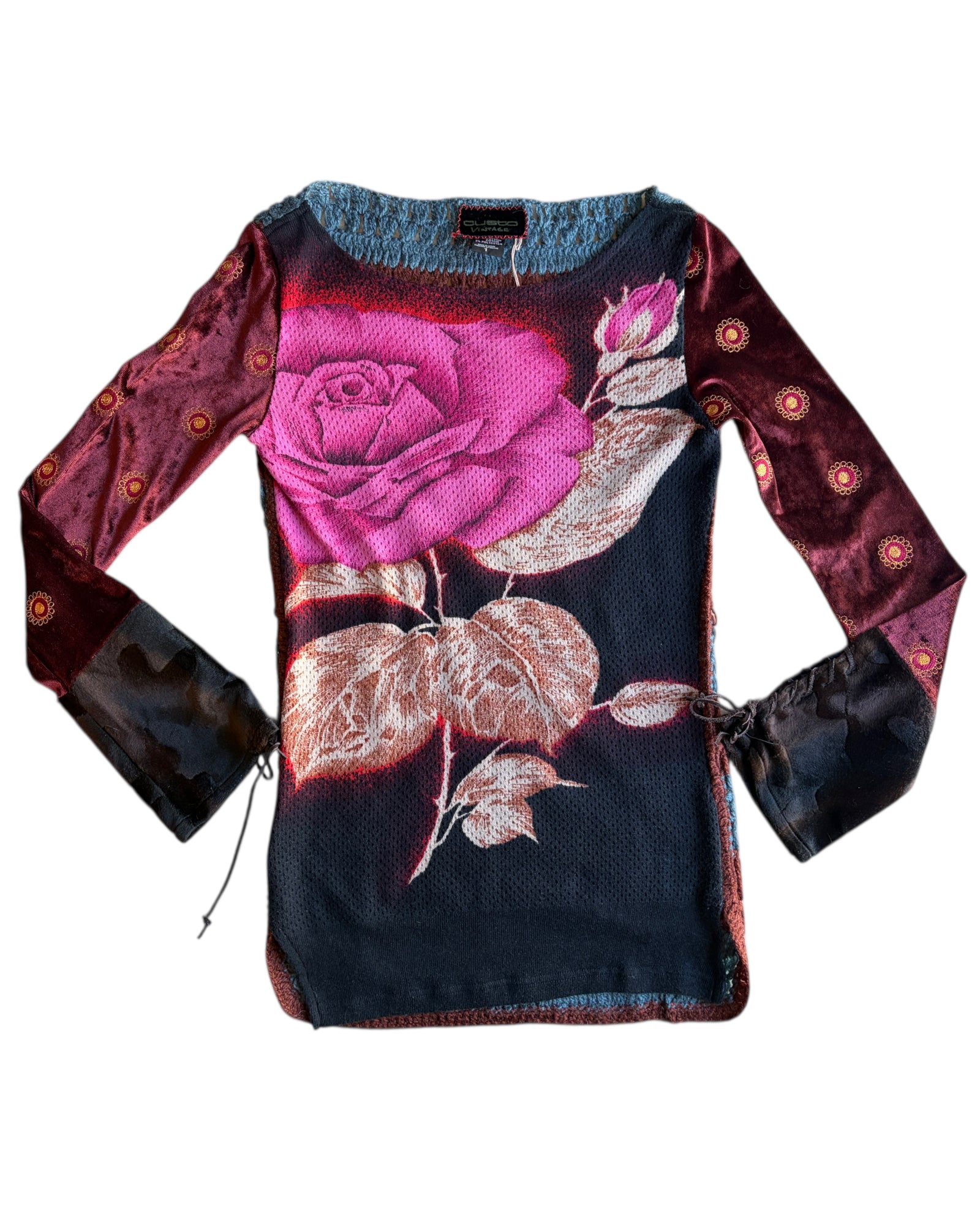 SUETER CUSTO 98% ALGODÓN Y 2% POLYESTER CON TEJIDO EN LA PARTE TRASERA Y MANGAS DE TERCIOPELO CON BORDADOS Y TIRAS DE PIEL EN LOS PUÑOS PARA AJUSTAR. EN EL FRENTE PRINT DE ROSA ESTILO 3D EN TELA DE PUNTO. NO TIENE DETALLES, EN PERFECTO ESTADO.