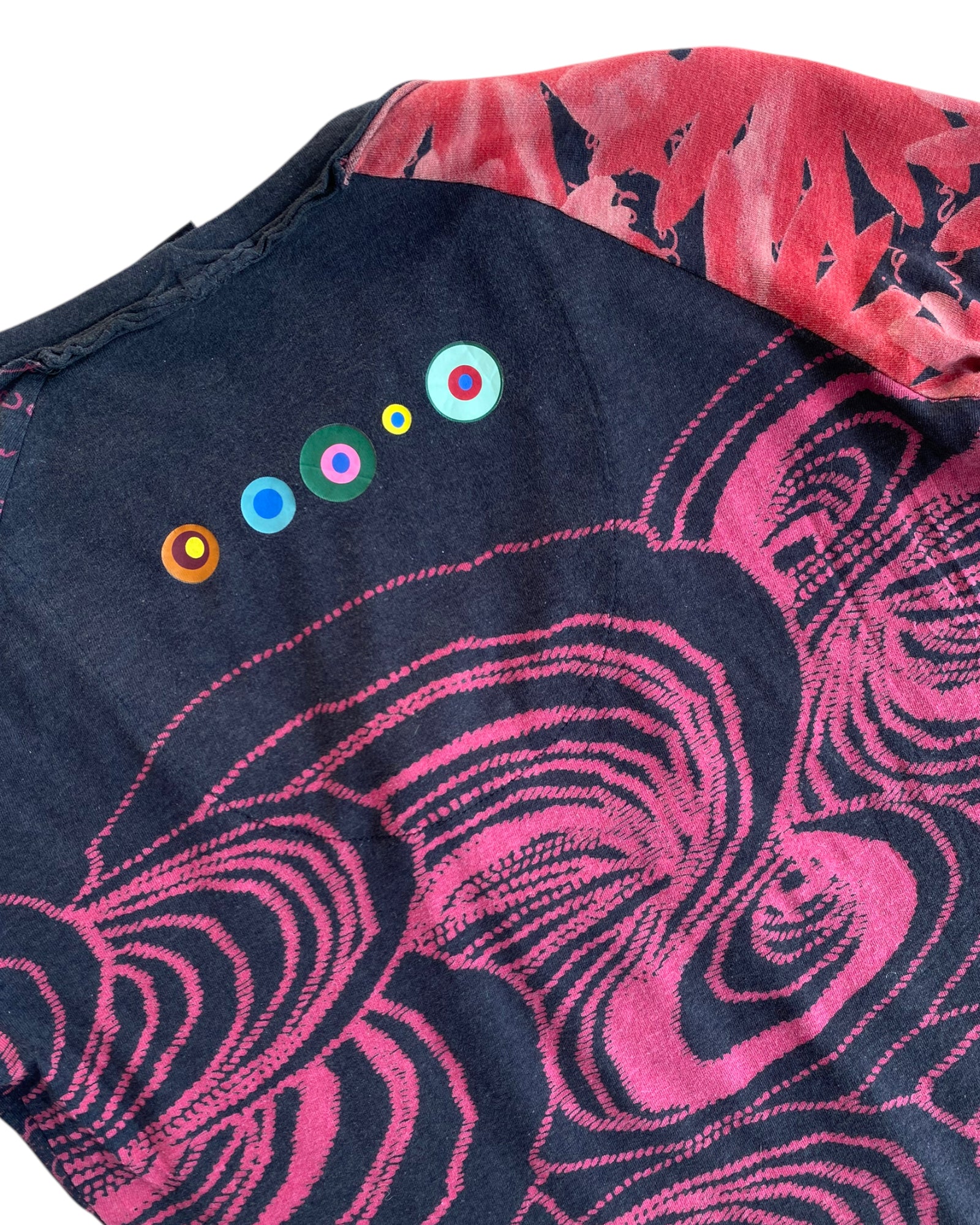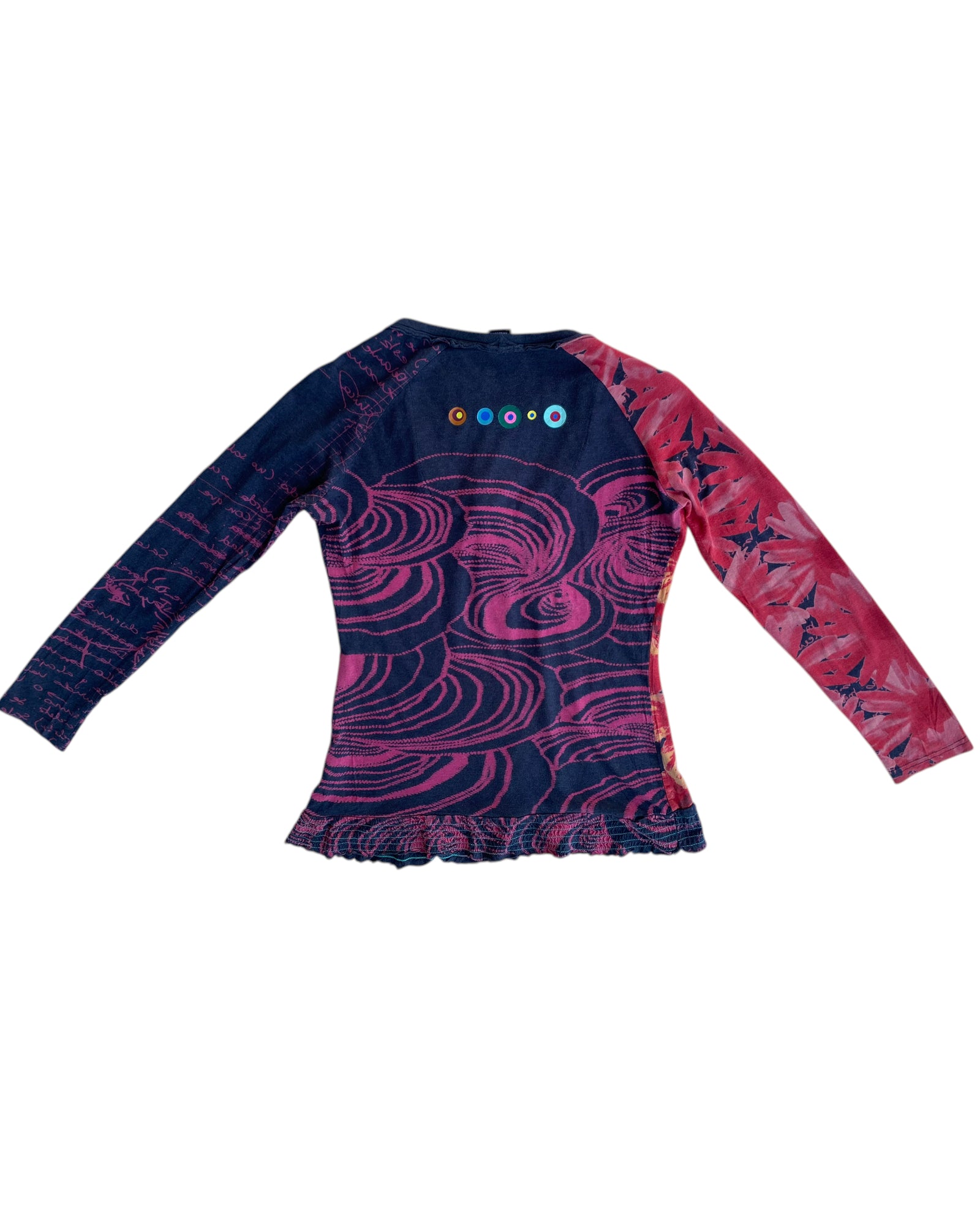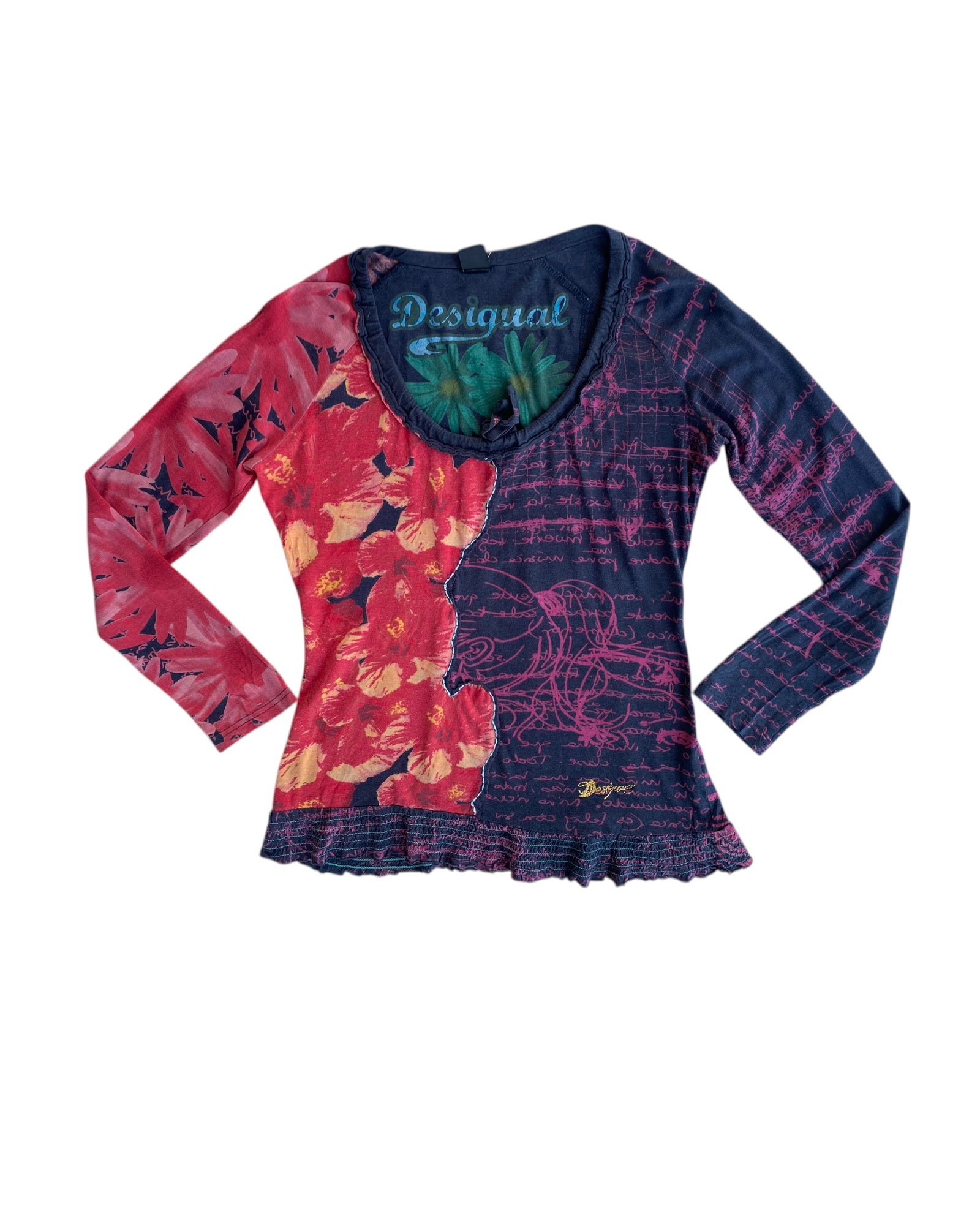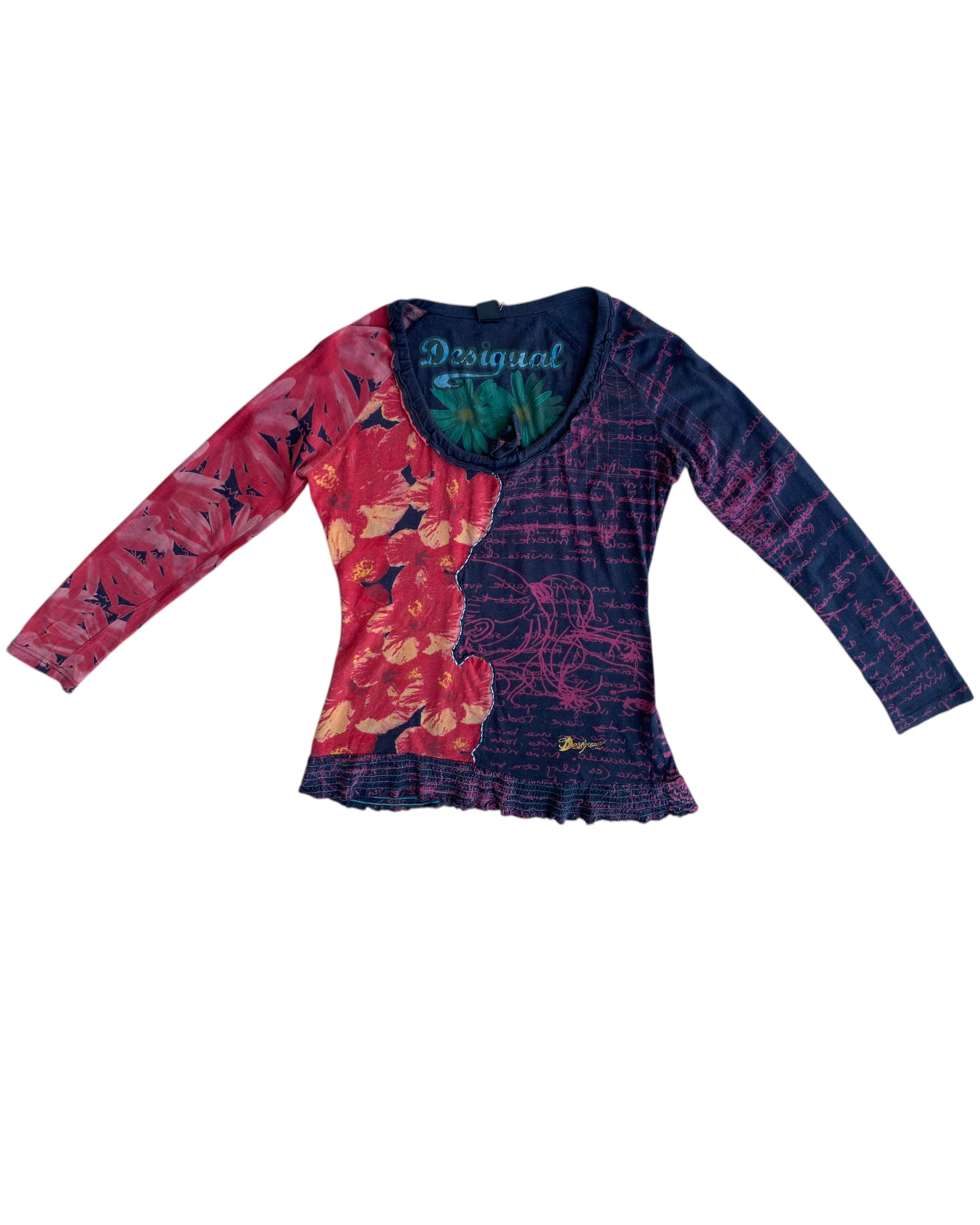 PLAYERA MANGA LARGA CON PRINT DOBLE EN UN LADO DE FLORES ROJAS Y EL OTRO LADO LETRAS Y SCRIPT EN COLOR ROSA. POR DETRAS PRINT DE ESPIRALES ROSAS, LISTON PEQUEÑO EN EL PECHO COMO DE ADORNO, 50% ALGODÓN Y 50% VISCOSA. PERFECTO ESTADO