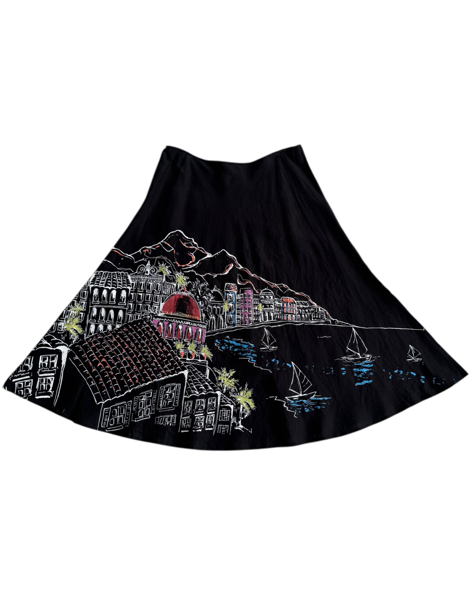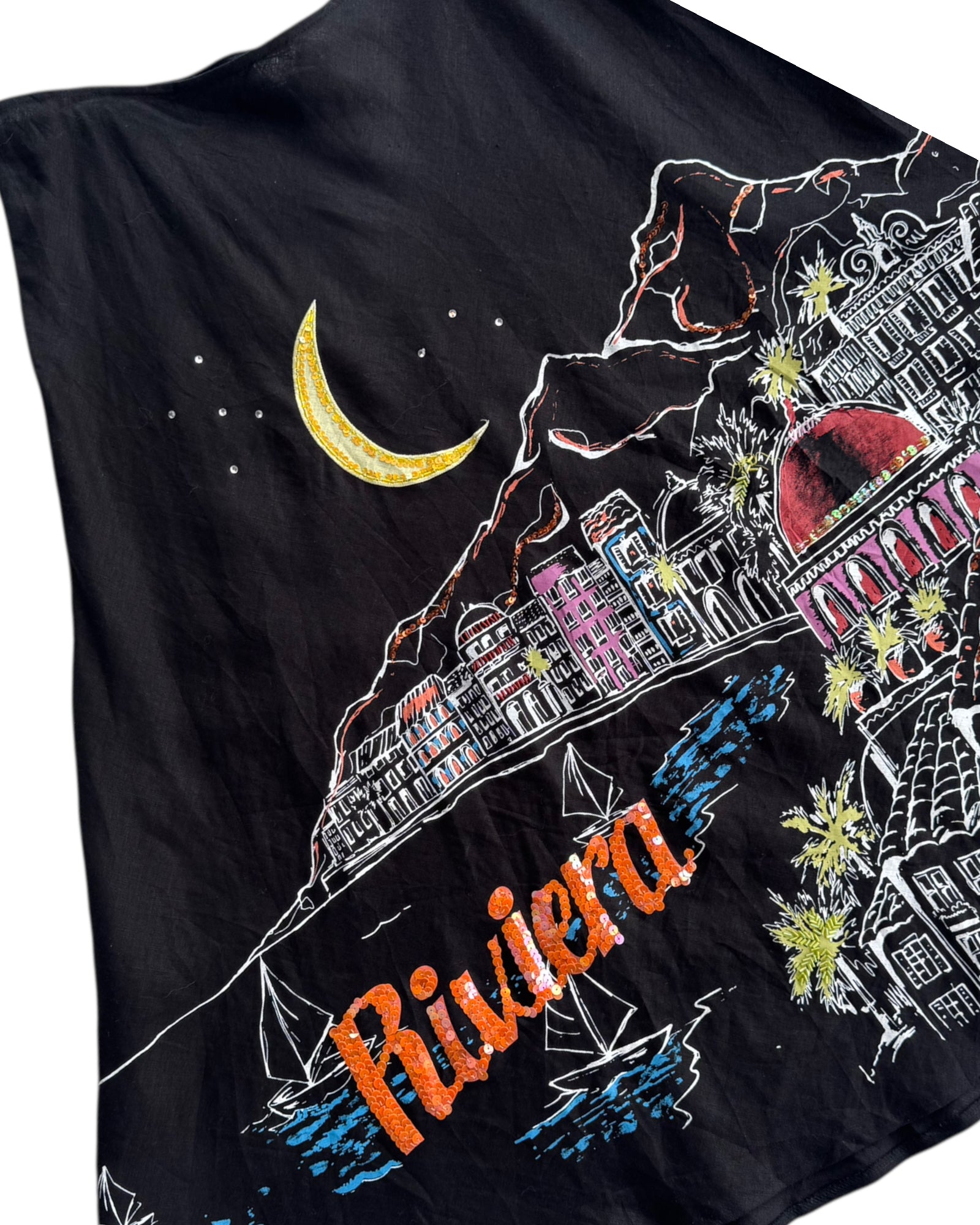 FALDA NEGRA MAXI 100% LINO CON PRINT DE CIUDAD, MONTAÑAS Y UNA LUNA, LENTEJUELAS EN VARIAS PARTES DEL PRINT PARA DAR TEXTURA Y LETRAS CON LENTEJUELAS NARANJAS DE "RIVIERA", TIENE LIGEROS DETALLES EN LAS LENTEJUELAS
