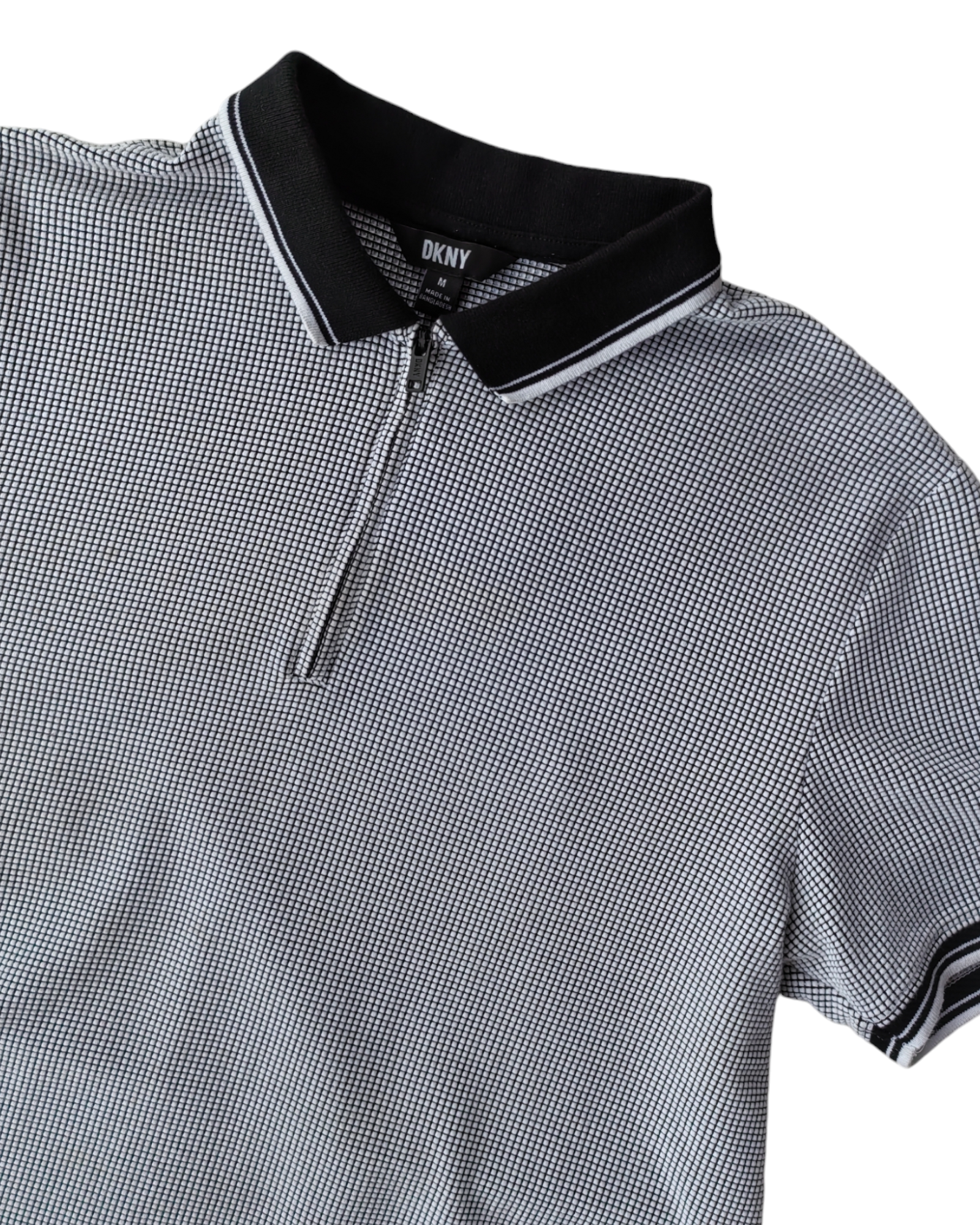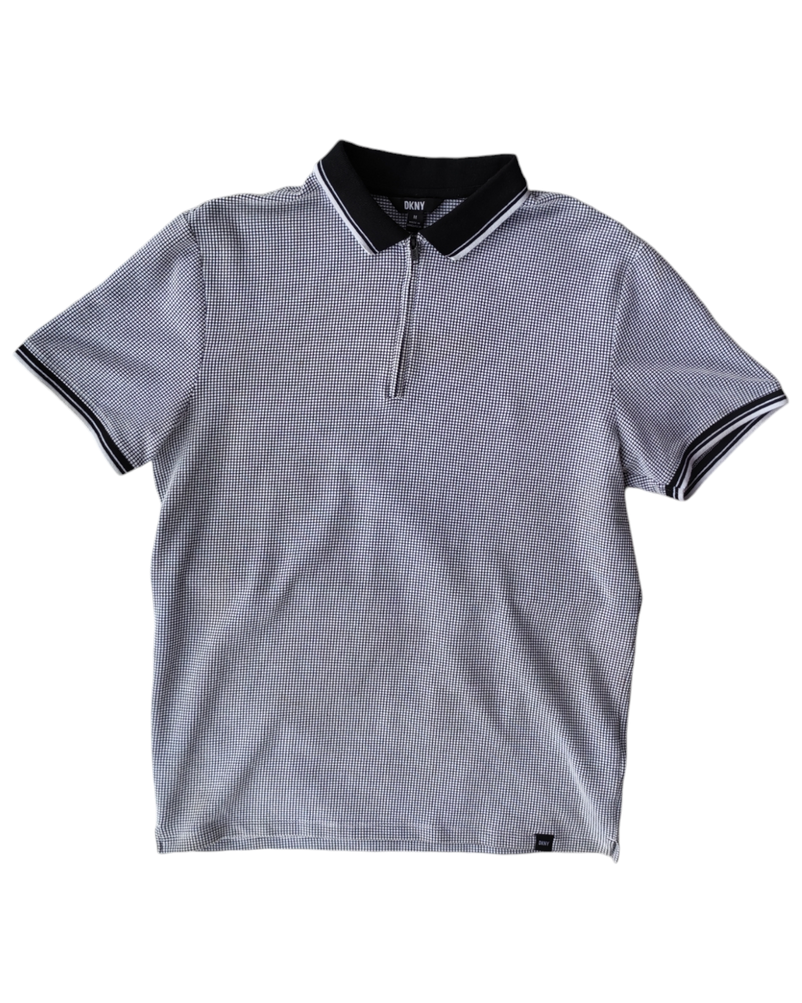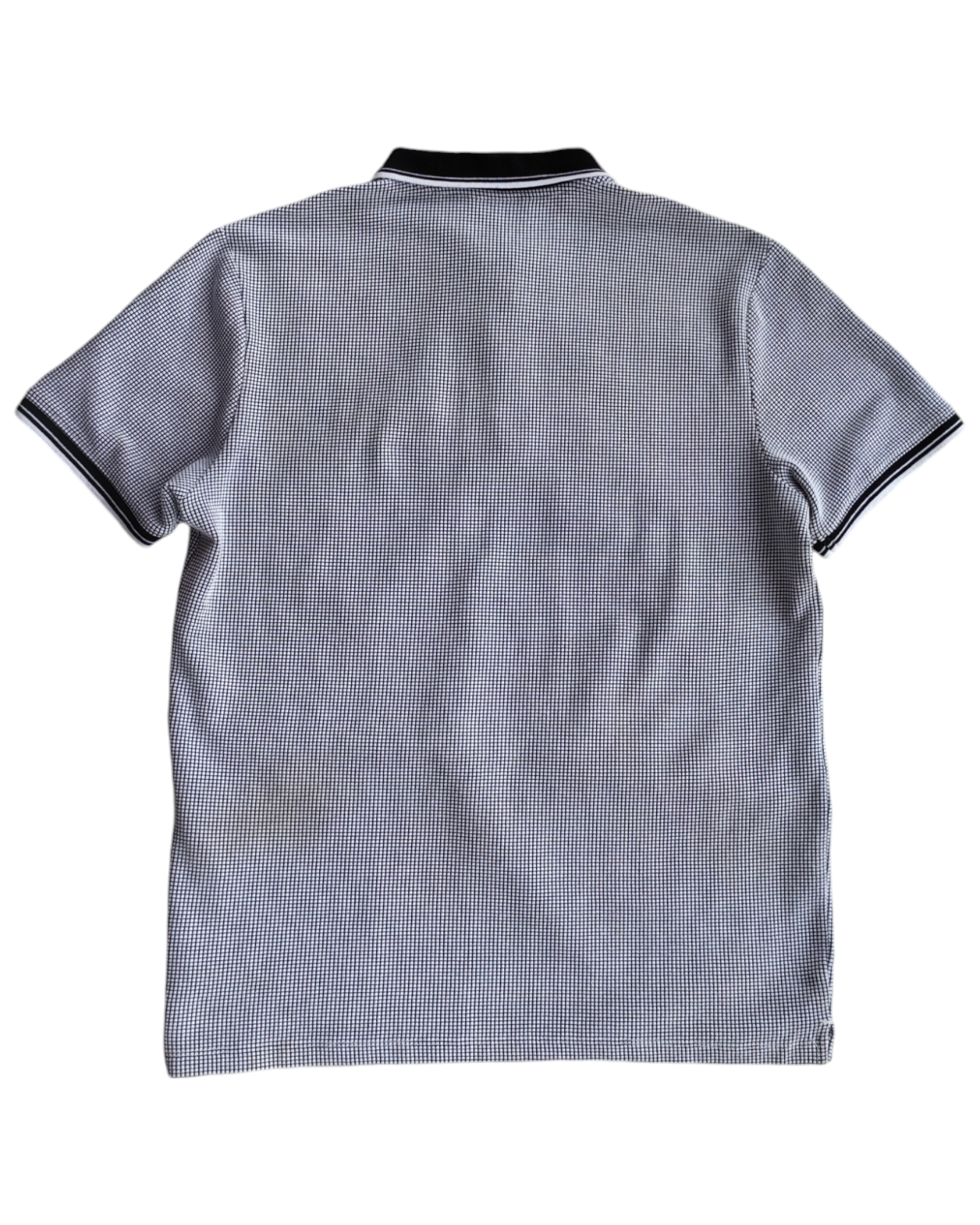 CAMISA TIPO POLO CON TEXTURA DE CUADROS Y CUELLO Y MANGAS TEJIDO BLANCO Y AZUL MARINO. CIERRE EN LA PARTE DEL PECHO. SIN DETALLES DE USO.