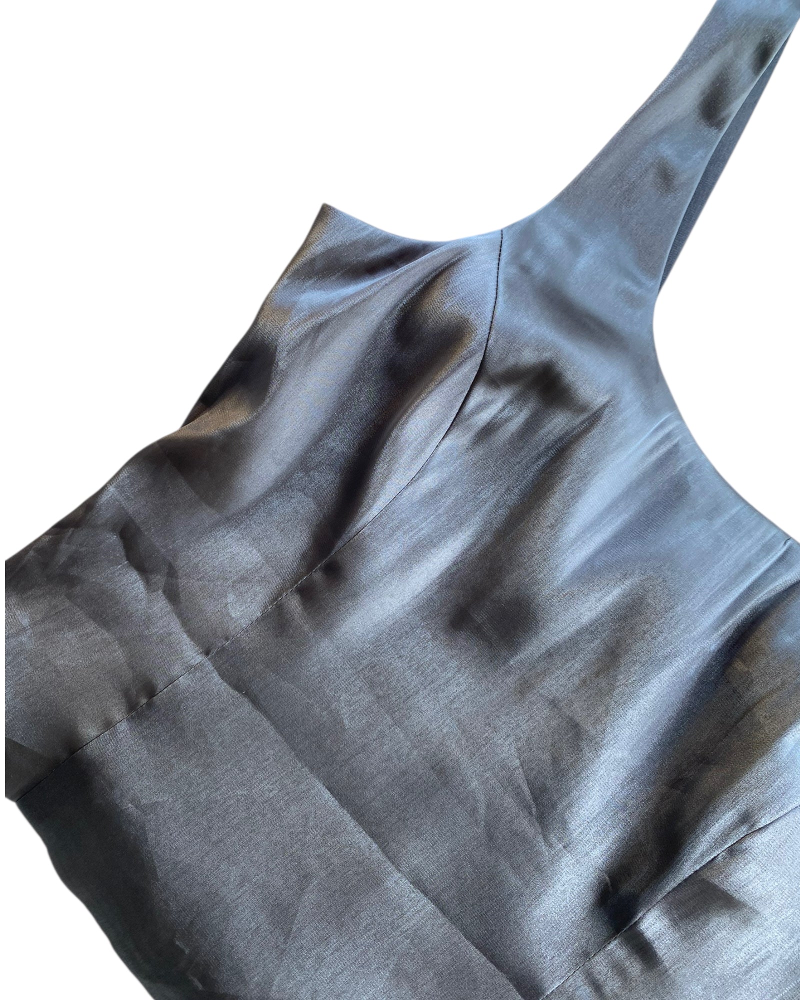 TOP CON PINZAS Y TIRANTES MEDIANOS SIN AJUSTAR A LA MEDIDA, COLOR GRIS DE TELA BRILLANTE Y CON CIERRE EN LA PARTE TRASERA. 67% POLYESTER, 23% NYLON Y 10% SPANDEX. NO TIENE DETALLES, EN PERFECTO ESTADO.