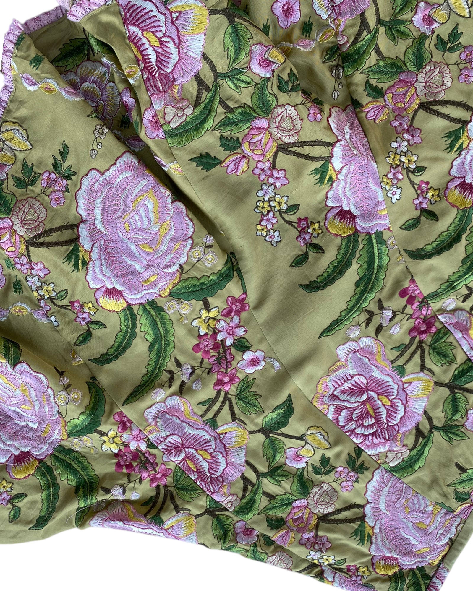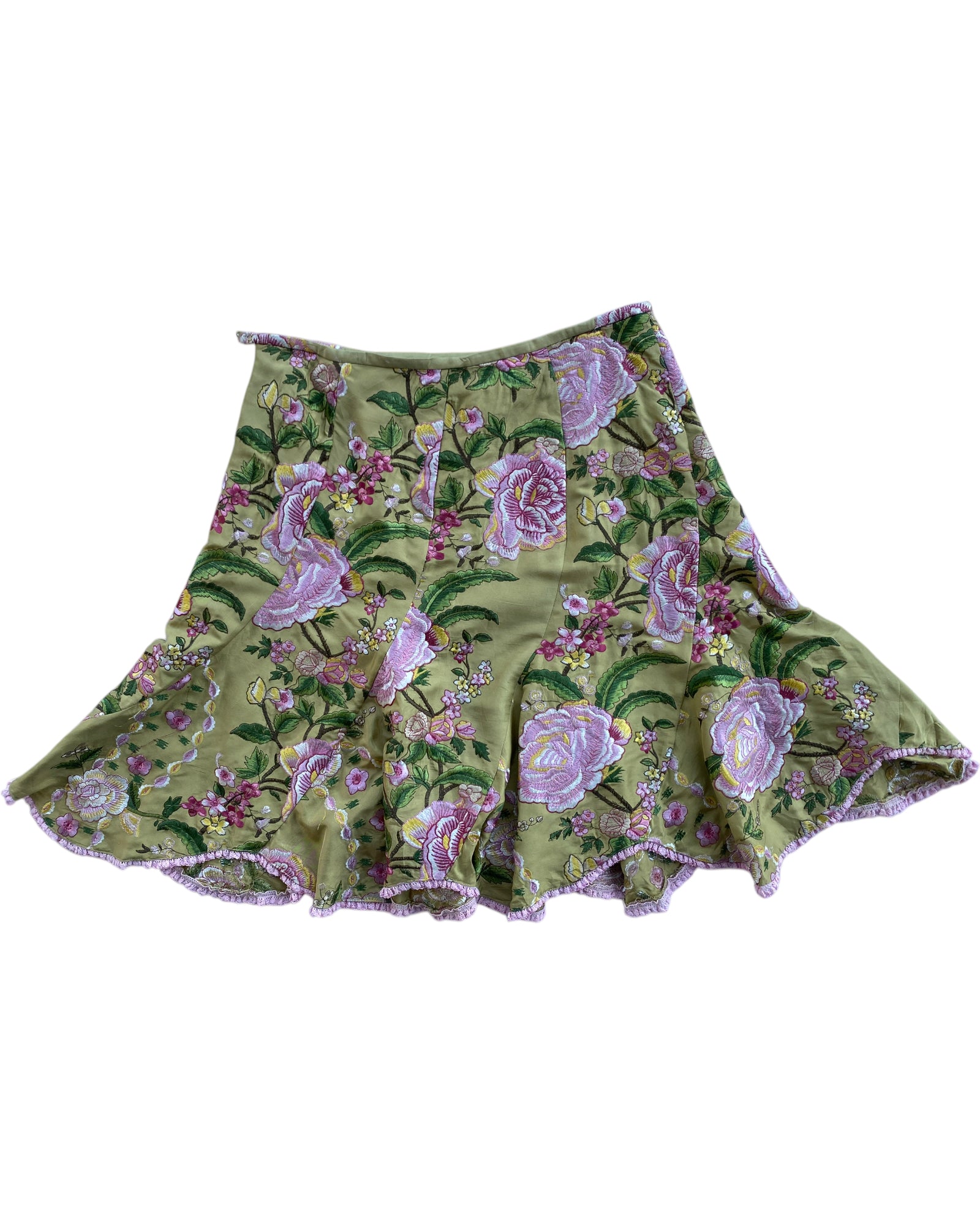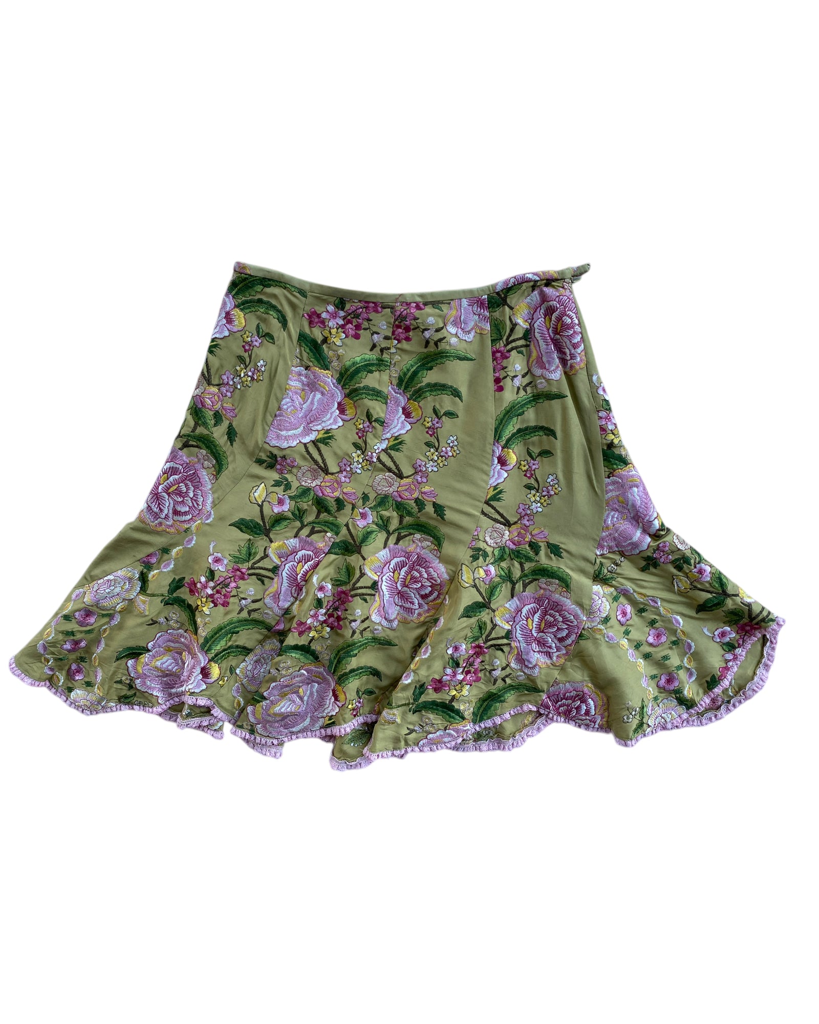 FALDA VERDE CON FLORES BORDADAS POR TODOS LADOS EN COLOR ROSA Y HOJAS VERDES. CIERRE DE LADO. NO STRETCH, 100% SEDA, MUY SUAVE. NO TIENE DETALLES DE USO.